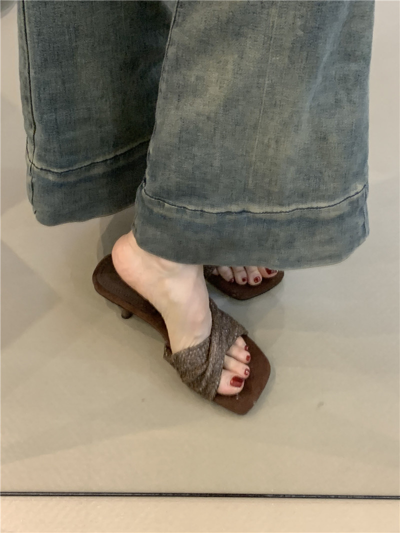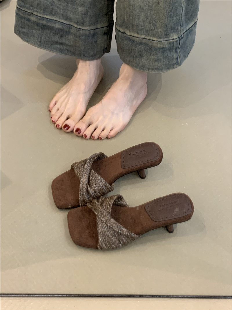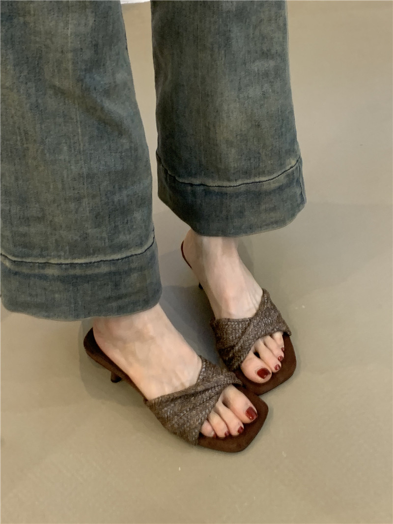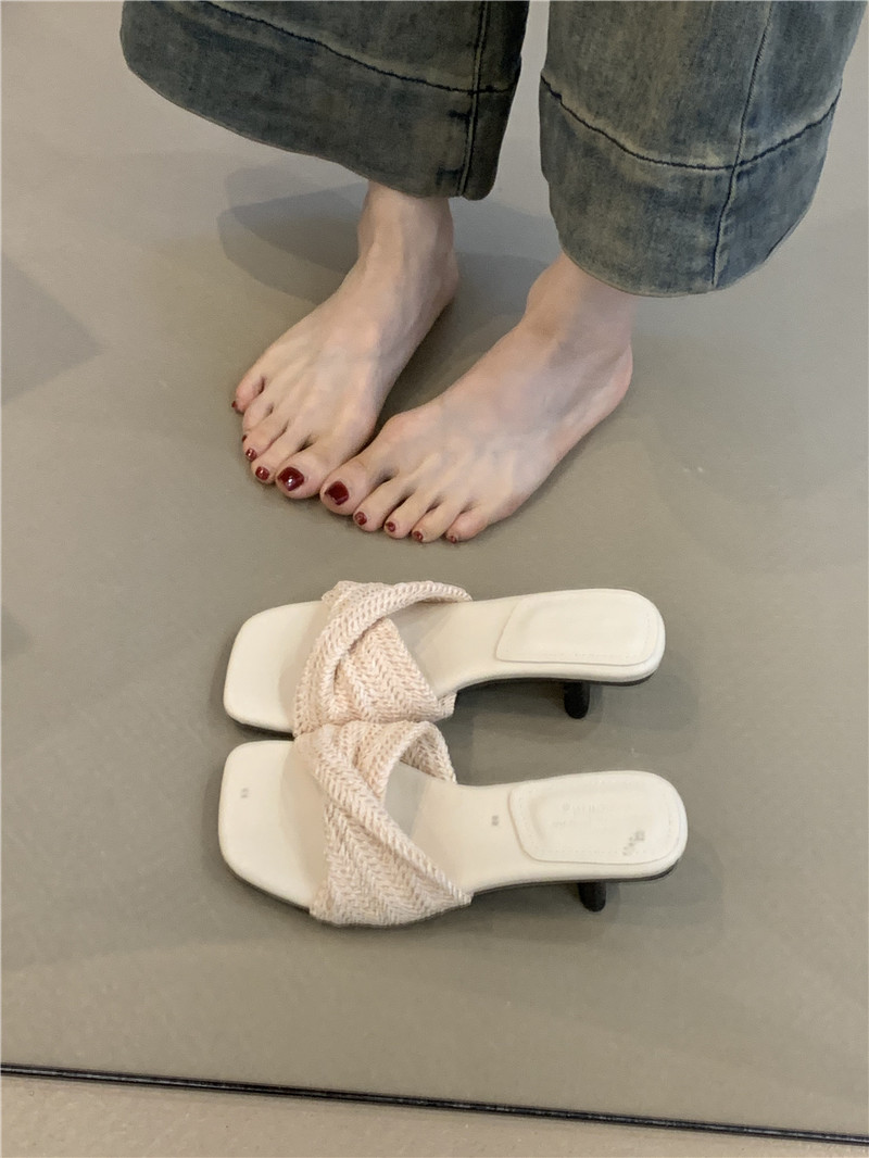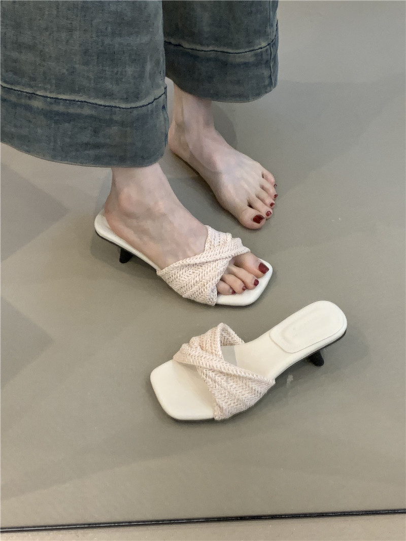 여성을 위한 디자인 밀짚 직조 원 스트랩 샌들 2025 여름 트위스트 스퀘어 토 두꺼운 굽 하이힐 샌들