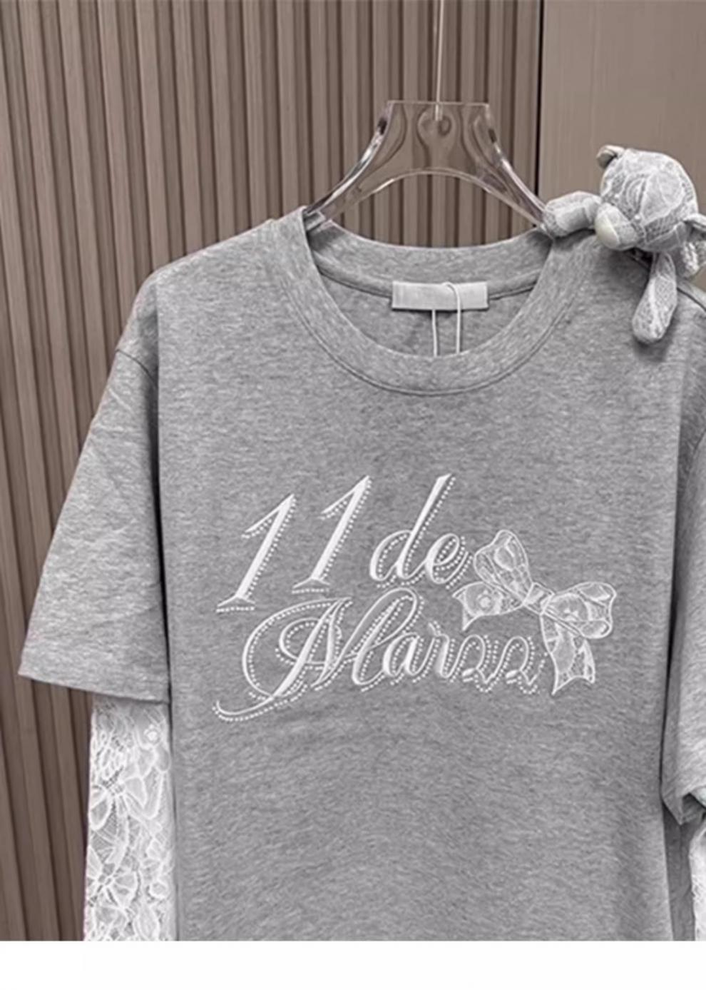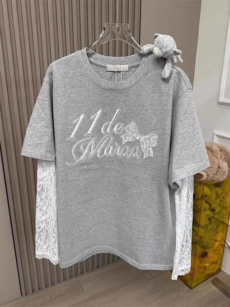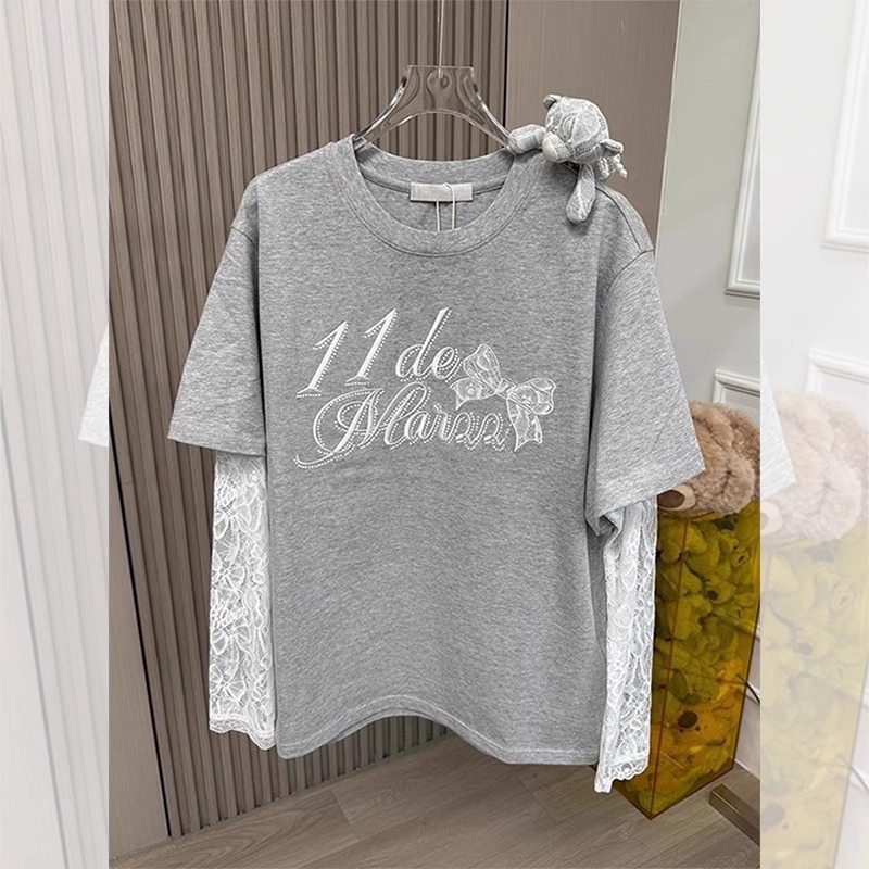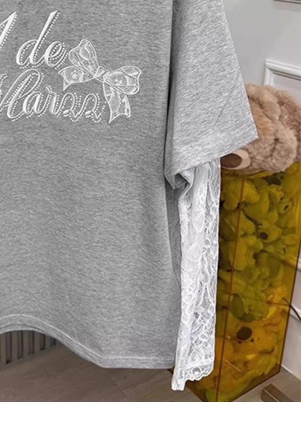 2025 핫 스타일 여성용 그레이 레이스 스플 라이스 자수 라운드 넥 티셔츠 여성용 디자인 틈새 루즈 숄더 탑스토어 가기