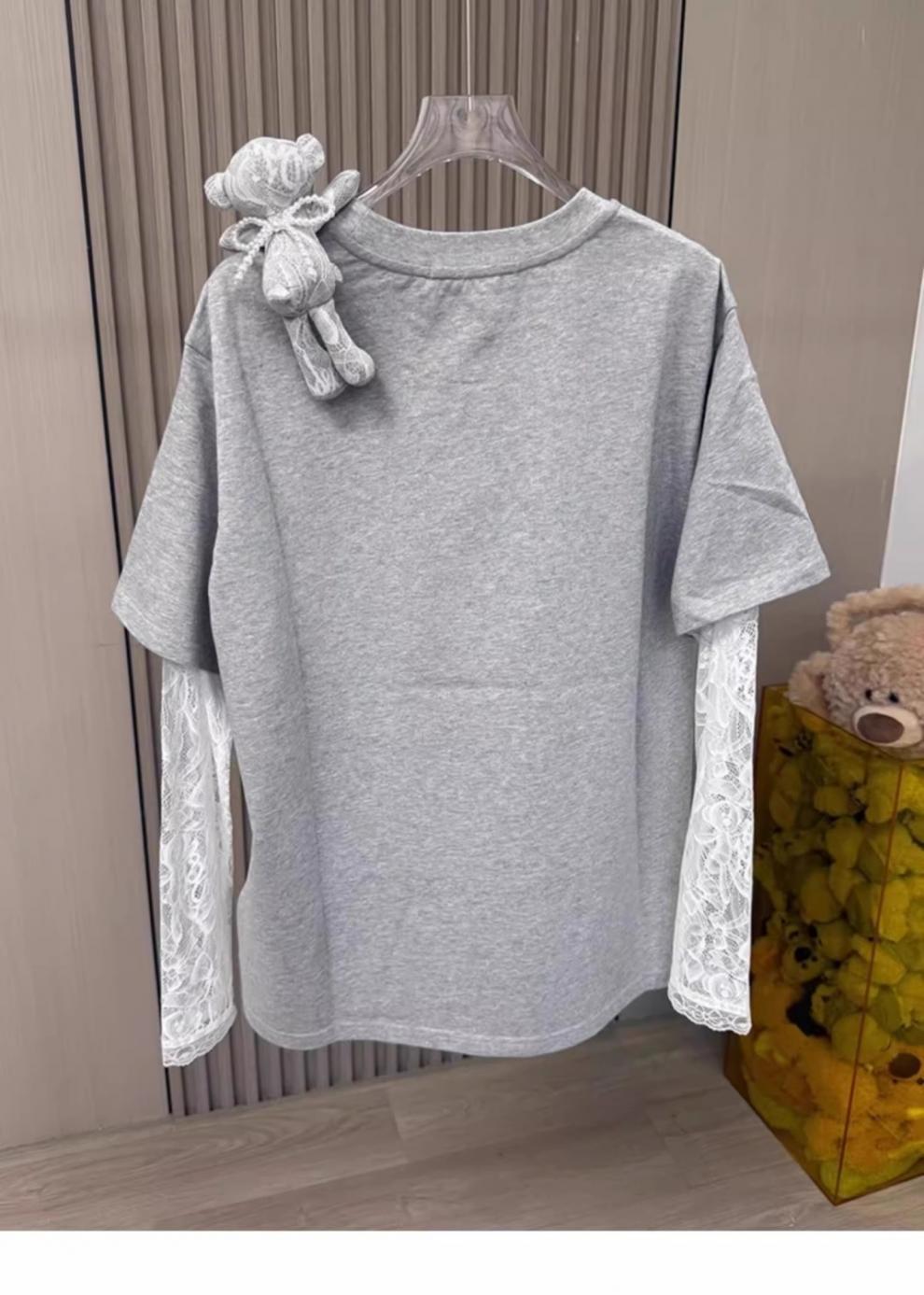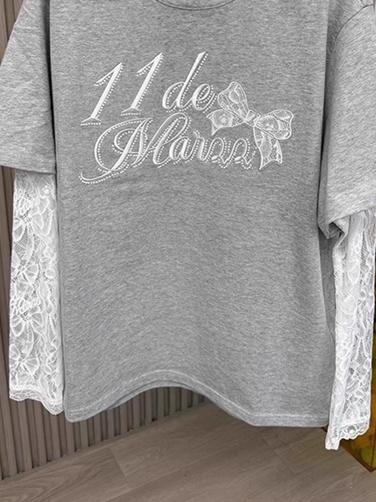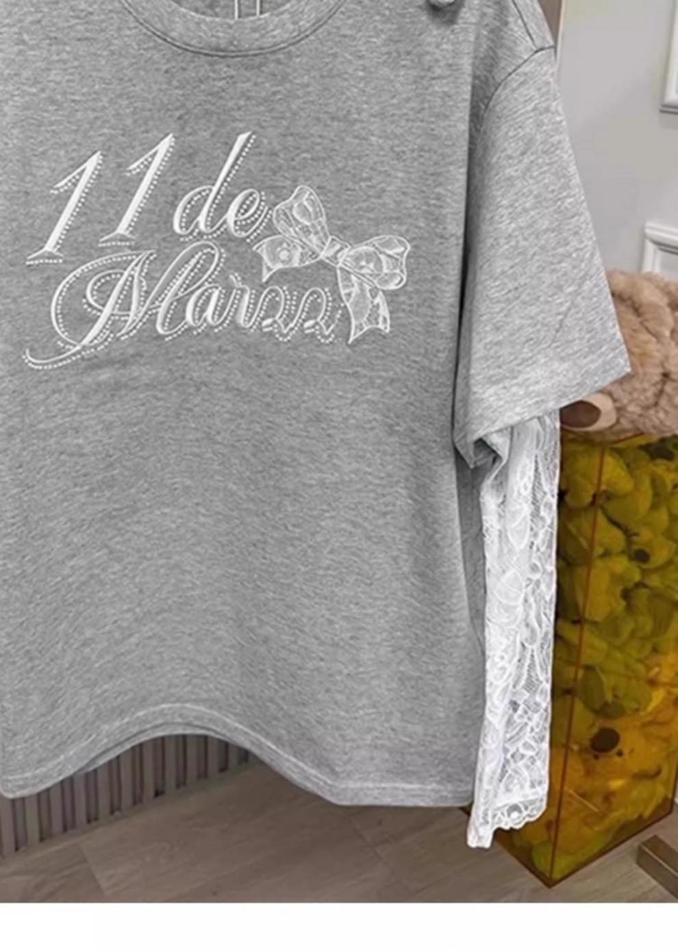 2025 핫 스타일 여성용 그레이 레이스 스플 라이스 자수 라운드 넥 티셔츠 여성용 디자인 틈새 루즈 숄더 탑스토어 가기