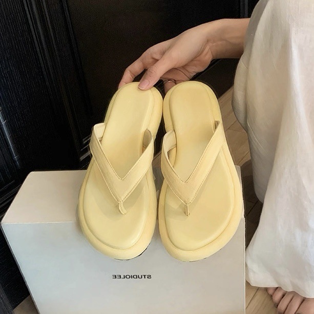 Guojia 여름 신상 소가죽 버전 ~ 부드럽고 밀랍 같은 느낌의 둥근 발가락과 작은 두꺼운 밑창의 여성용 비치 슬리퍼