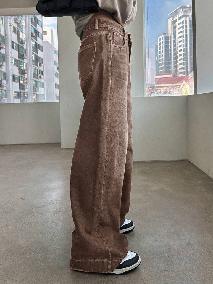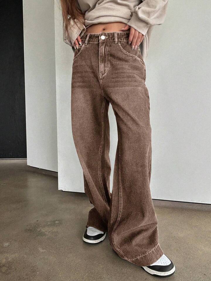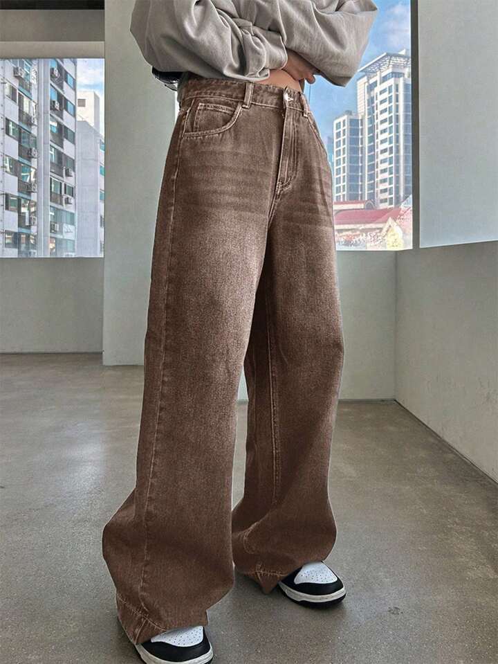 여성용 하이웨이스트 스트레이트 브라운 워싱 청바지, 레트로 루즈 아메리칸 그라데이션 브라운 팬츠 바이브 와이드 팬츠스토어 가기