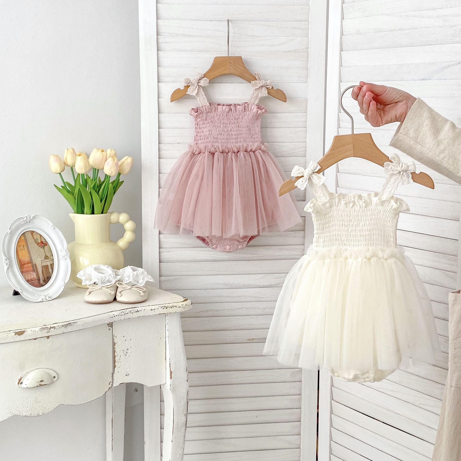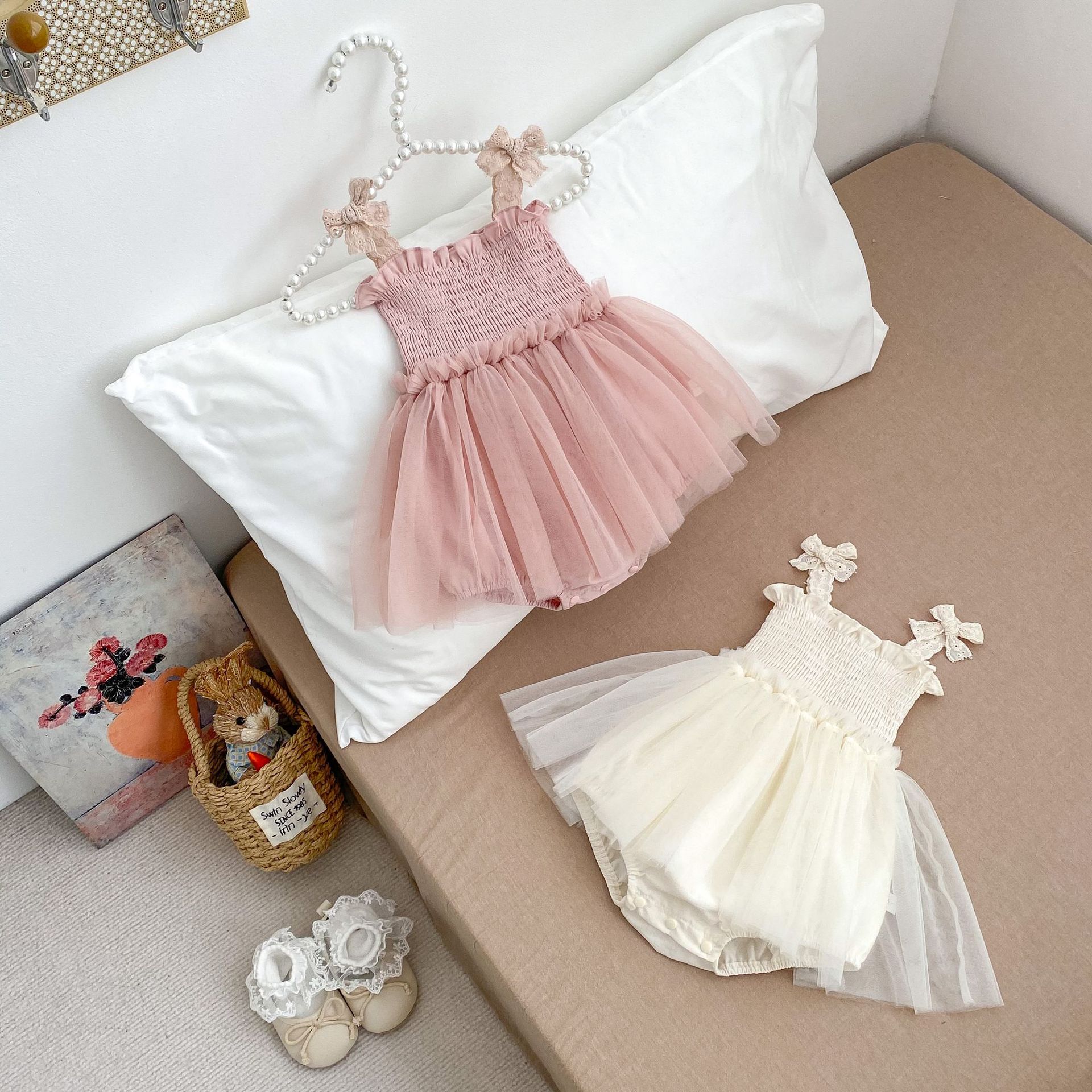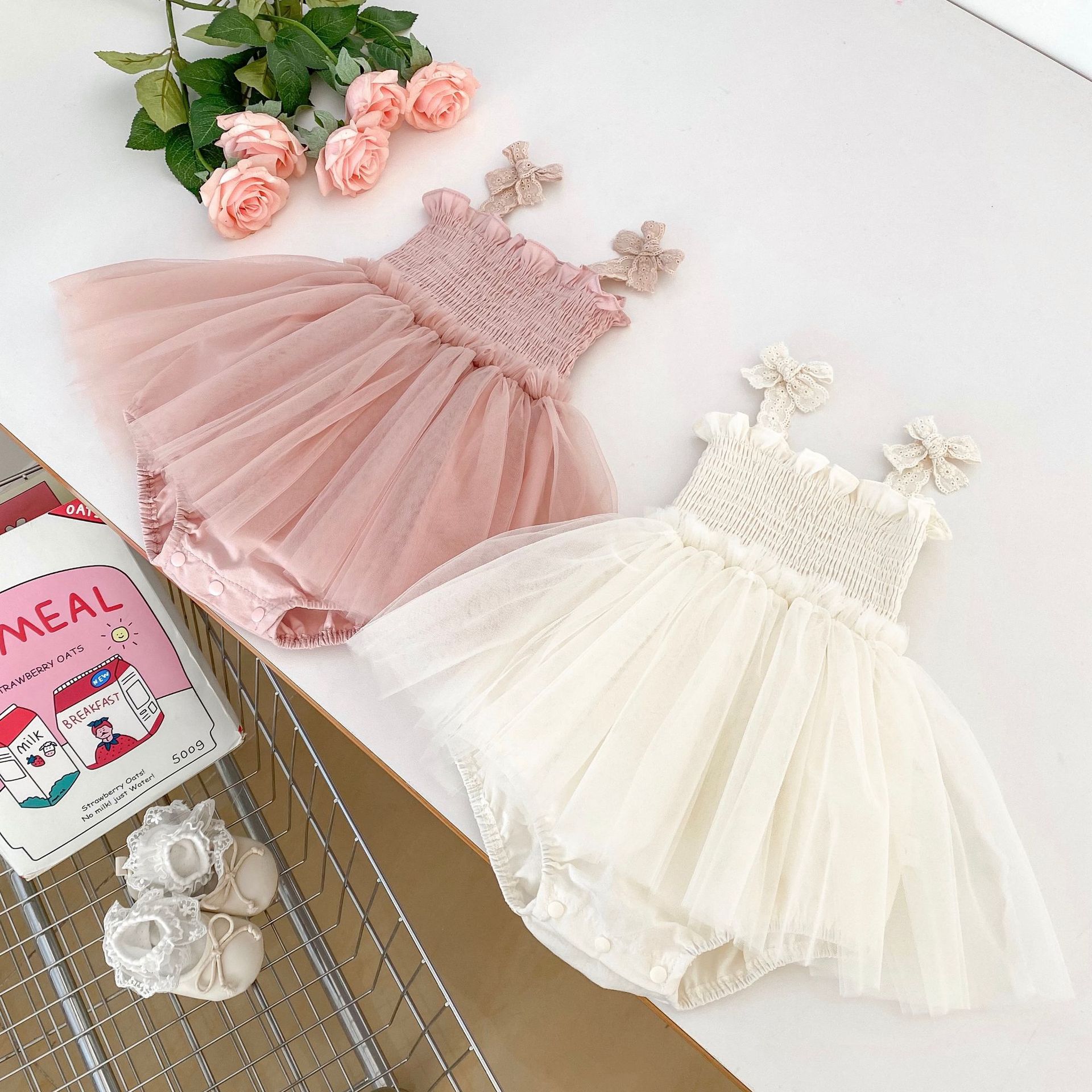 Ins 한국어 버전 베이비 거즈 스커트 베이비 가운 소녀 점프 슈트 서스펜더 메쉬 드레스 레이스 공주 스커트스토어 가기