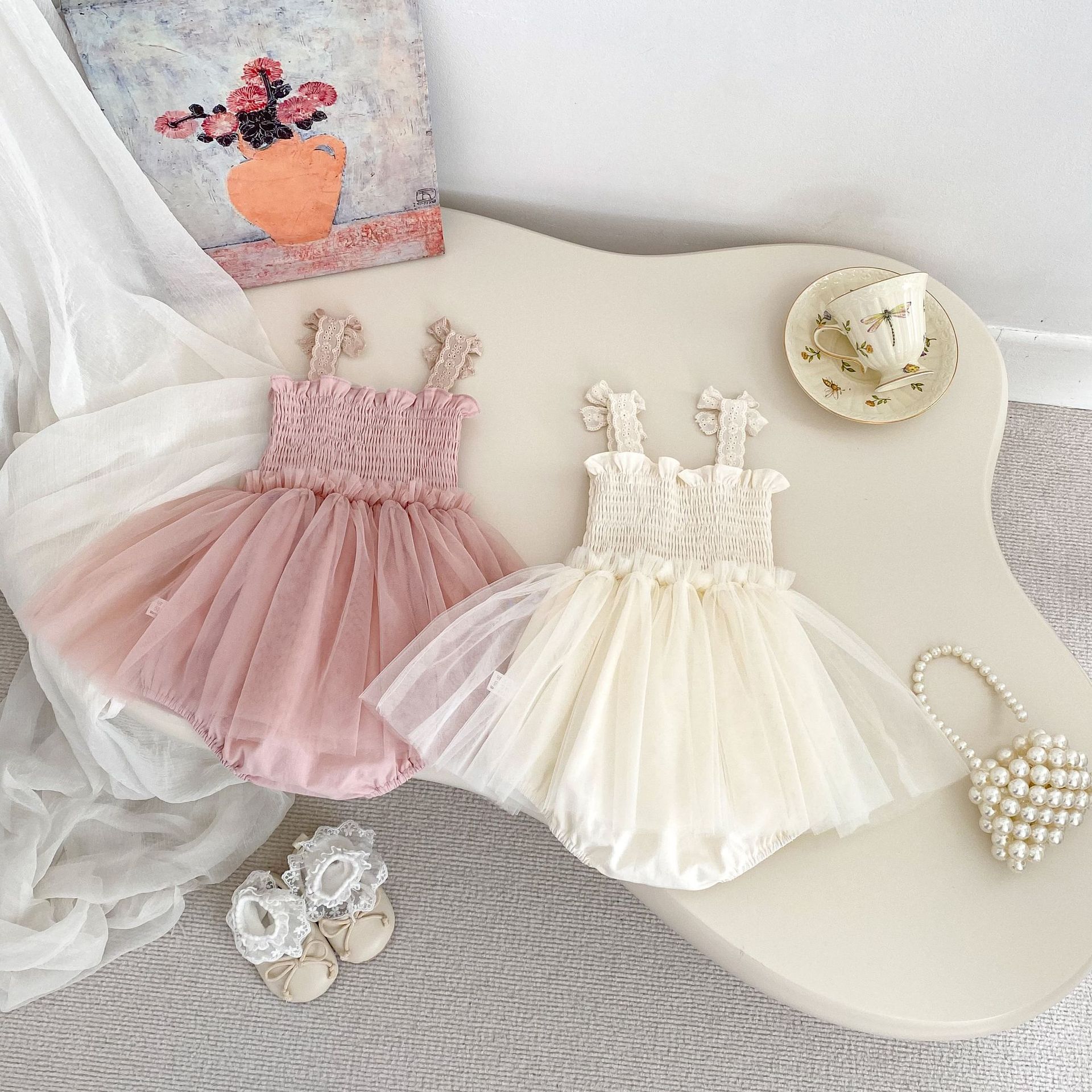 Ins 한국어 버전 베이비 거즈 스커트 베이비 가운 소녀 점프 슈트 서스펜더 메쉬 드레스 레이스 공주 스커트