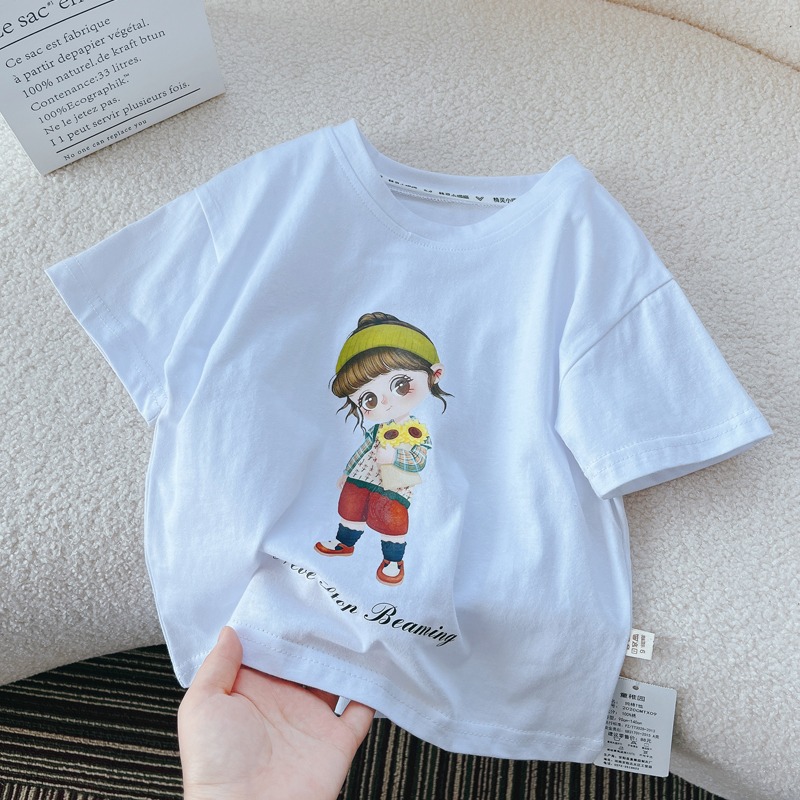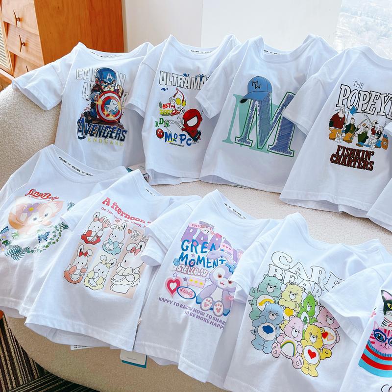 만화 t 반팔 어린이 귀여운 중간 소녀 2025 여름 반팔 탑 흰색 티셔츠 순수 코튼 베이비 보이스토어 가기