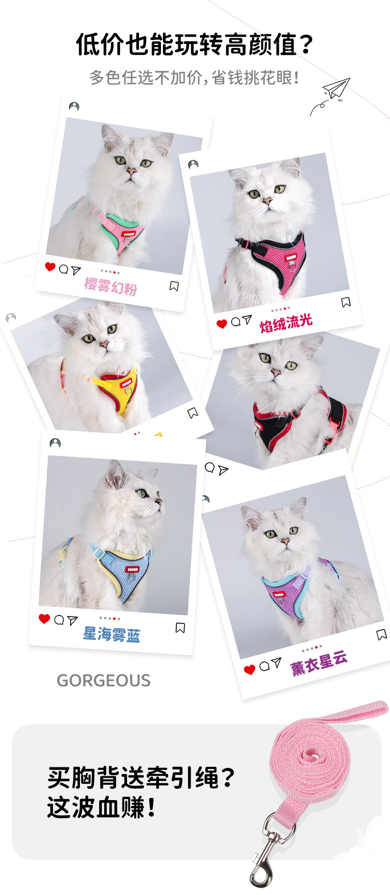 국경을 넘는 클래식 대비 색상 업그레이드된 애완 동물 견인 로프 이중층 메쉬 부드럽고 편안하며 걸이 가능한 유명 브랜드 고양이 견인 로프스토어 가기