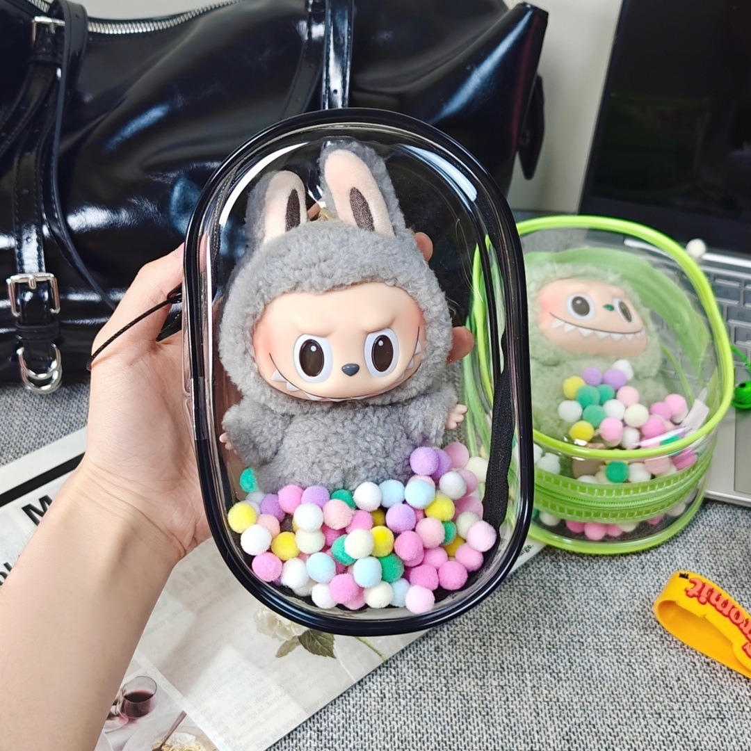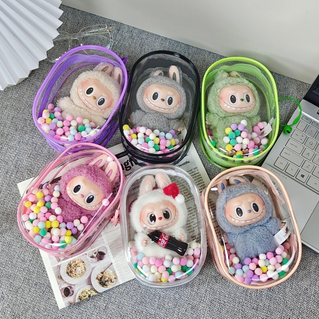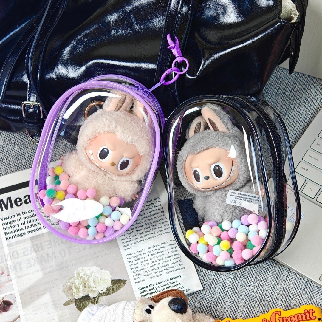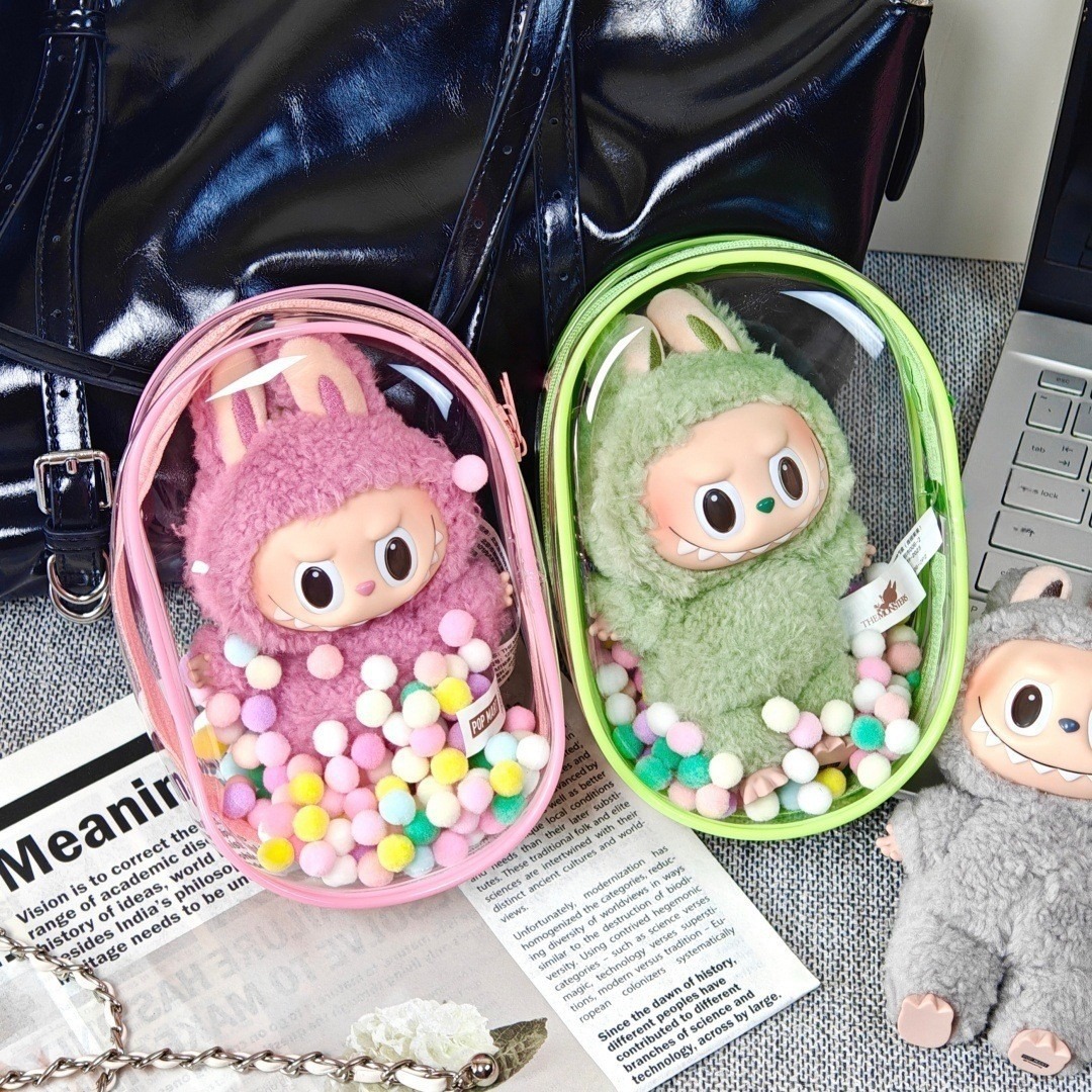 Labubu 보호 쉘 Labubu 투명 아기 산책 가방 해피 커버 귀여운 파티 코튼 인형 보관 가방 두꺼운