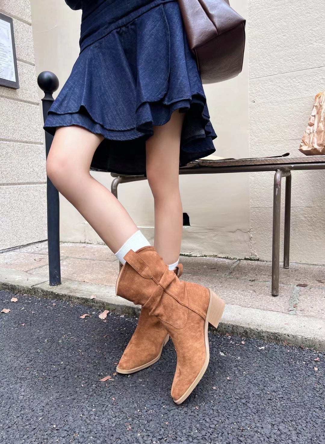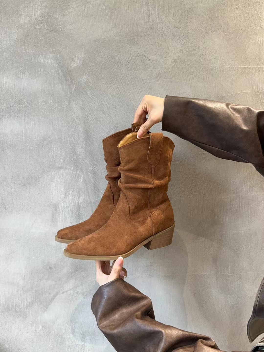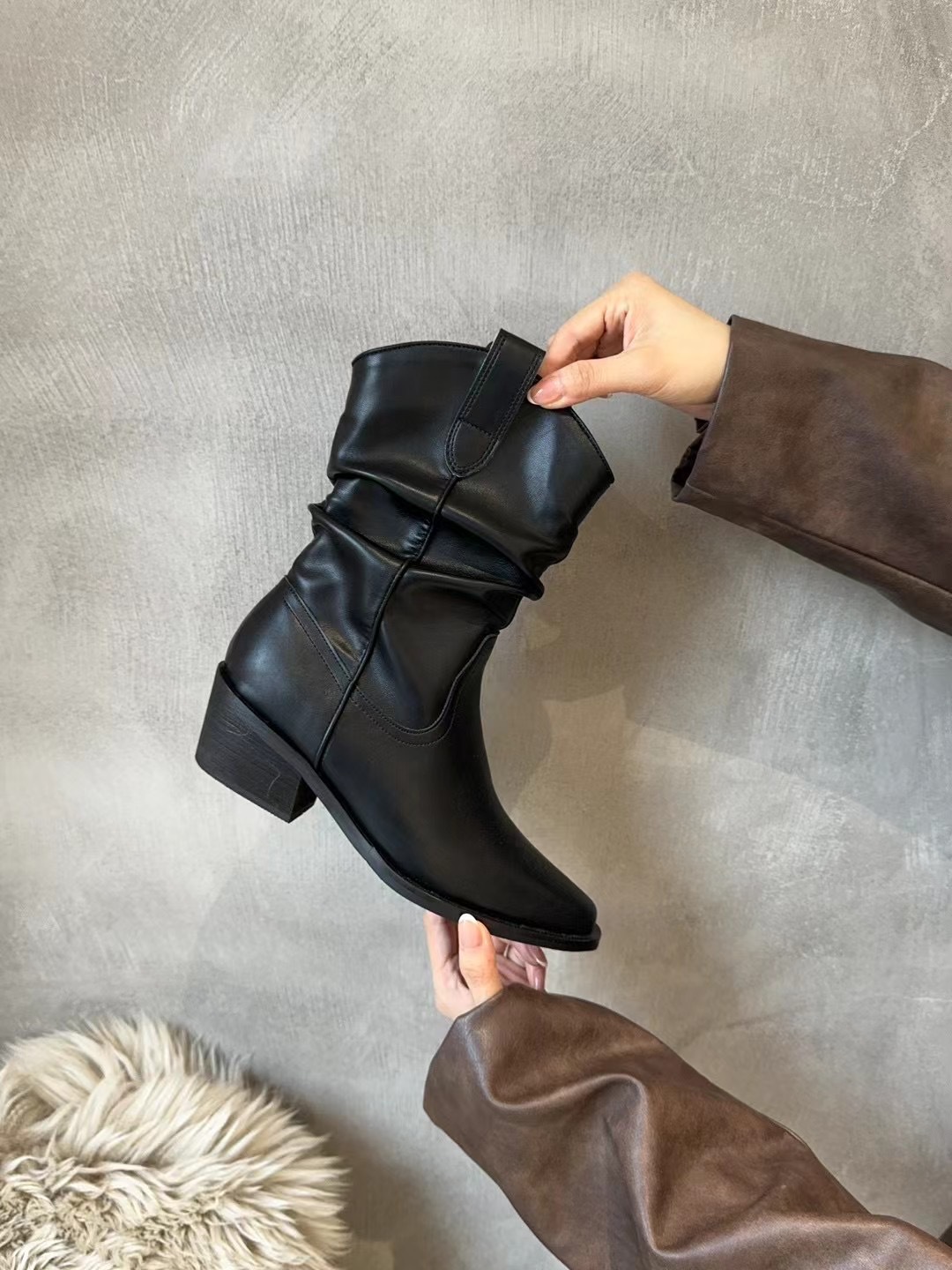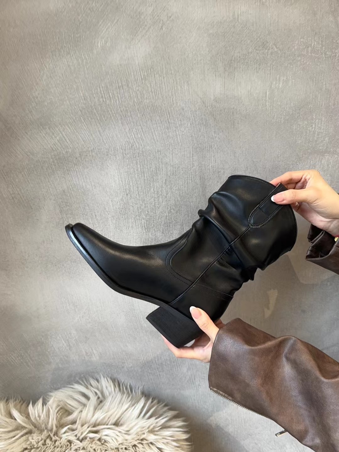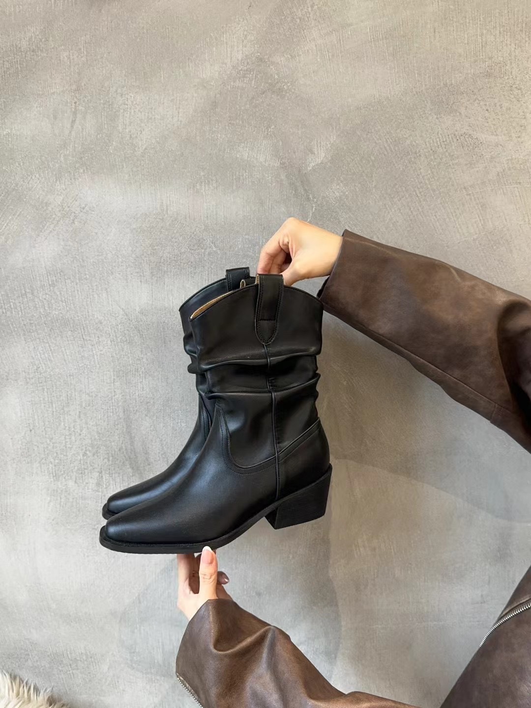 두꺼운 굽의 뾰족한 발가락 미드 부츠 주름진 힙 부츠 여성 2025 가을 겨울 새로운 스타일 복고풍 다용도 짧은 부츠 여성 마틴 부츠스토어 가기