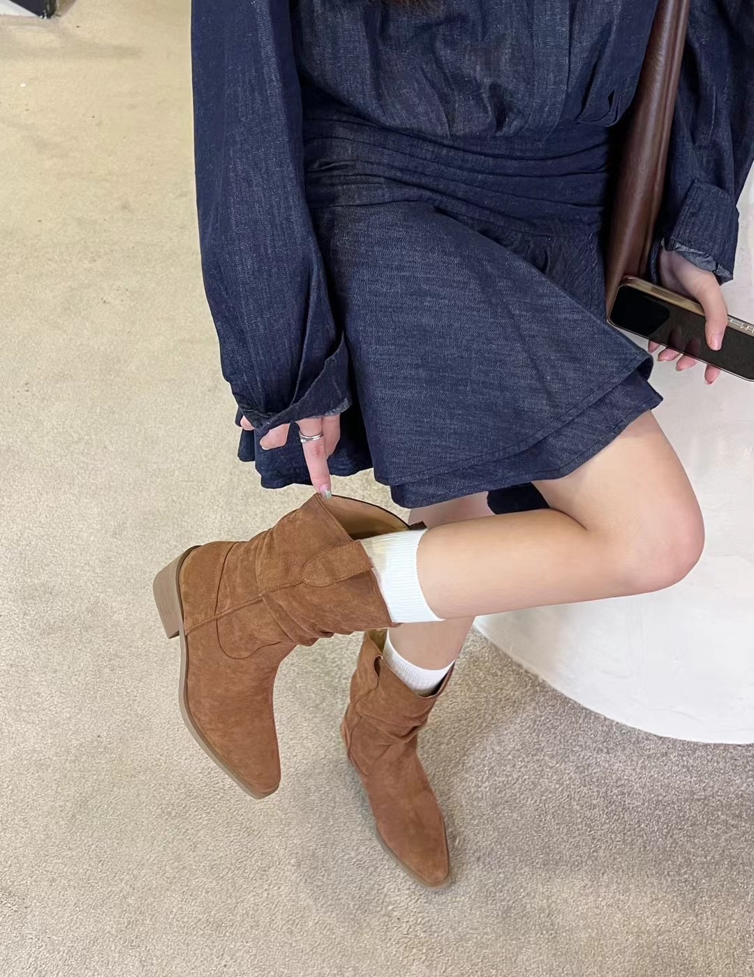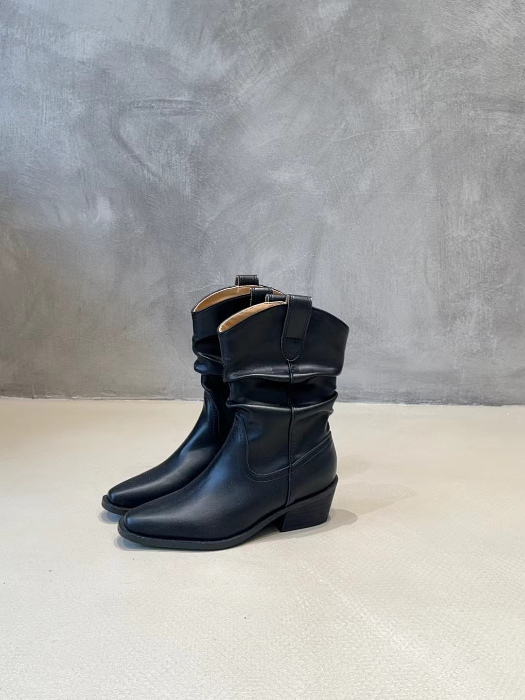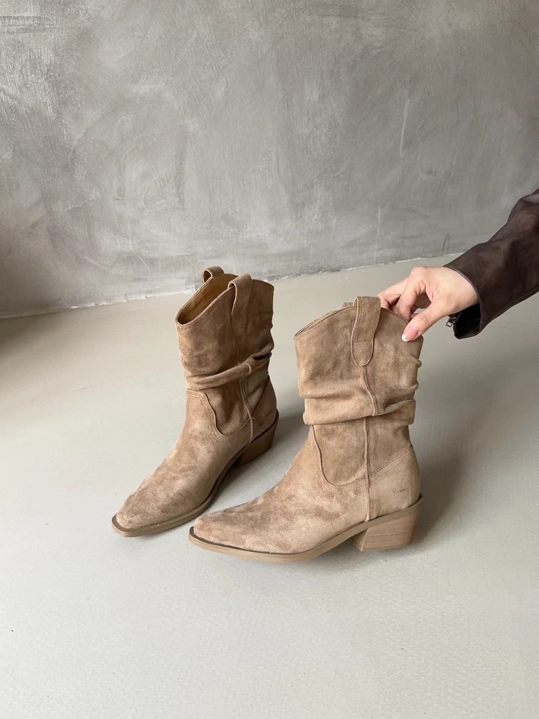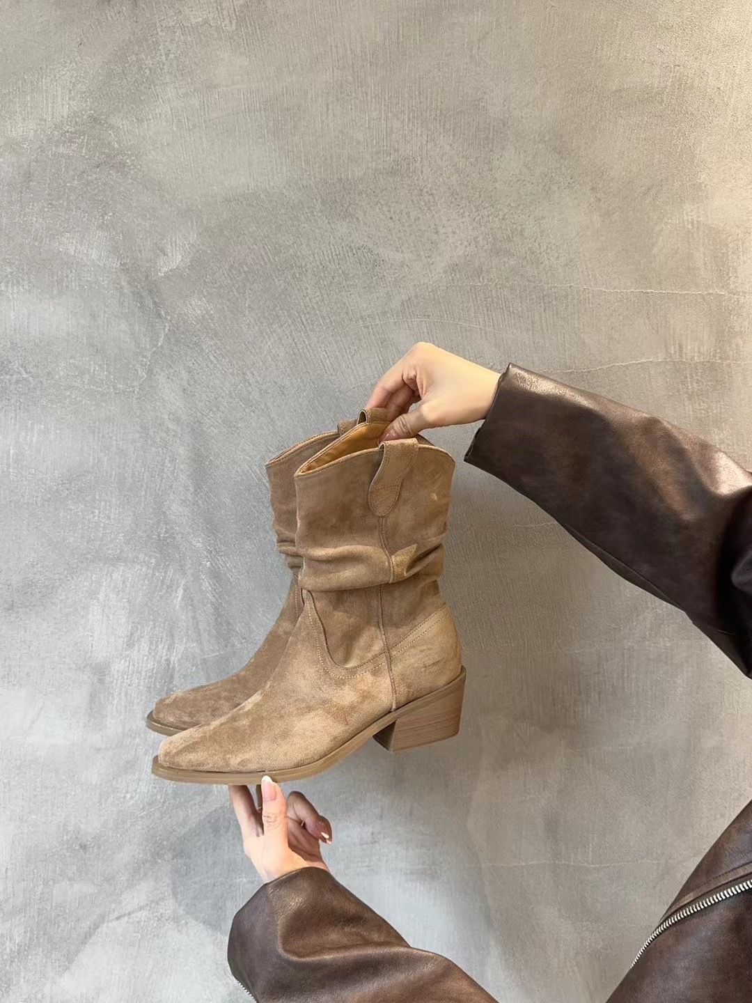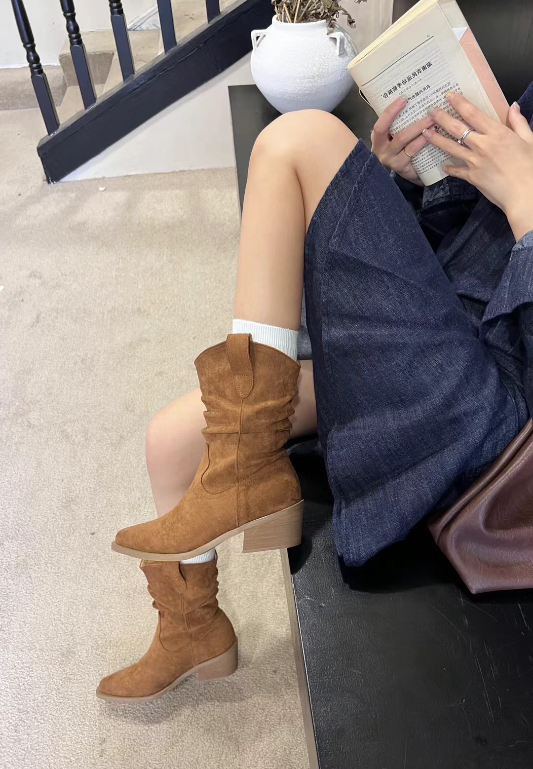 두꺼운 굽의 뾰족한 발가락 미드 부츠 주름진 힙 부츠 여성 2025 가을 겨울 새로운 스타일 복고풍 다용도 짧은 부츠 여성 마틴 부츠스토어 가기