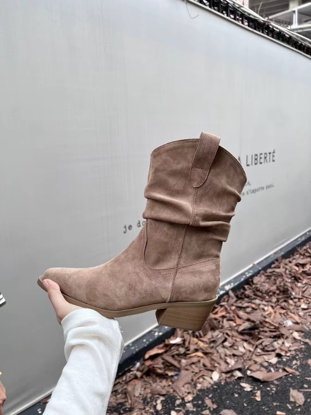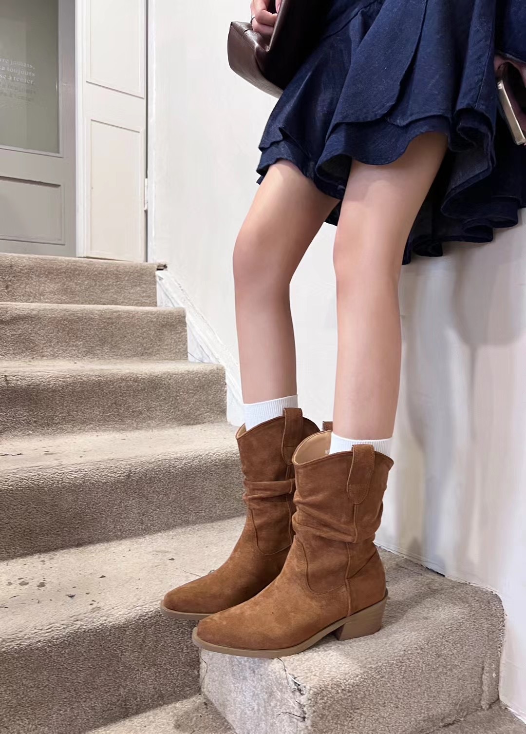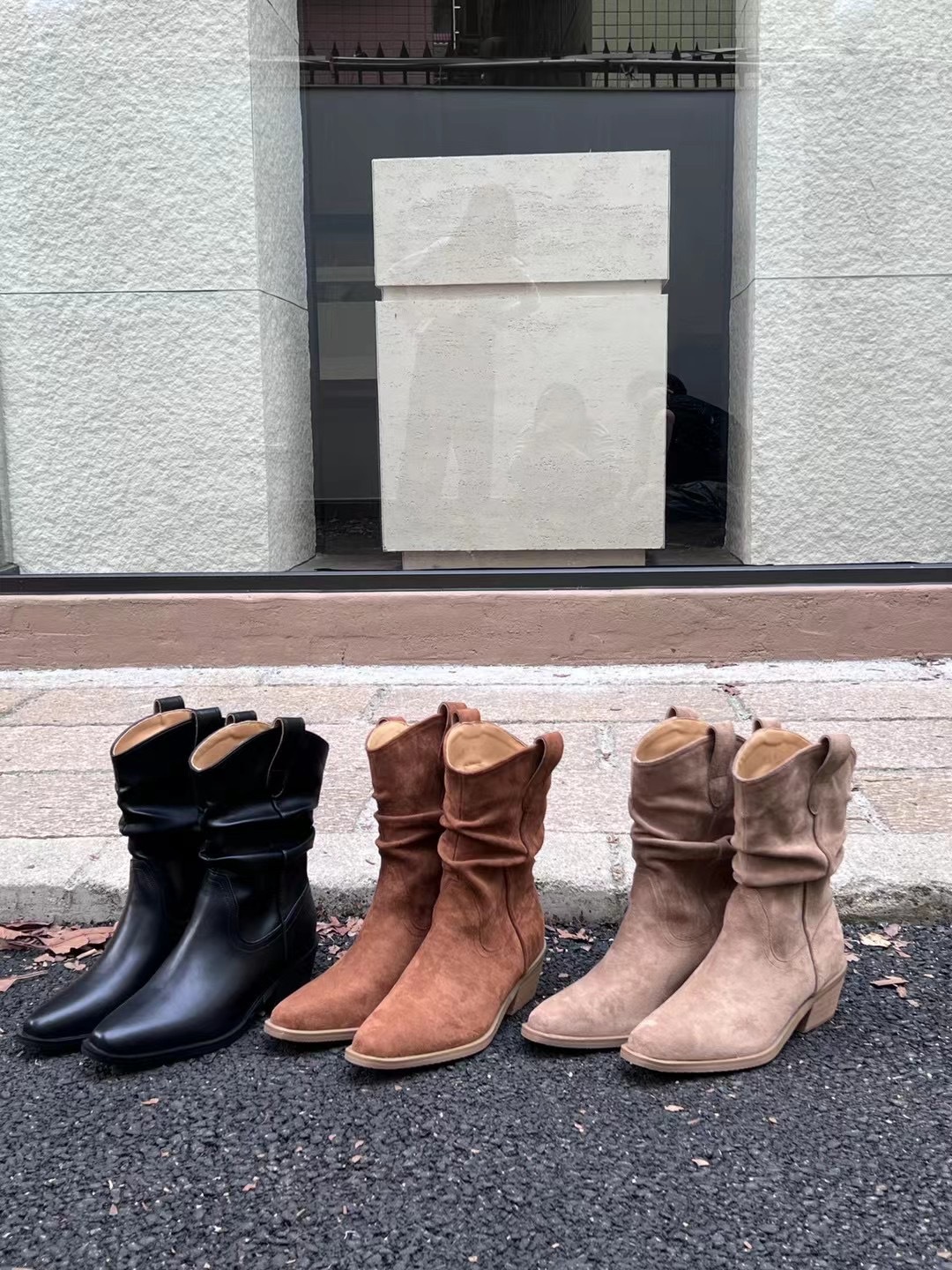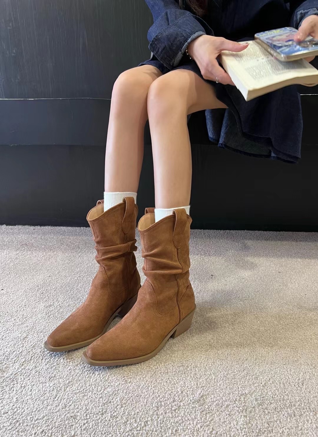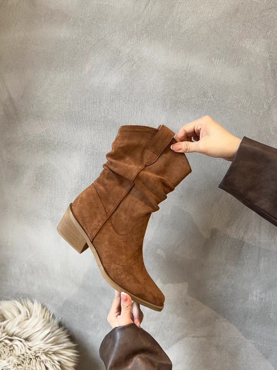 두꺼운 굽의 뾰족한 발가락 미드 부츠 주름진 힙 부츠 여성 2025 가을 겨울 새로운 스타일 복고풍 다용도 짧은 부츠 여성 마틴 부츠스토어 가기