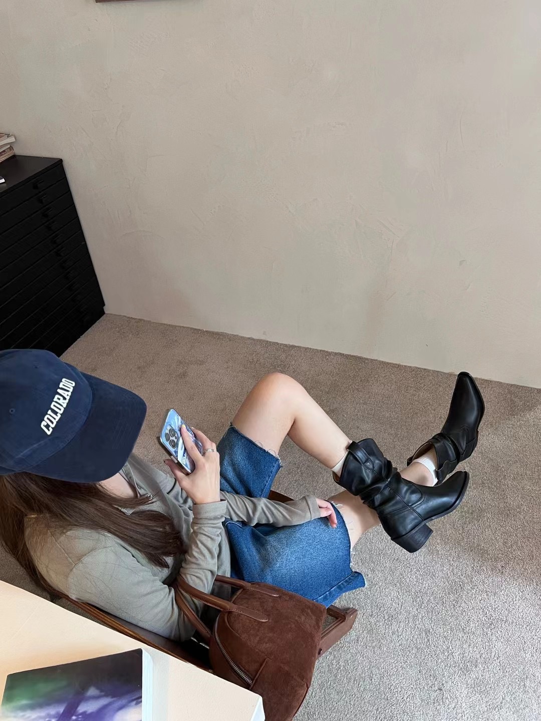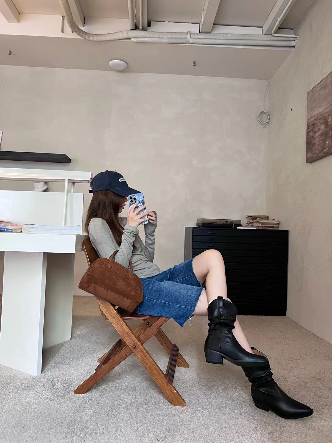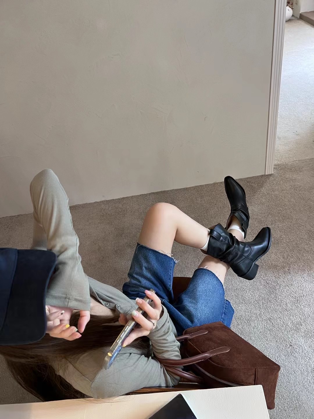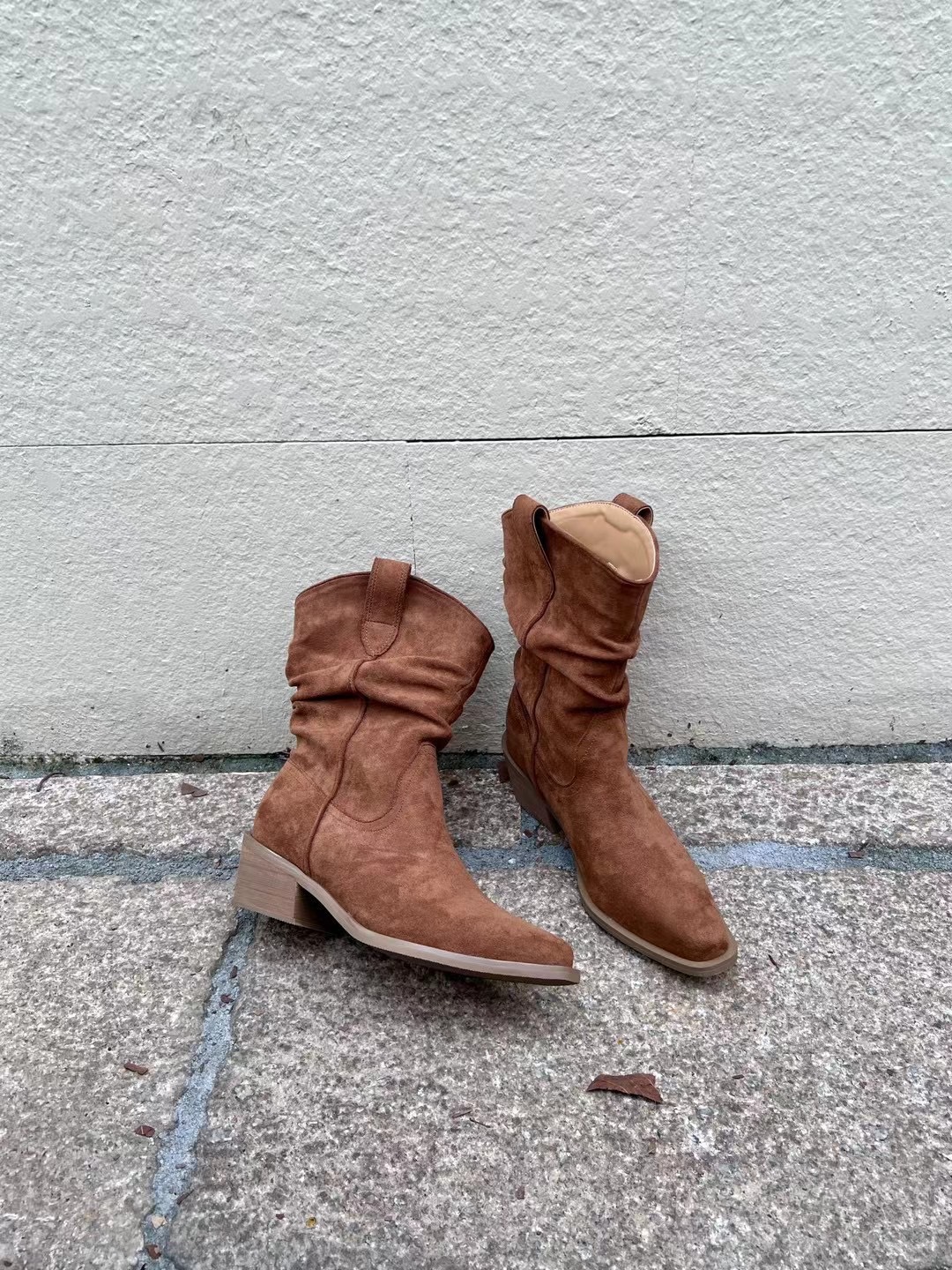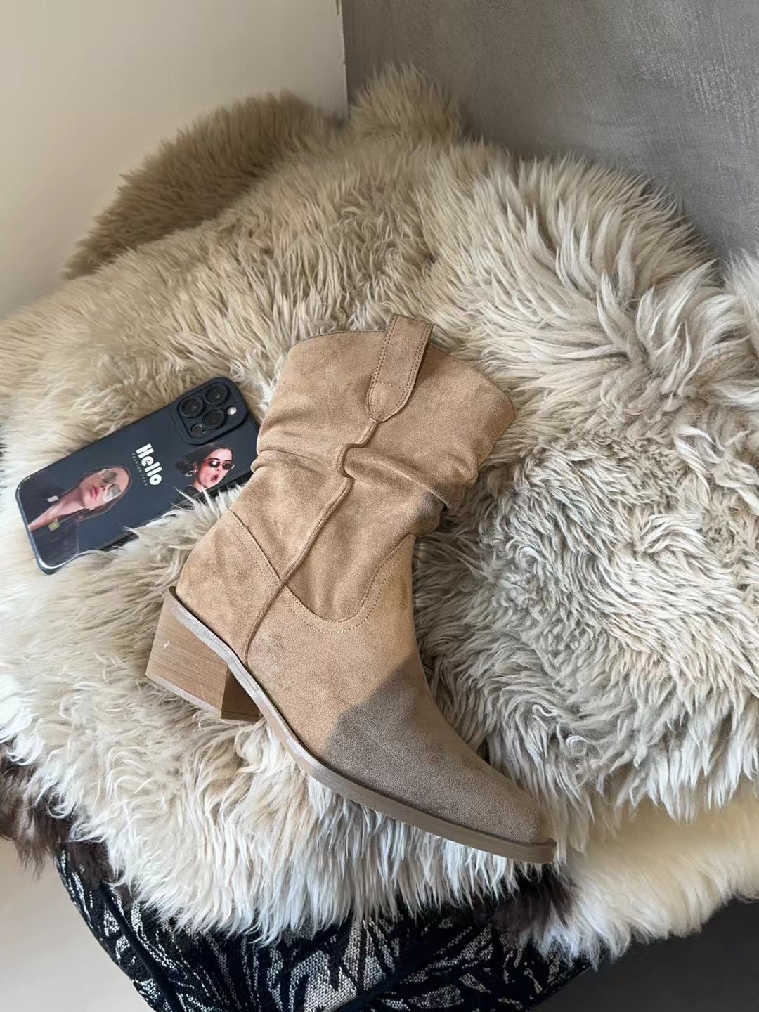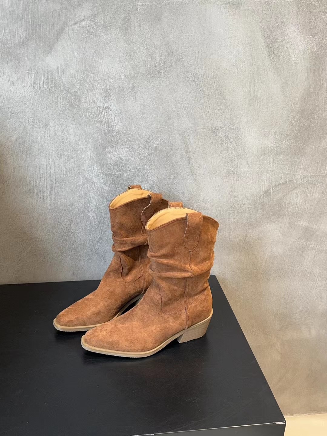 두꺼운 굽의 뾰족한 발가락 미드 부츠 주름진 힙 부츠 여성 2025 가을 겨울 새로운 스타일 복고풍 다용도 짧은 부츠 여성 마틴 부츠스토어 가기