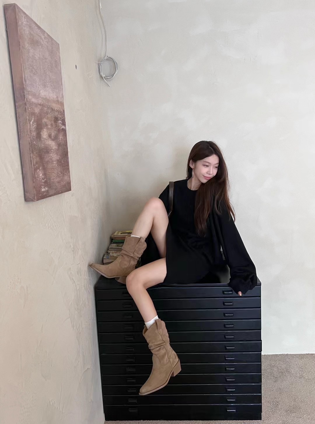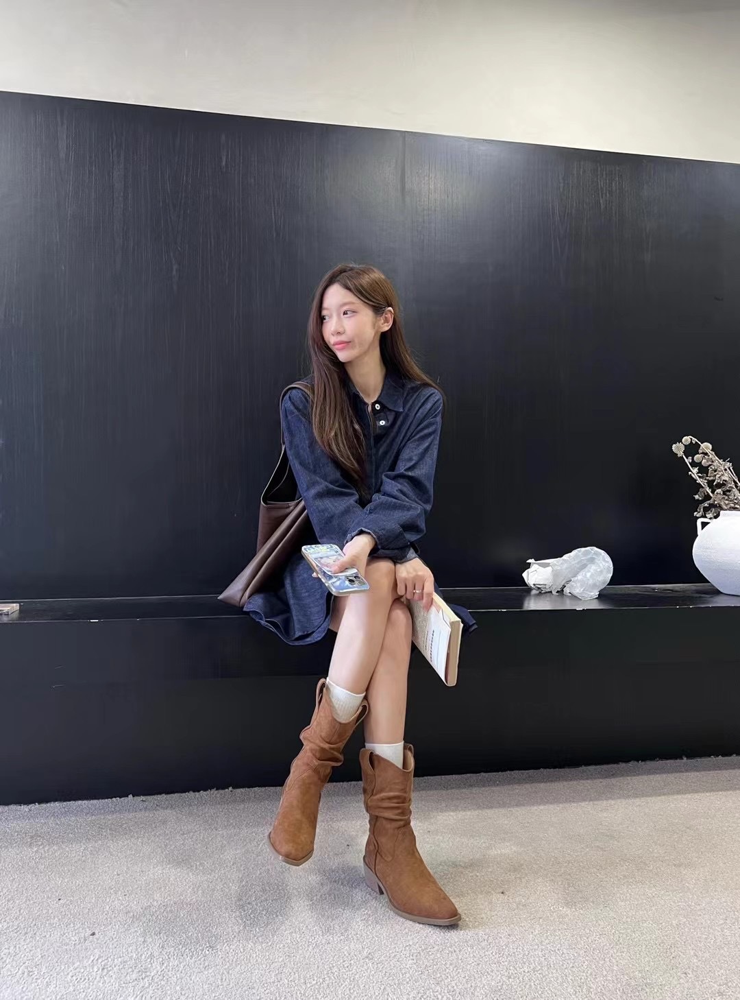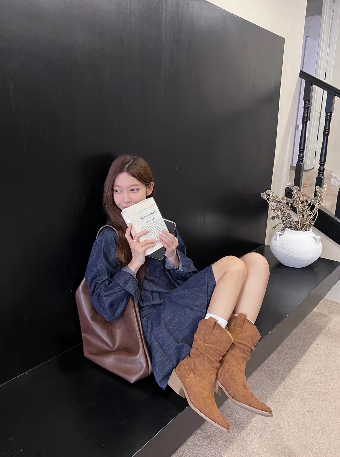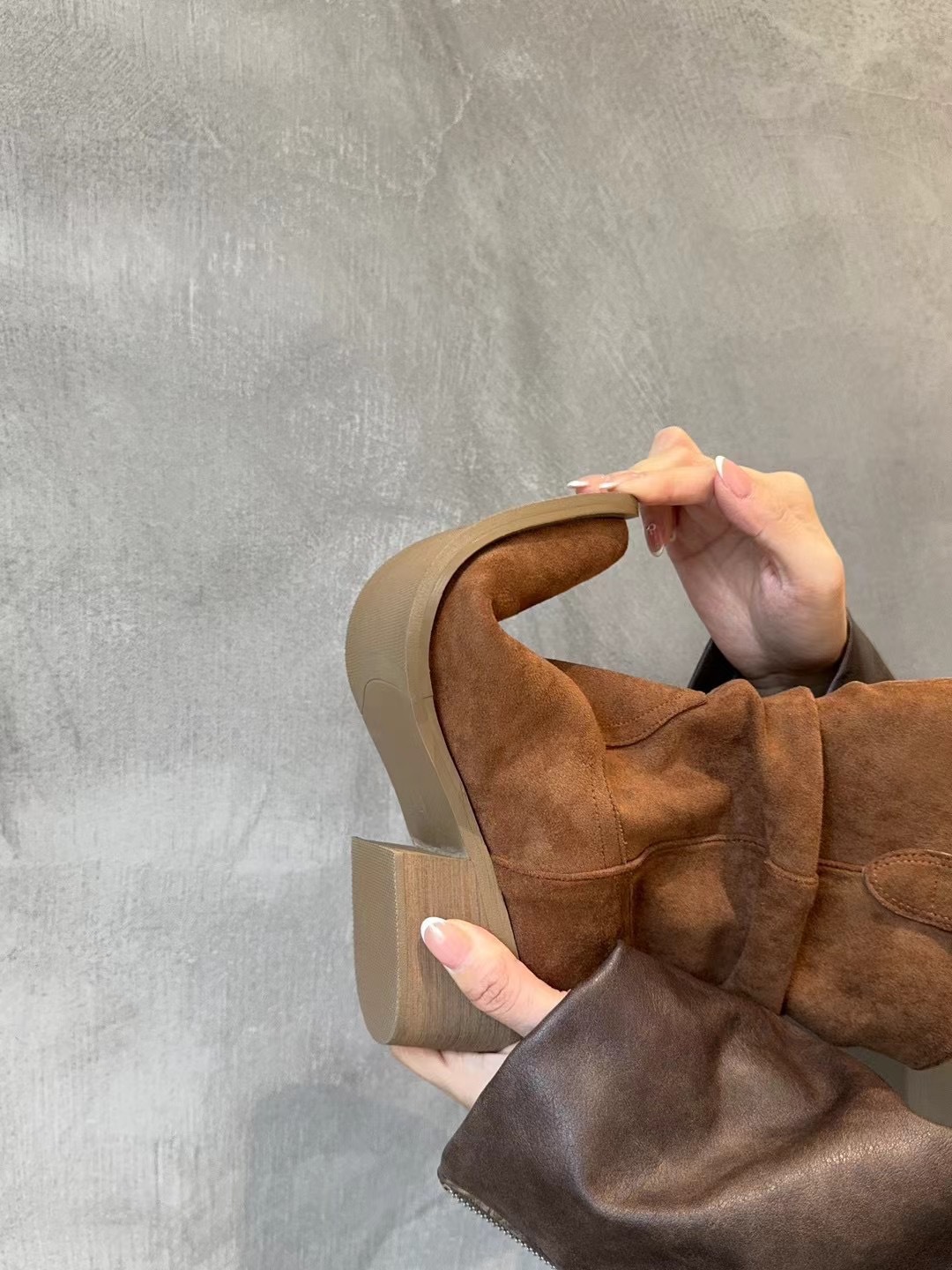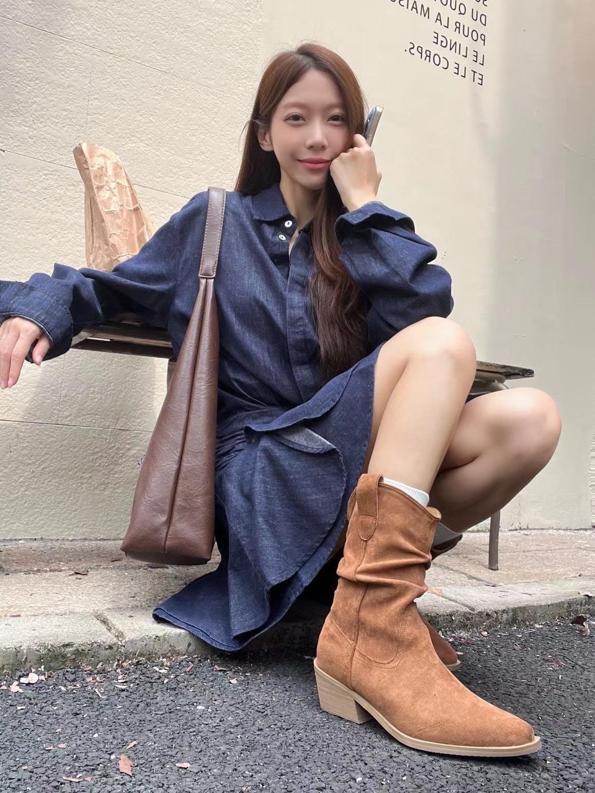 두꺼운 굽의 뾰족한 발가락 미드 부츠 주름진 힙 부츠 여성 2025 가을 겨울 새로운 스타일 복고풍 다용도 짧은 부츠 여성 마틴 부츠스토어 가기
