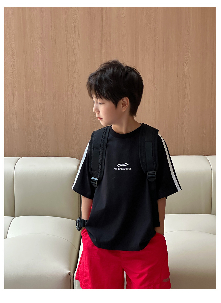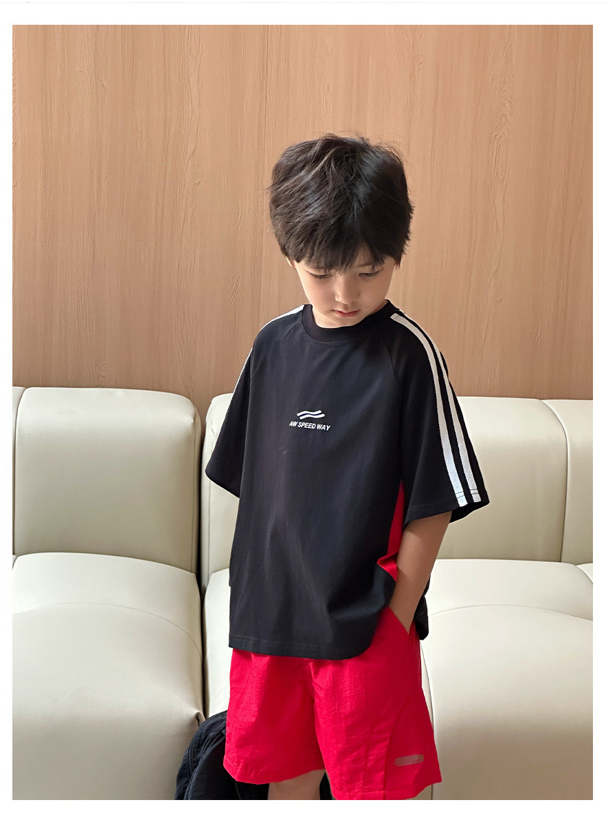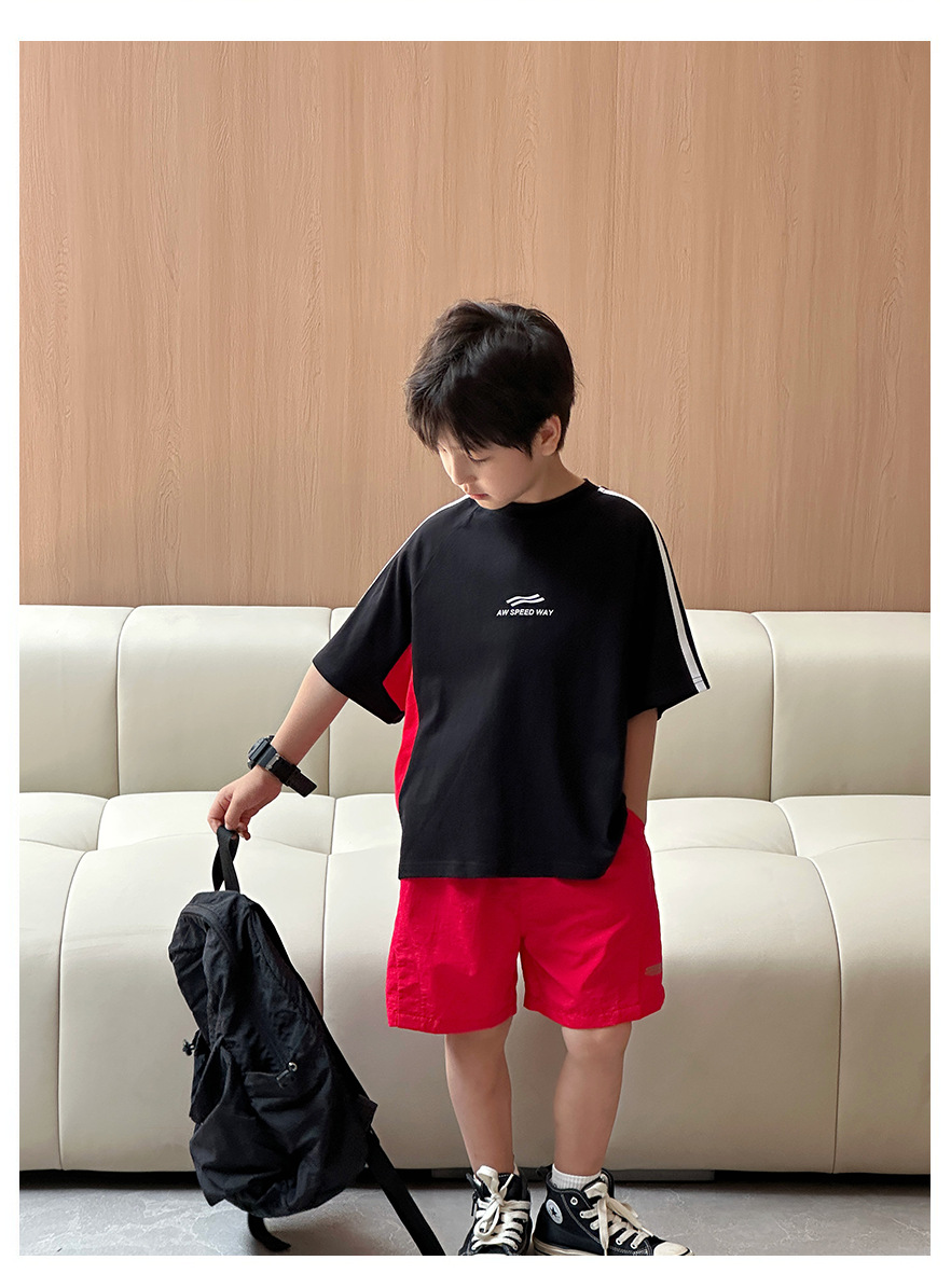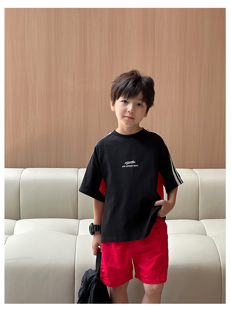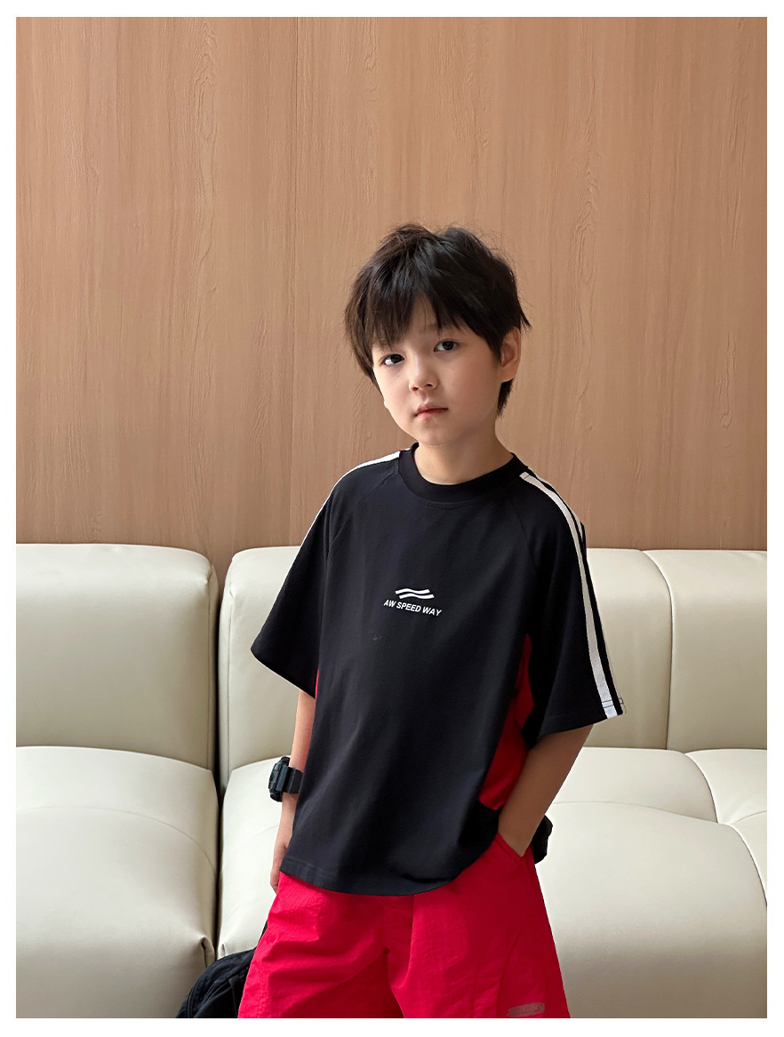 아메리칸 스트리트 디자인 대비 색상 소년 반팔 티셔츠 아동 여름 느슨한 레이싱 슈트 캐주얼 라운드 넥 탑 트렌디스토어 가기