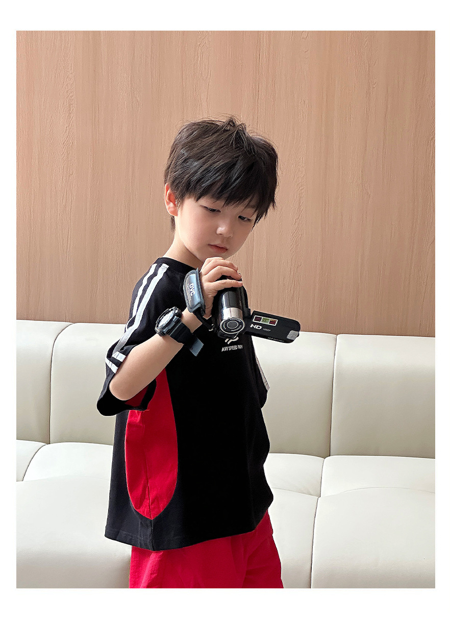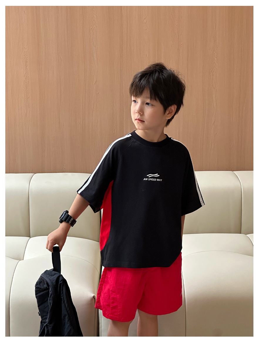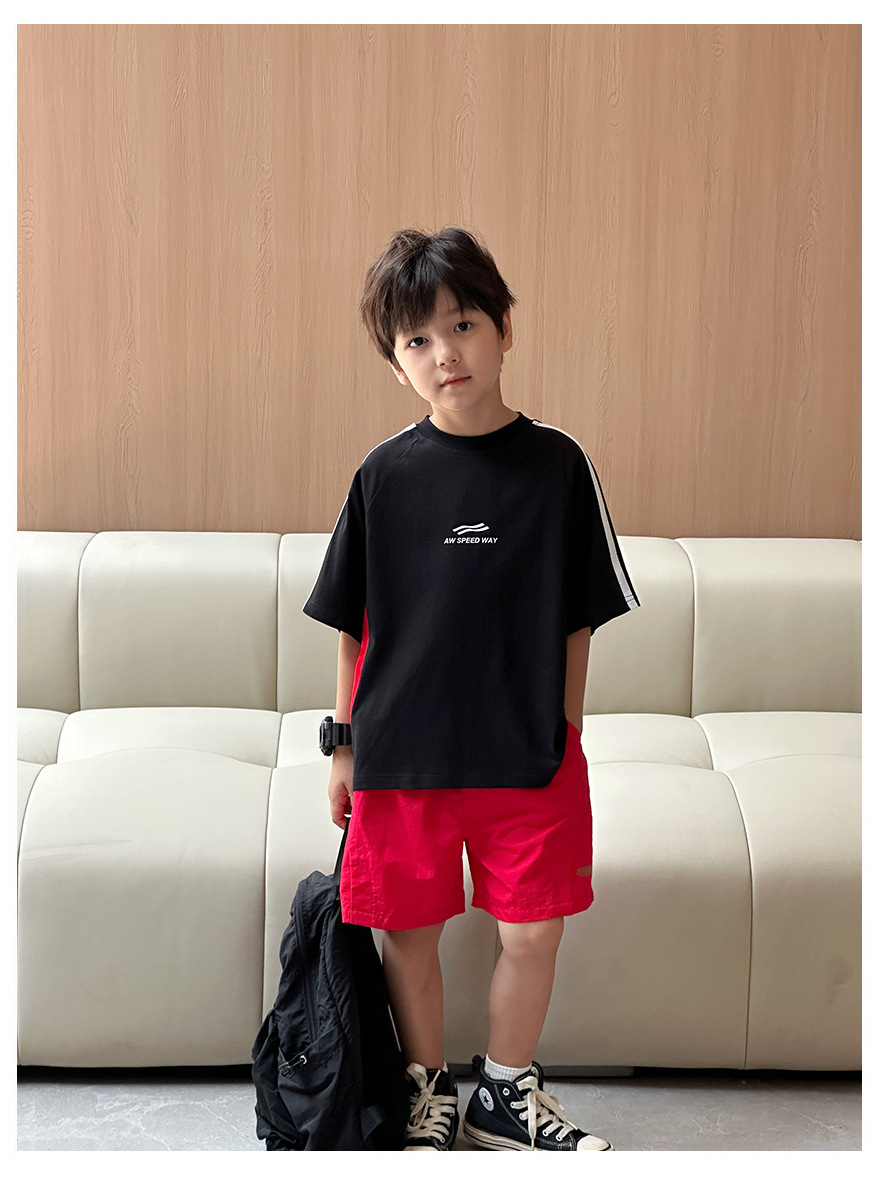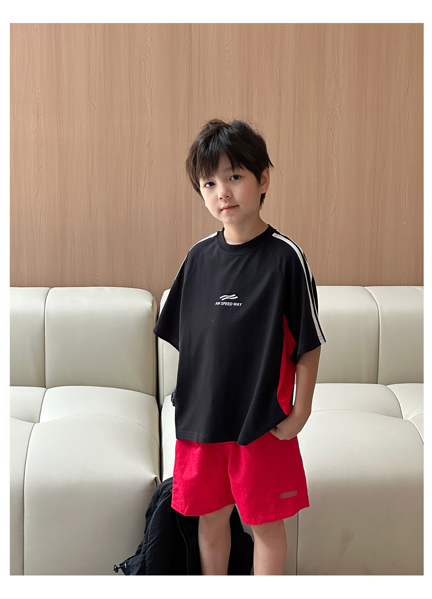 아메리칸 스트리트 디자인 대비 색상 소년 반팔 티셔츠 아동 여름 느슨한 레이싱 슈트 캐주얼 라운드 넥 탑 트렌디