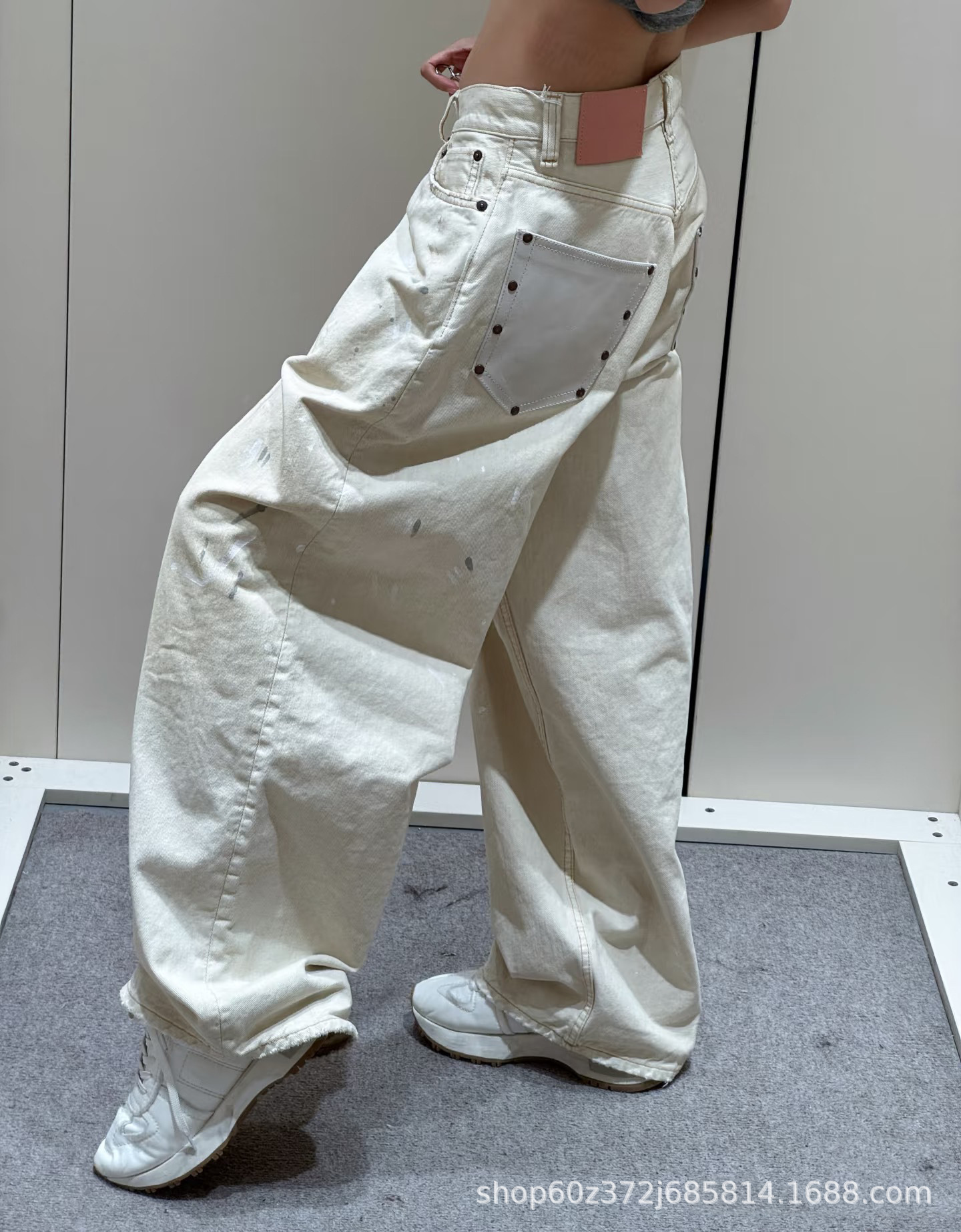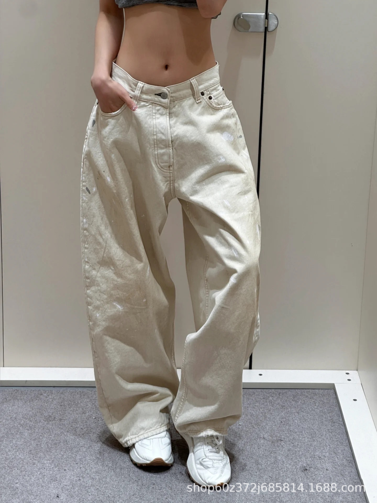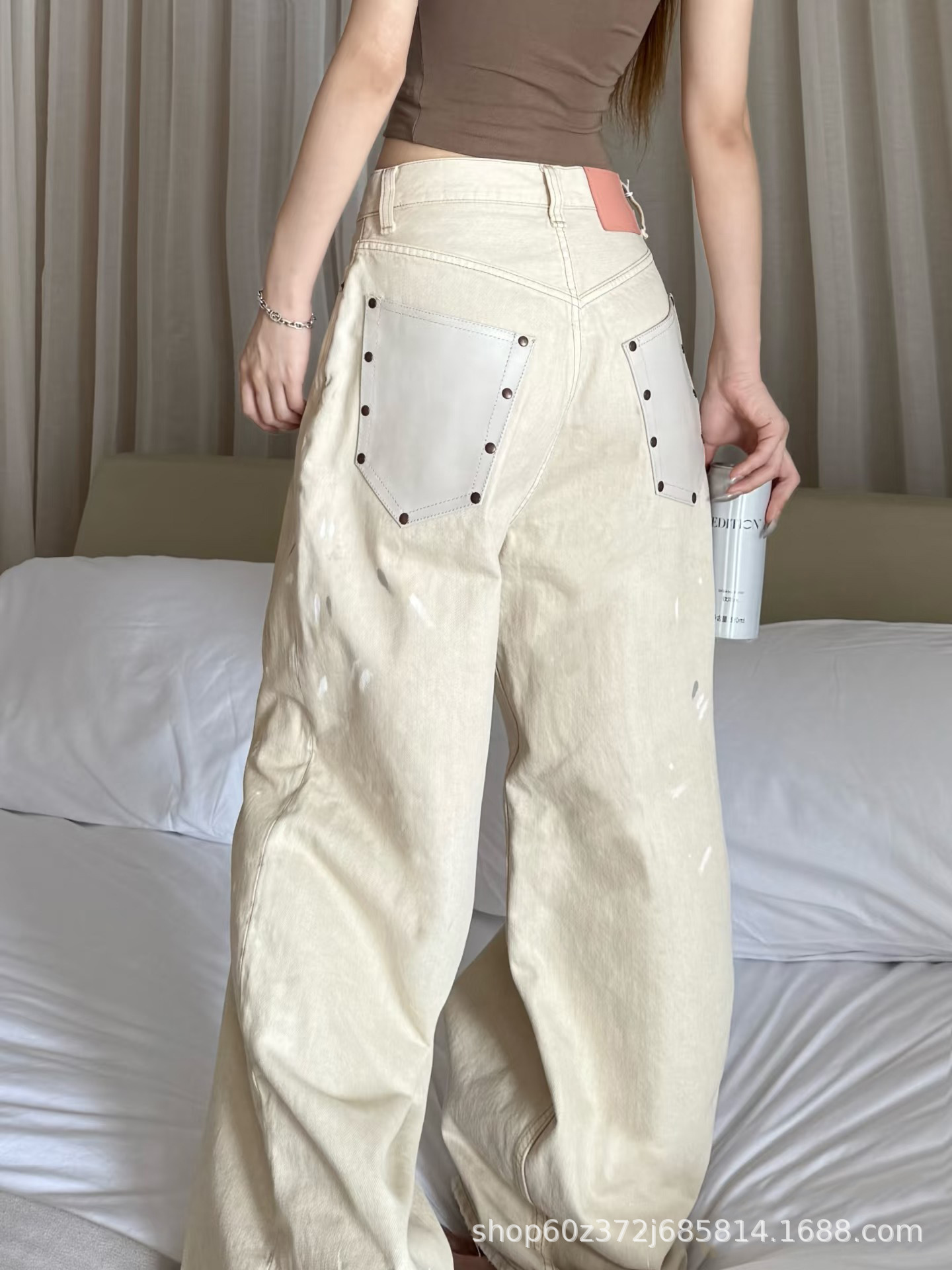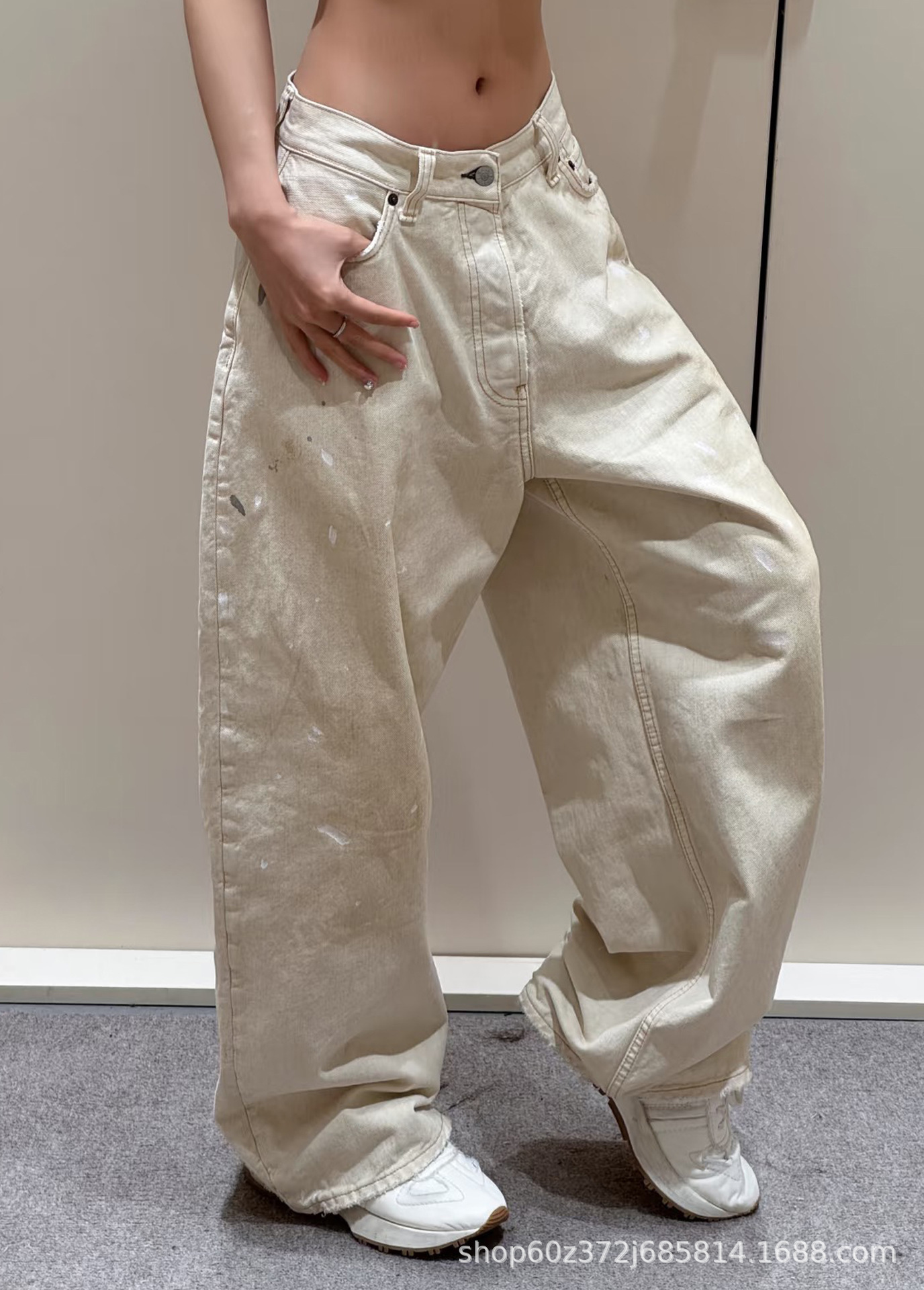 우슈안이와 같은 스타일 25 초가을 복고풍 틈새 디자인 더러운 염색 스플래시 잉크 손으로 그린 루즈 스트레이트 와이드 레그 청바지 여성용스토어 가기