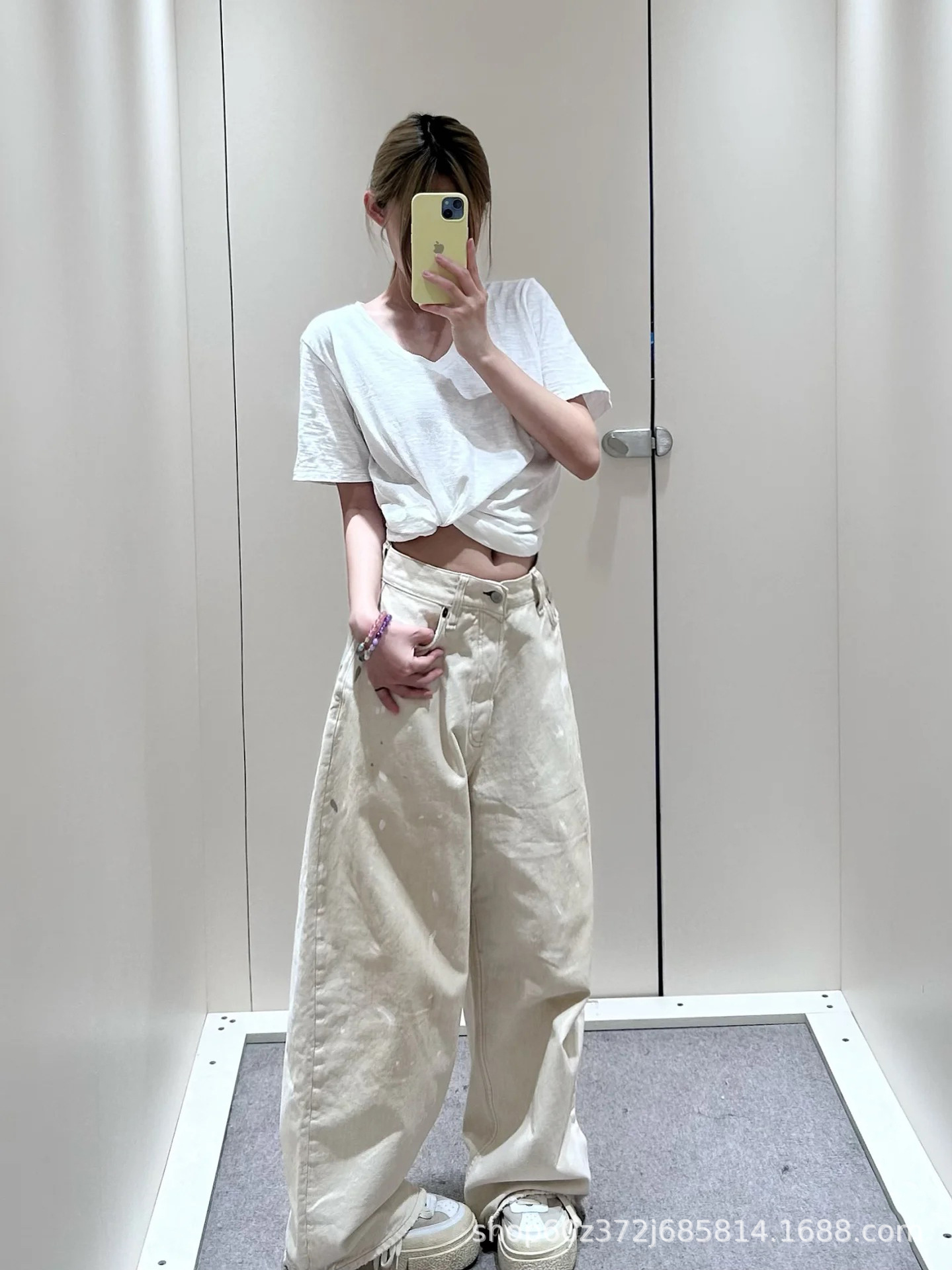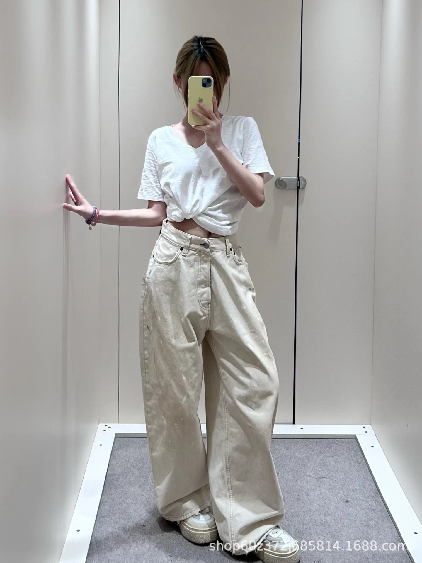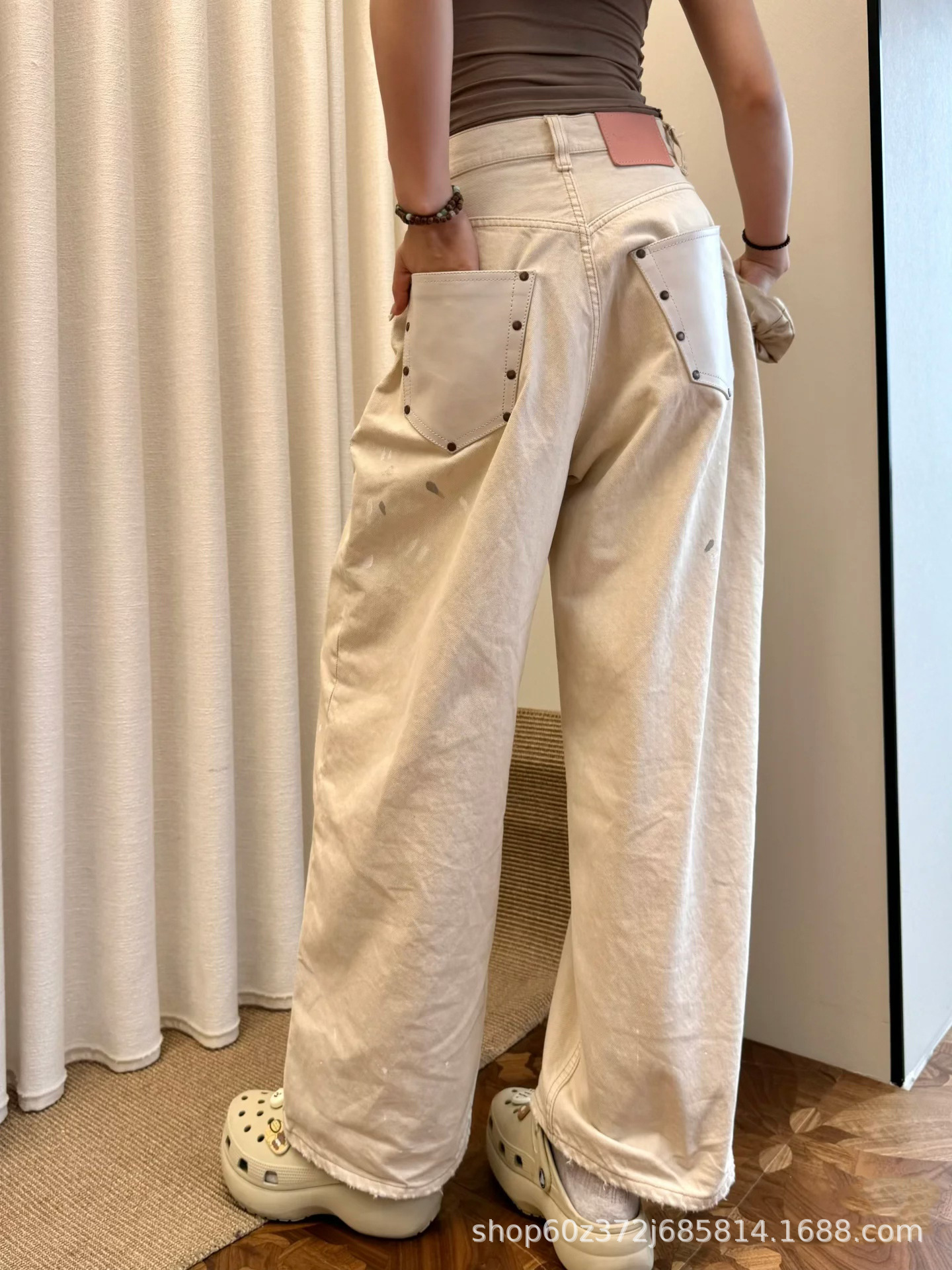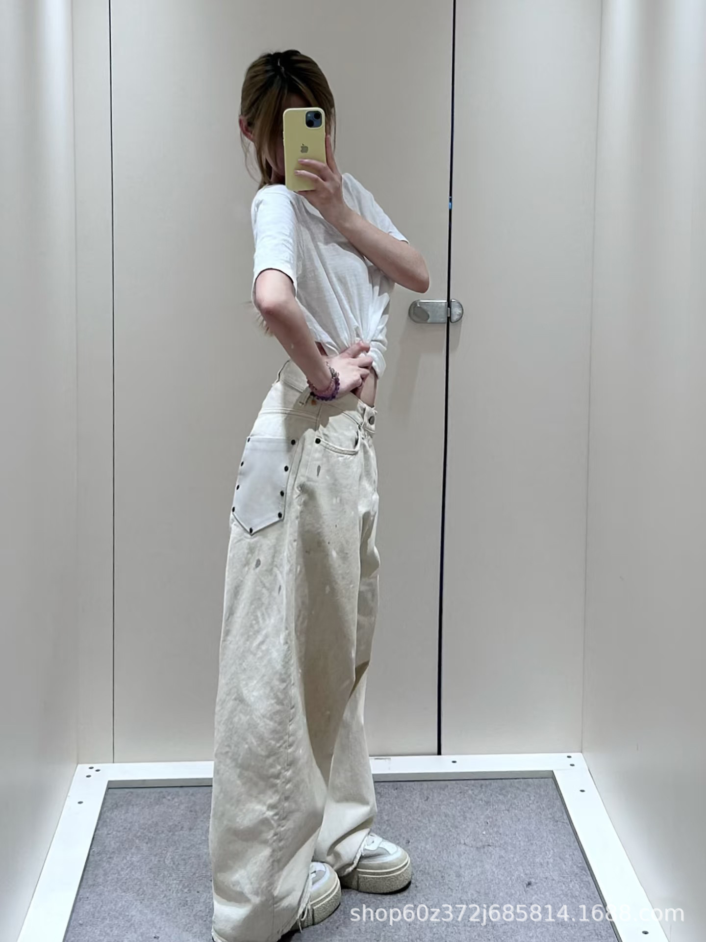우슈안이와 같은 스타일 25 초가을 복고풍 틈새 디자인 더러운 염색 스플래시 잉크 손으로 그린 루즈 스트레이트 와이드 레그 청바지 여성용스토어 가기