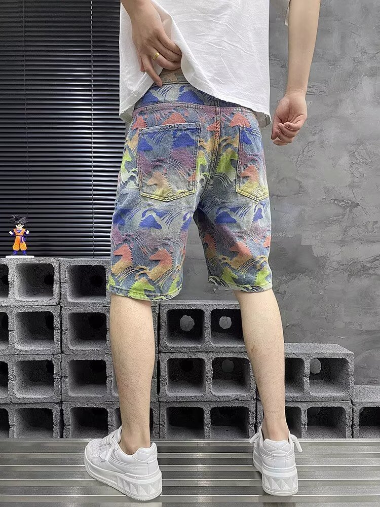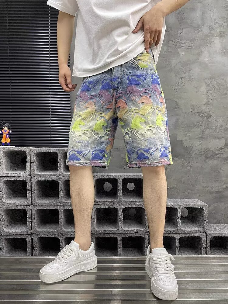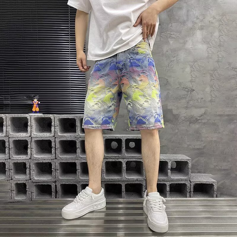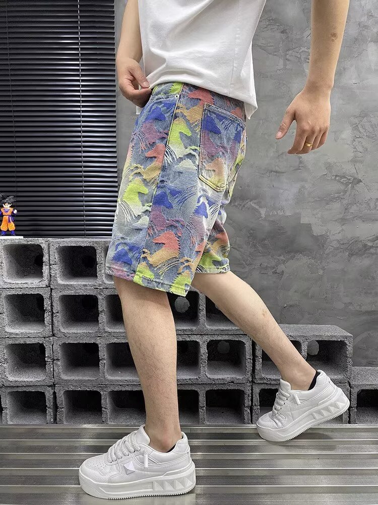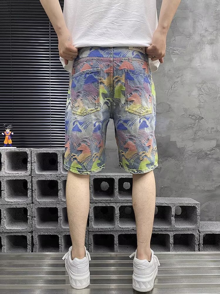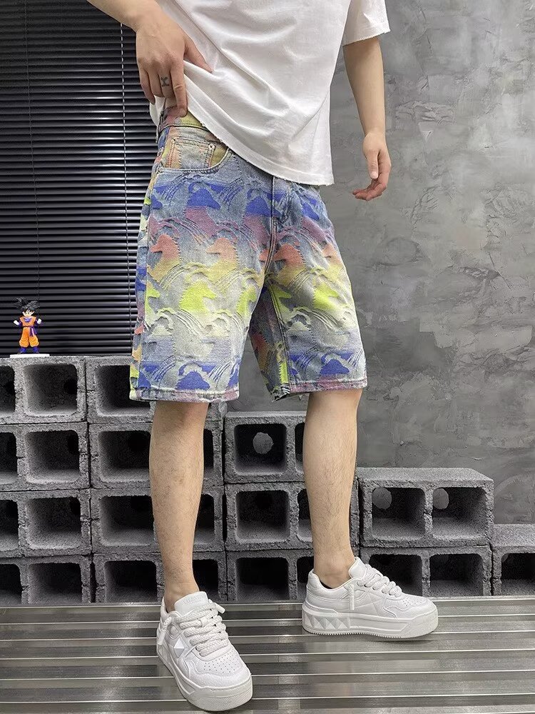 국경을 넘나드는 여름 미국 하이 스트리트 패션 브랜드 남성용 다채로운 자카드 5부 바지 남성용 데님 반바지 남성용 루즈 스트레이트 미드팬츠