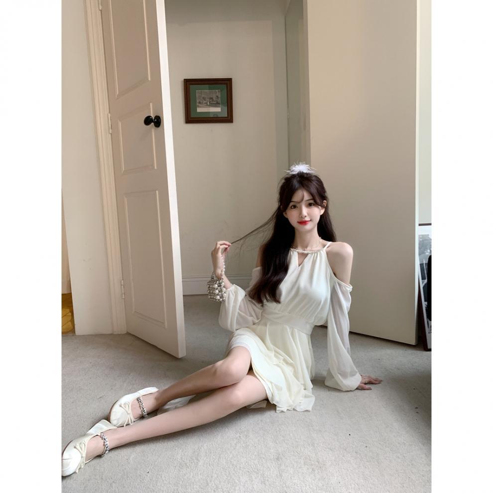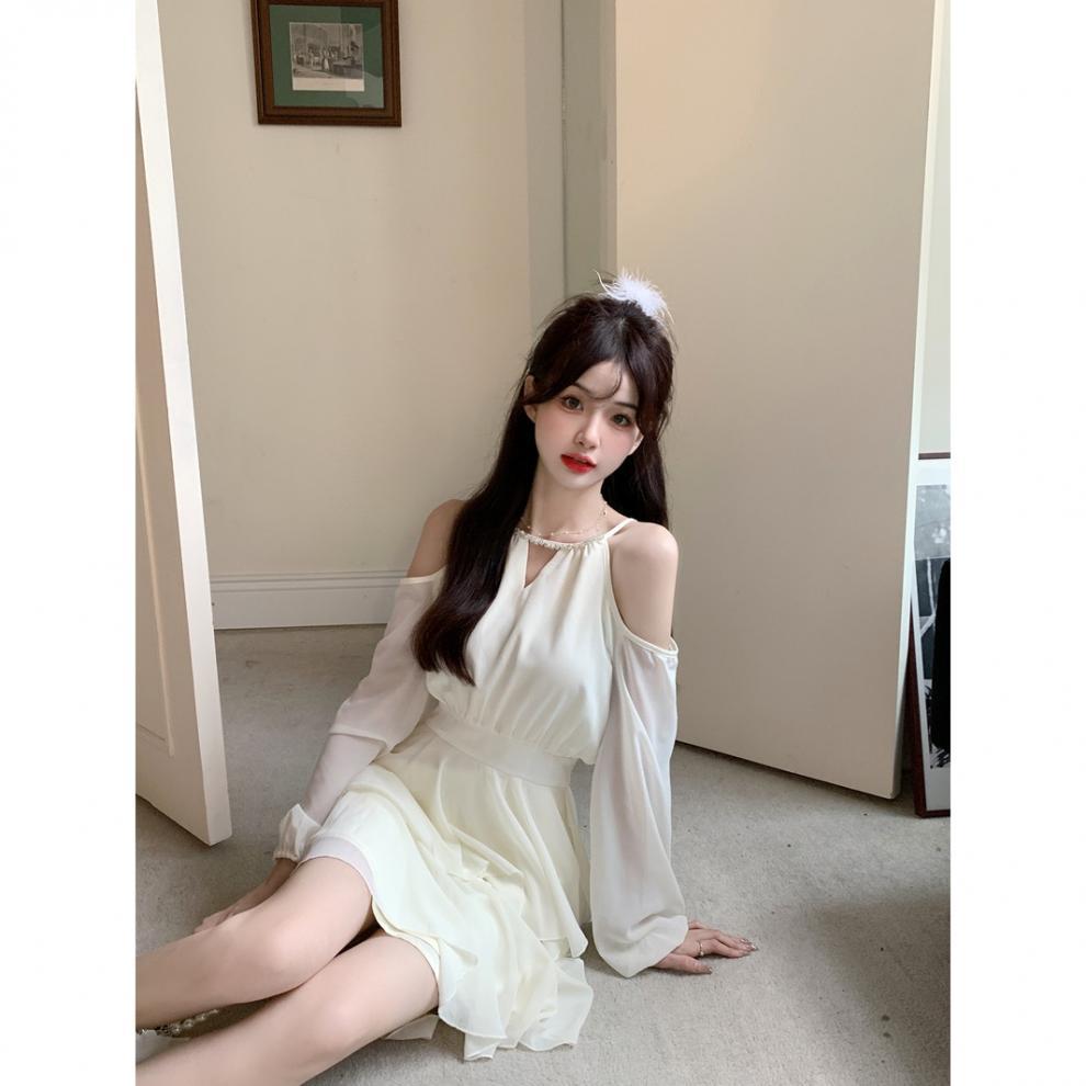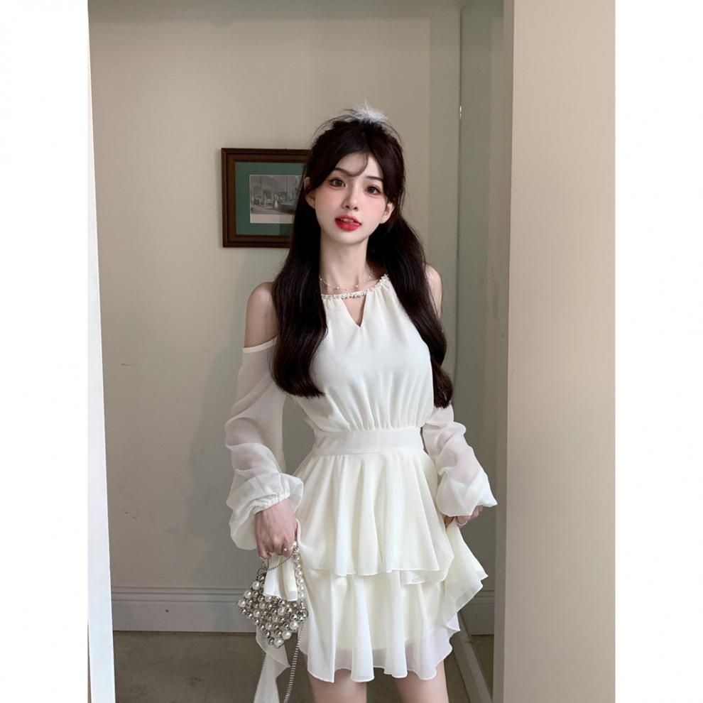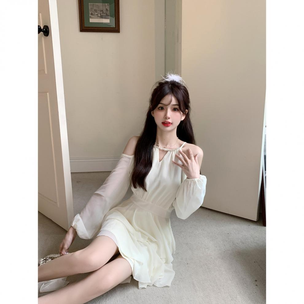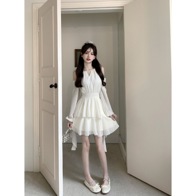 봄 여름 신상 팻mm 프렌치 긴팔 드레스, 요정 허리, 달콤한 쉬폰 스커트, 러플 케이크 스커트스토어 가기