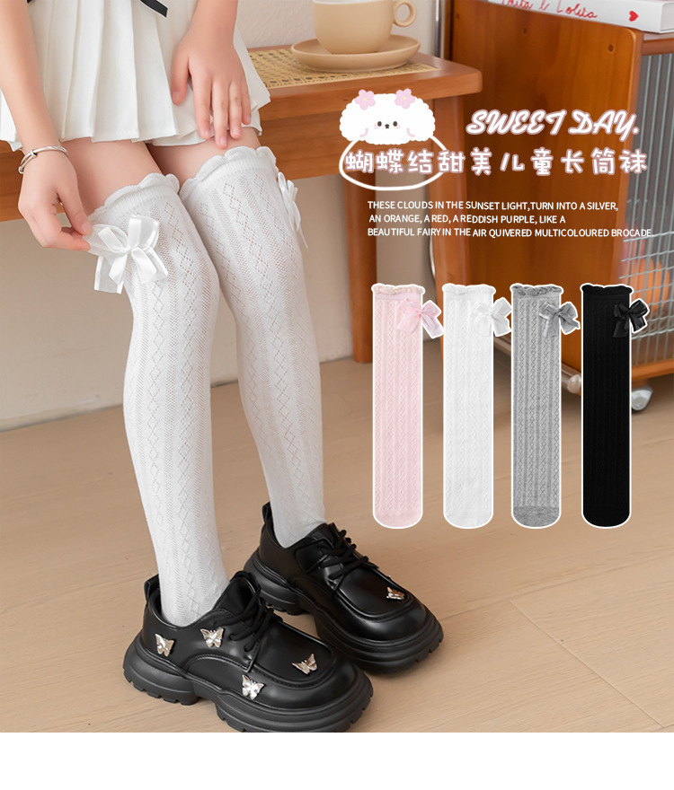 리본 장식 아동용 중목 양말, 여아용 긴 양말, 봄, 가을용 얇은 아기용 무릎 위 양말, 공주풍 모기 방지 양말