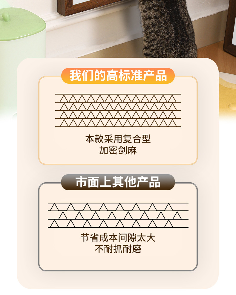 特点 1:剑麻是天然植物纤维,剑麻纤维粗硬坚韧,结构紧密,能承受猫咪长时间、高强度抓挠,不易变形、破损和掉屑,使用寿命长。