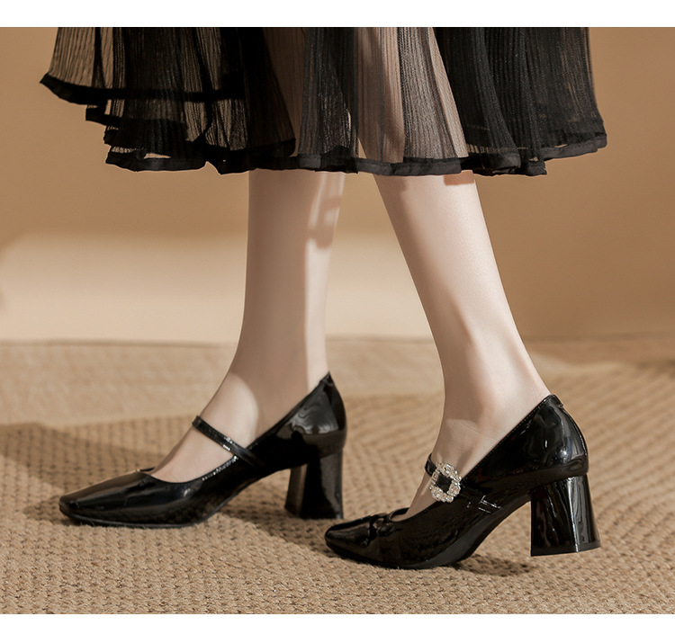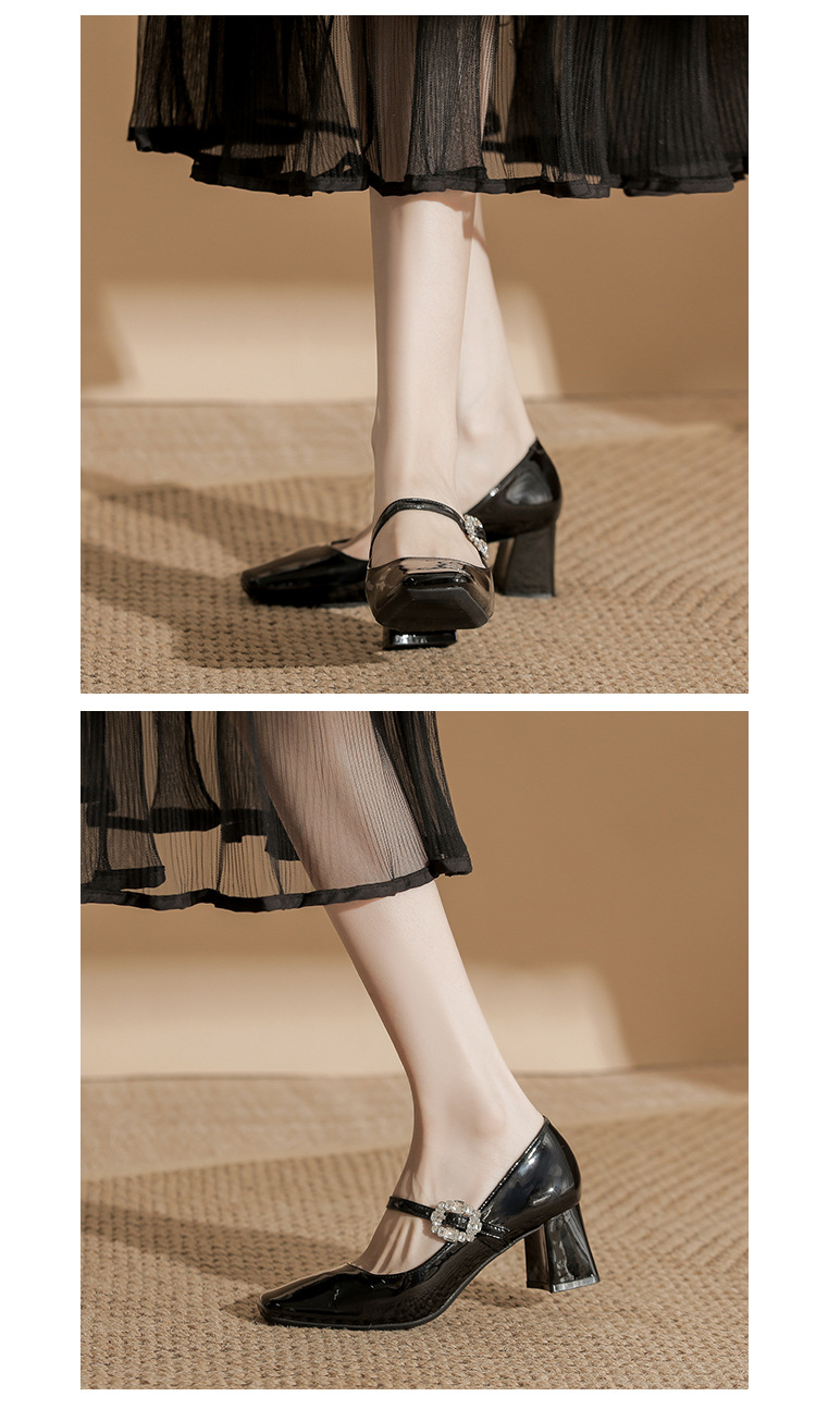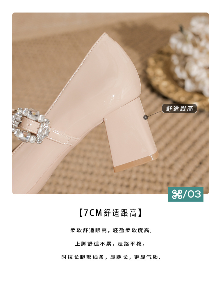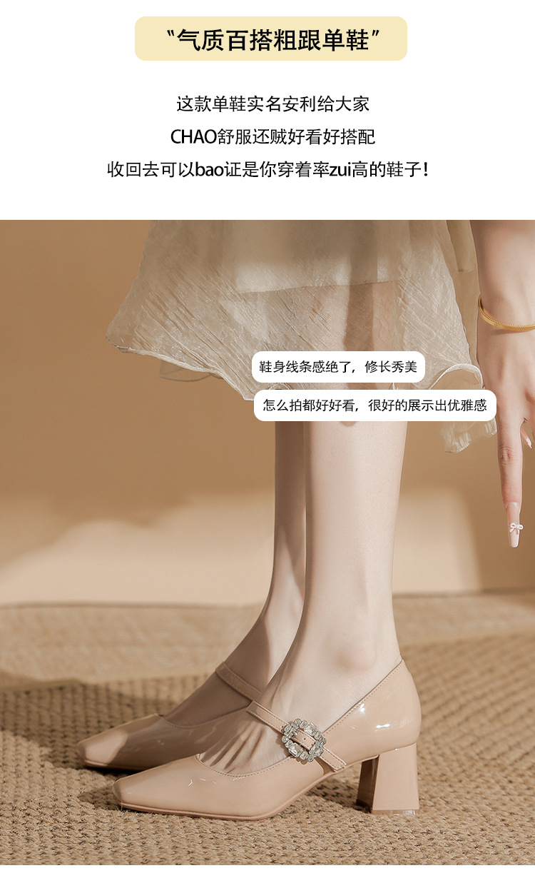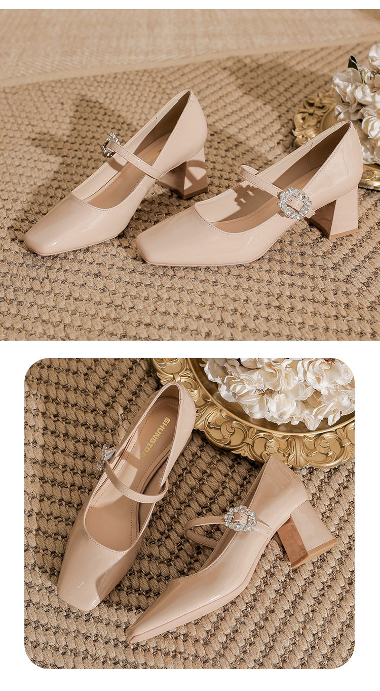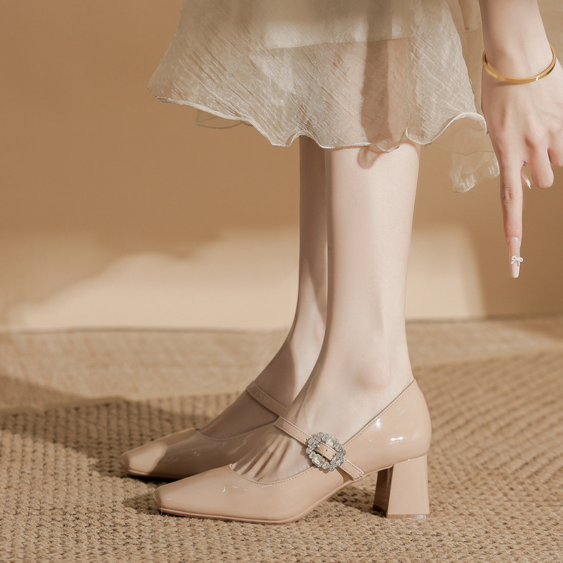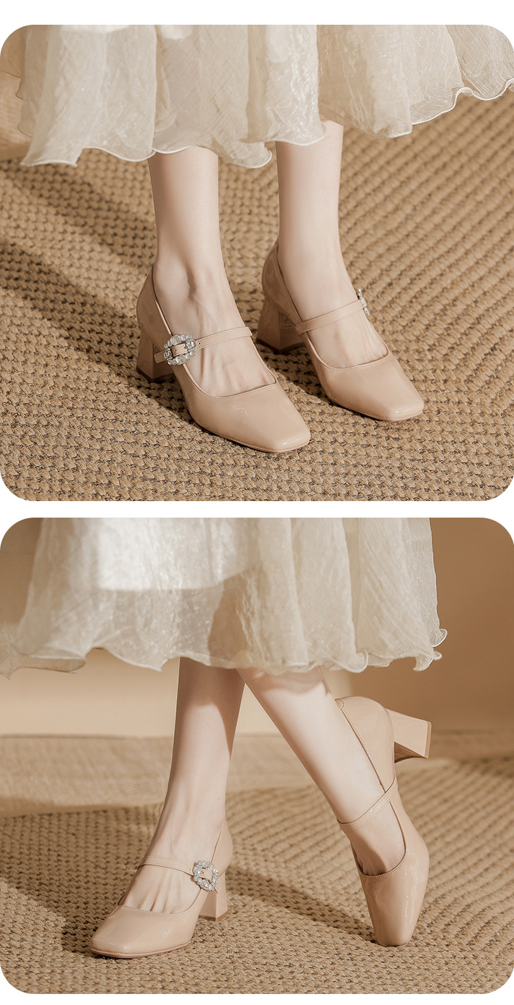 2025 봄 가을 신상품 라인스톤 두꺼운 굽 스퀘어 토 하이힐 누드 색상의 특허 가죽 메리제인 여성화스토어 가기