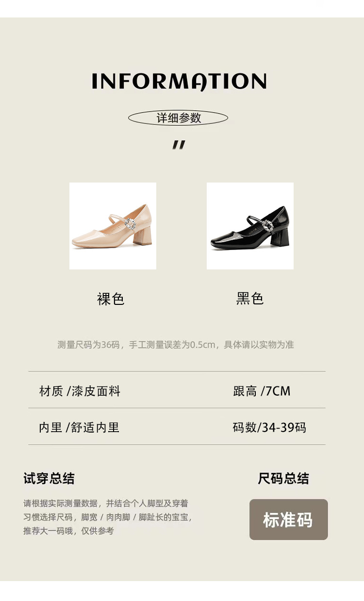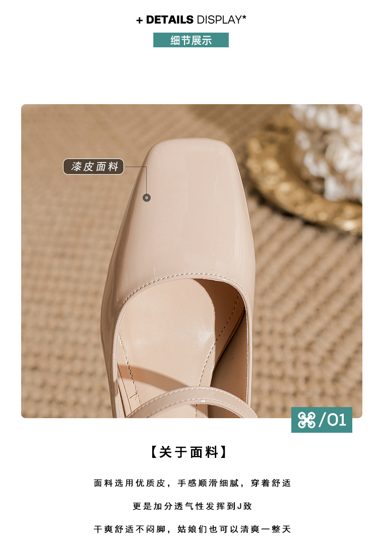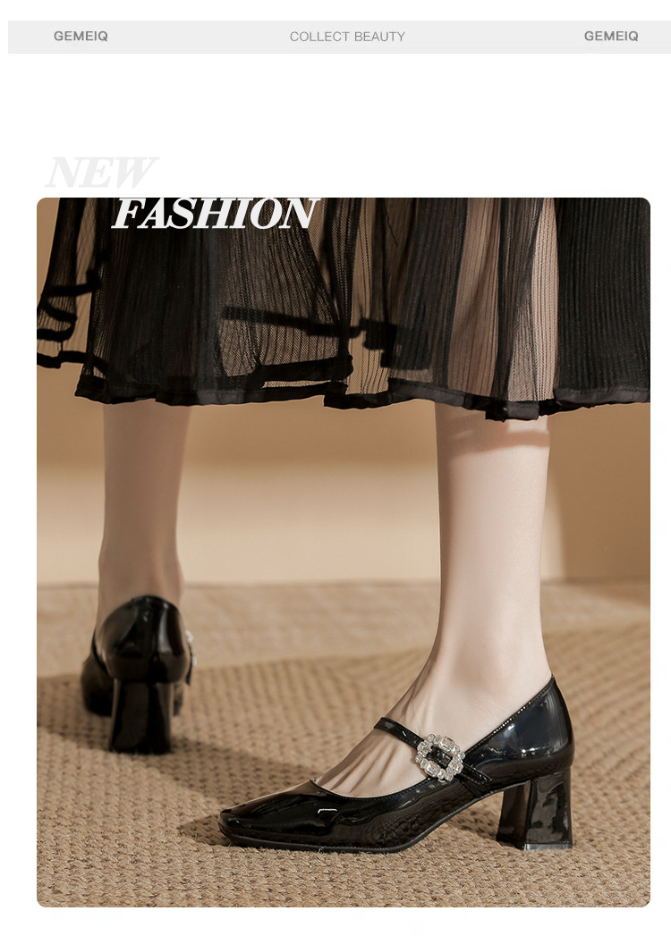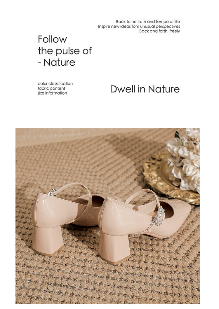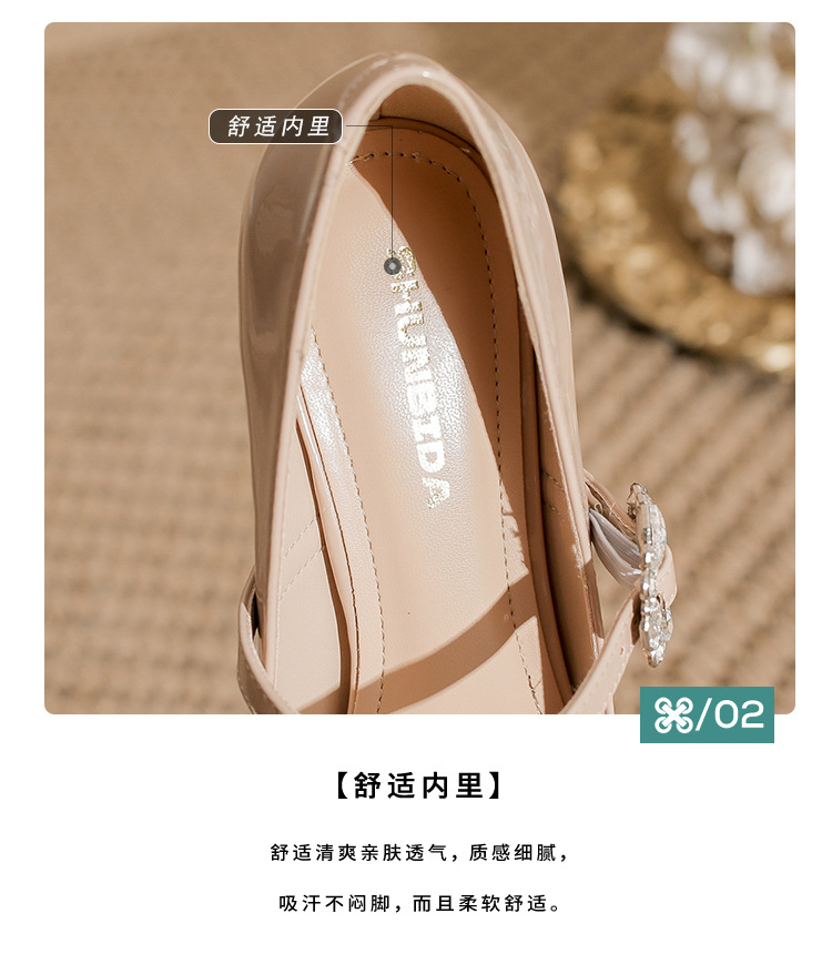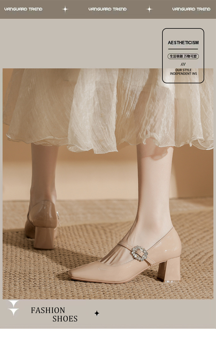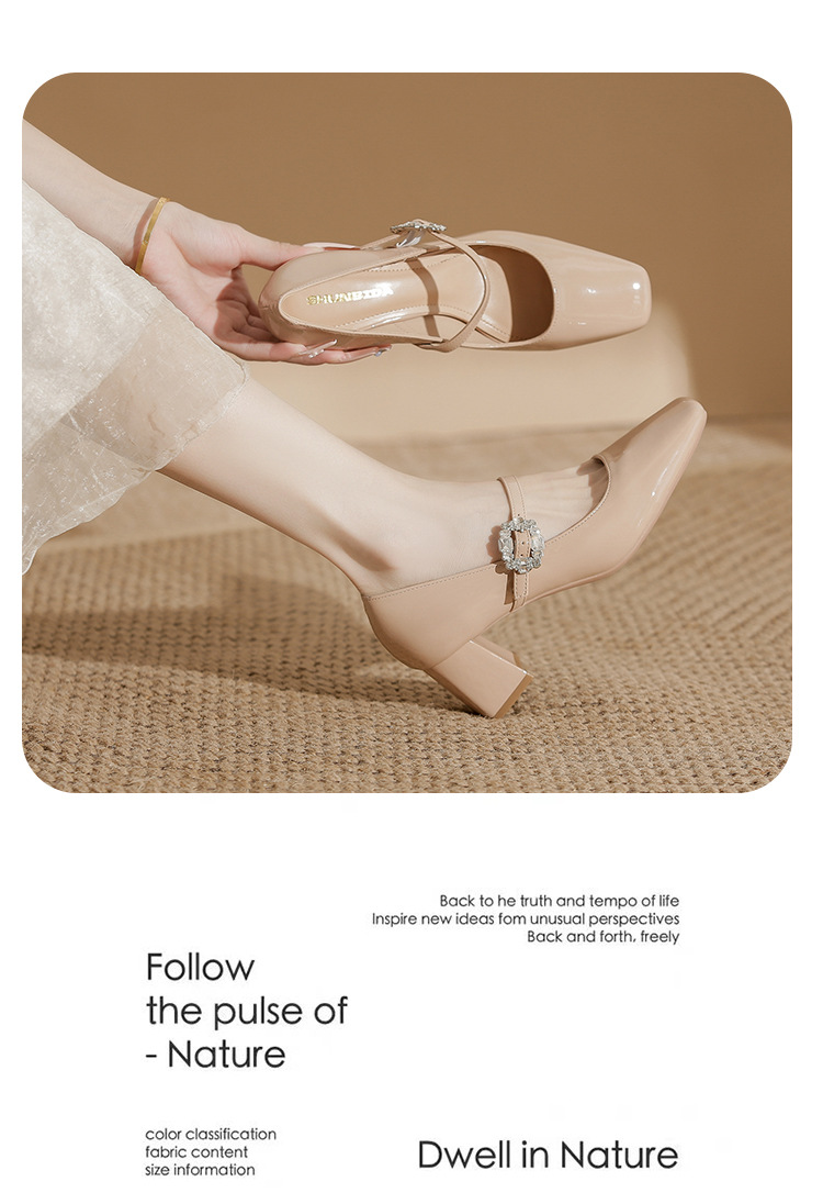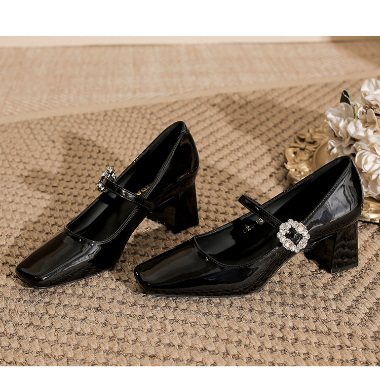 2025 봄 가을 신상품 라인스톤 두꺼운 굽 스퀘어 토 하이힐 누드 색상의 특허 가죽 메리제인 여성화스토어 가기