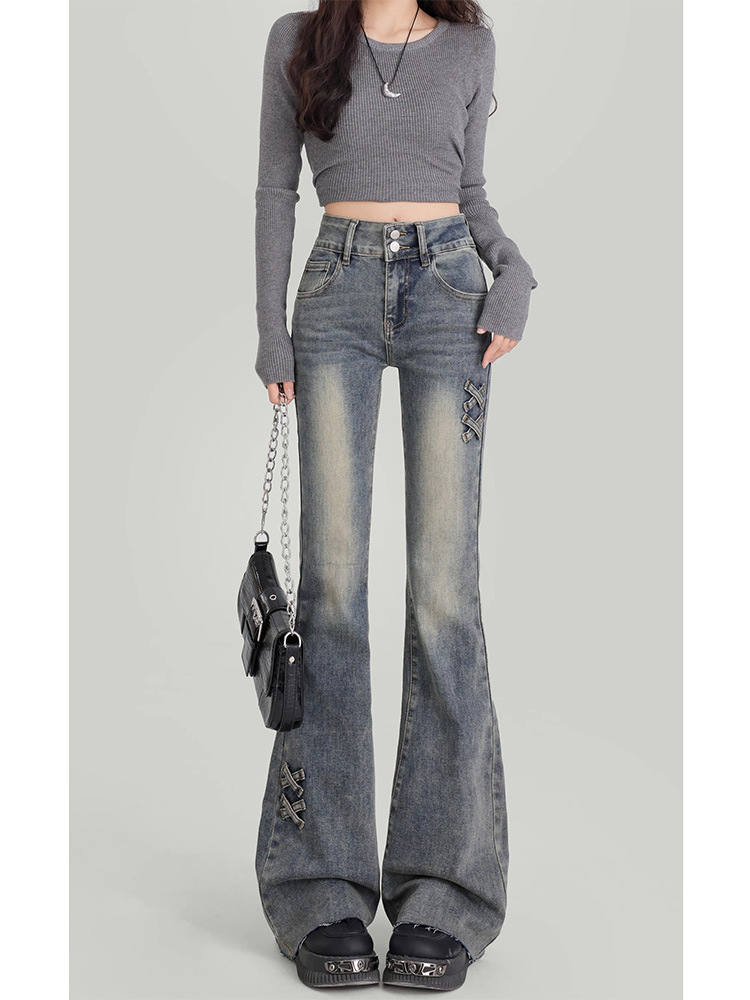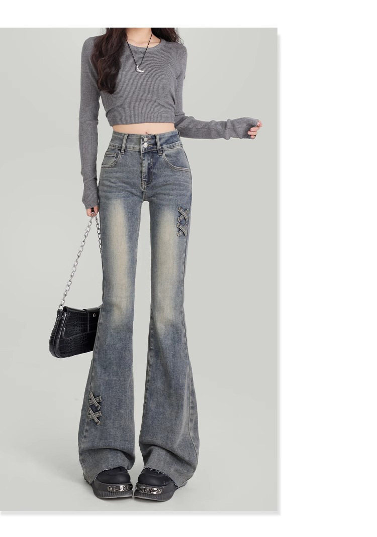2025년 봄 가을 여성을 위한 핫걸 블루 더블 버튼 마이크로 플레어 청바지 새로운 스타일의 리본 탄성 하이 웨이스트 슬림 플레어 바지