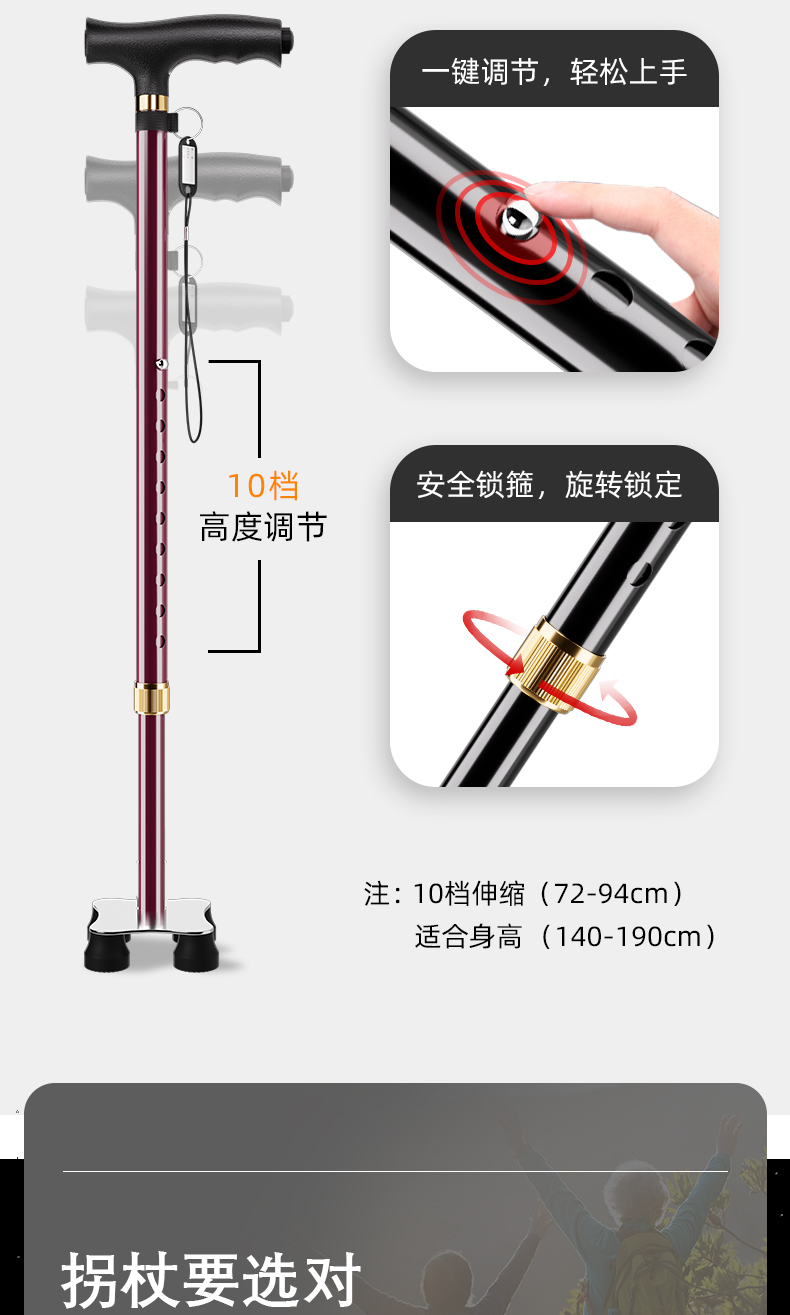 노인용 지팡이, 4개의 다리, 노인용 경량 미끄럼 방지 지팡이, 조명이 있는 다기능 지팡이, 지팡이, 보행 보조기, 지팡이 헤드
