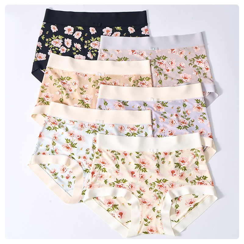여성을 위한 새로운 여름 얼음 실크 속옷, 중간 허리, 매우 부드럽고 피부 친화적이며 흔적이 없으며 통기성이 있고 꽃무늬 항균 속건성 팬티