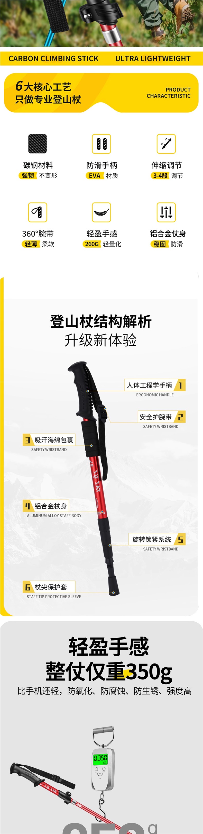 • 업그레이드된 4섹션 텔레스코픽 모델, 직선 핸들 레드 52-110cm(충격 흡수 시스템 내장).