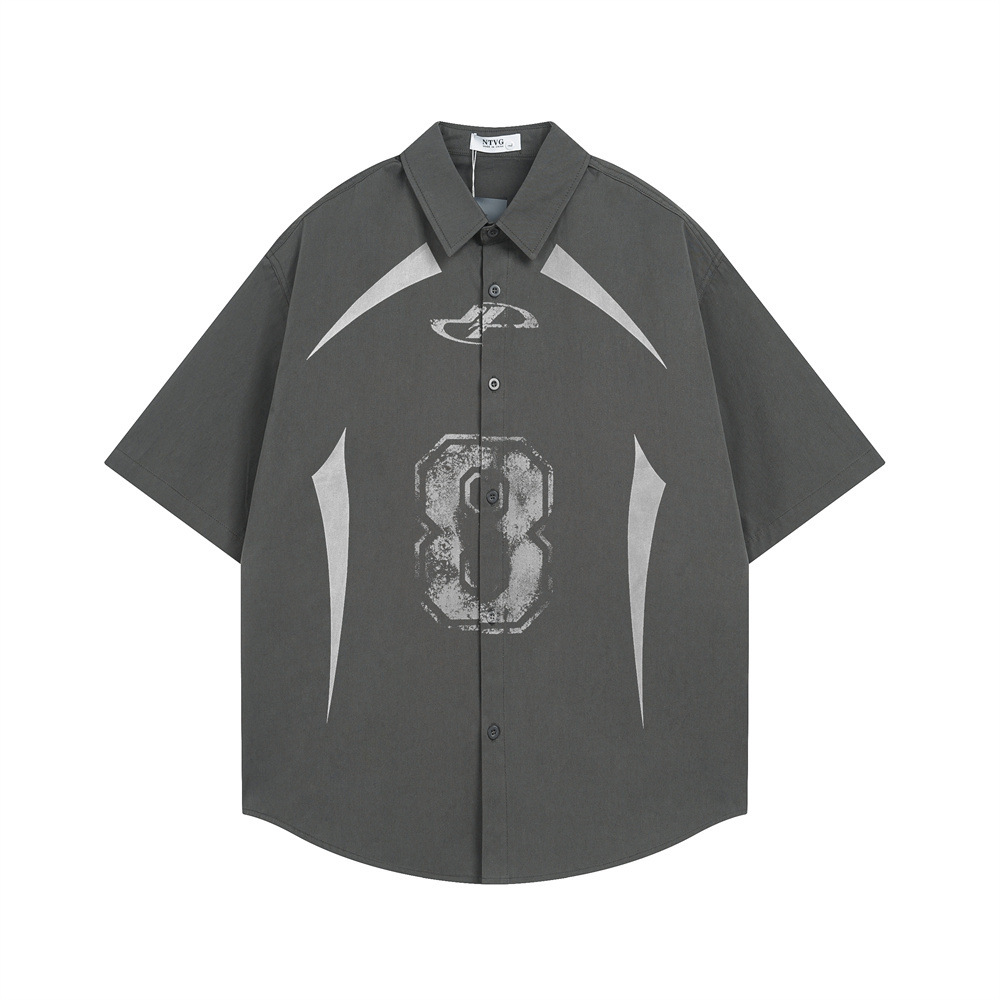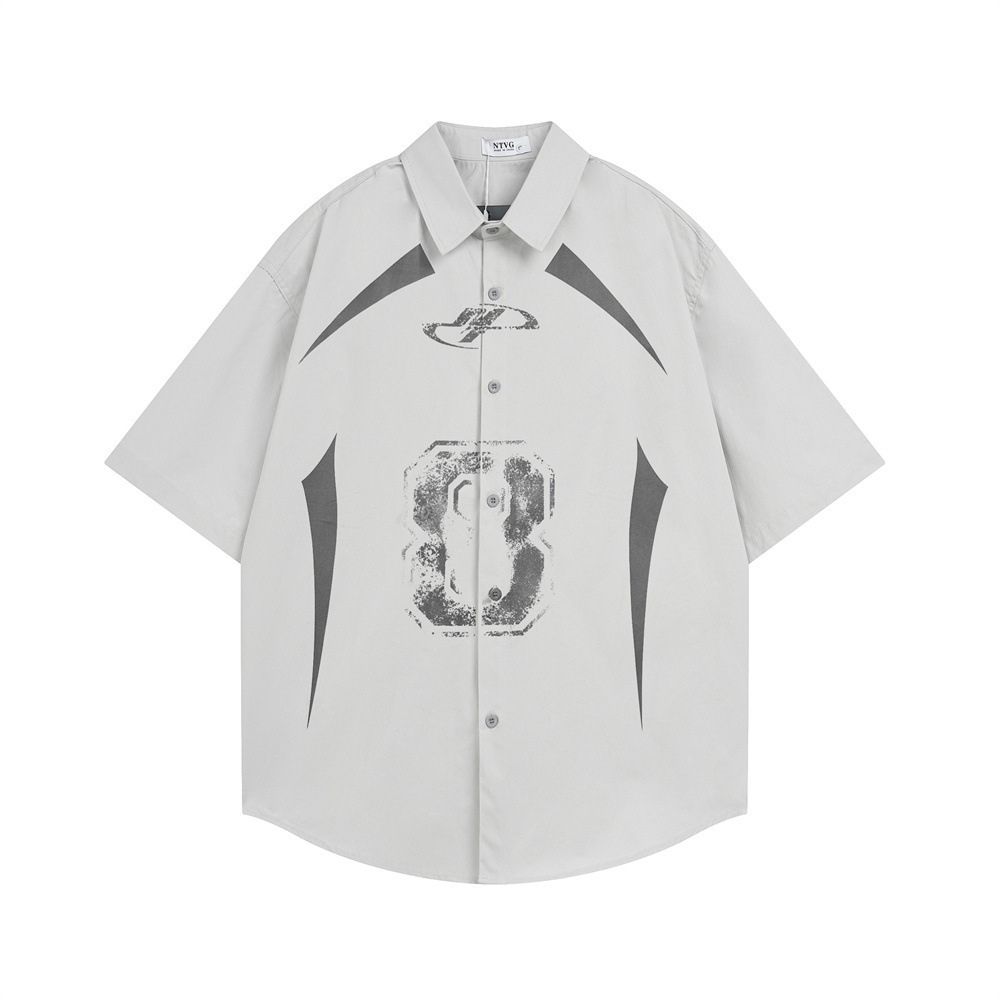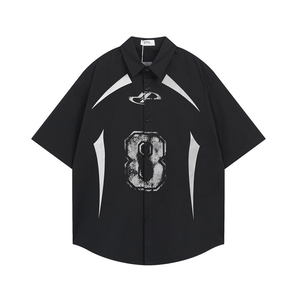 대비되는 컬러 프린트 디자인 반팔 셔츠 남성용 레이싱 스타일 캐주얼 여름 라펠 셔츠 루즈 스트리트 패션 아메리칸 스타일스토어 가기