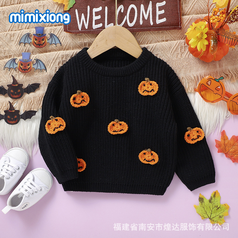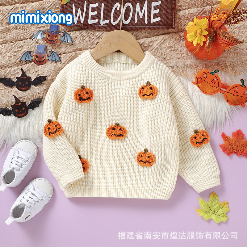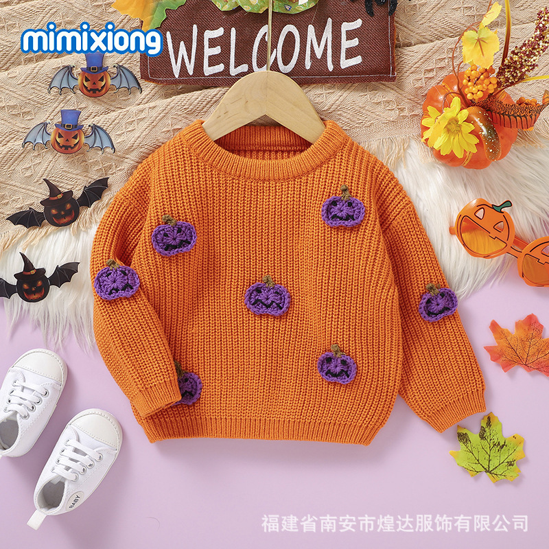 Ins 뜨거운 판매 가을, 겨울 새로운 스타일 유아 할로윈 입체 호박 패턴 니트 탑 남성과 여성 베이비 스웨터스토어 가기