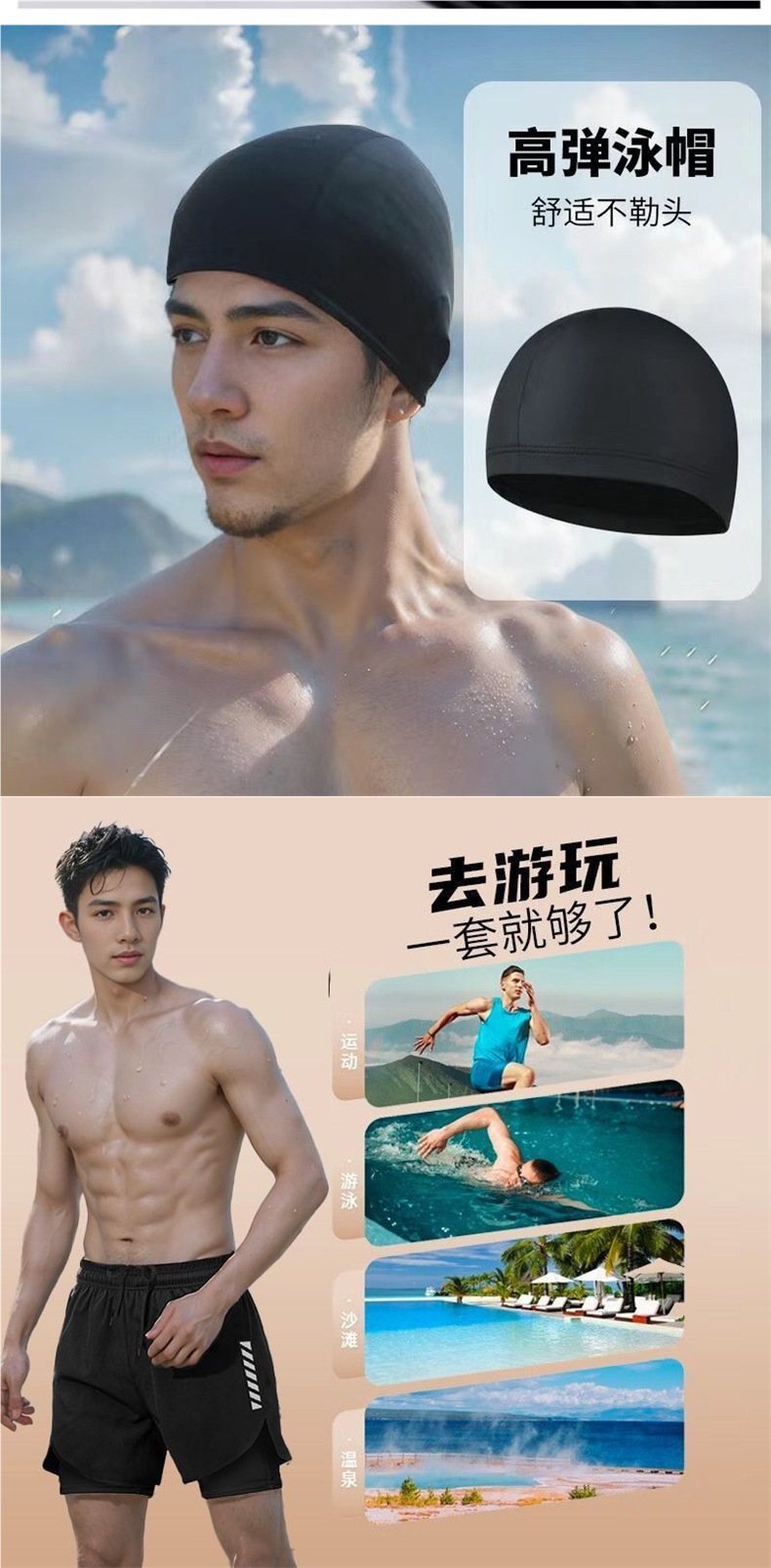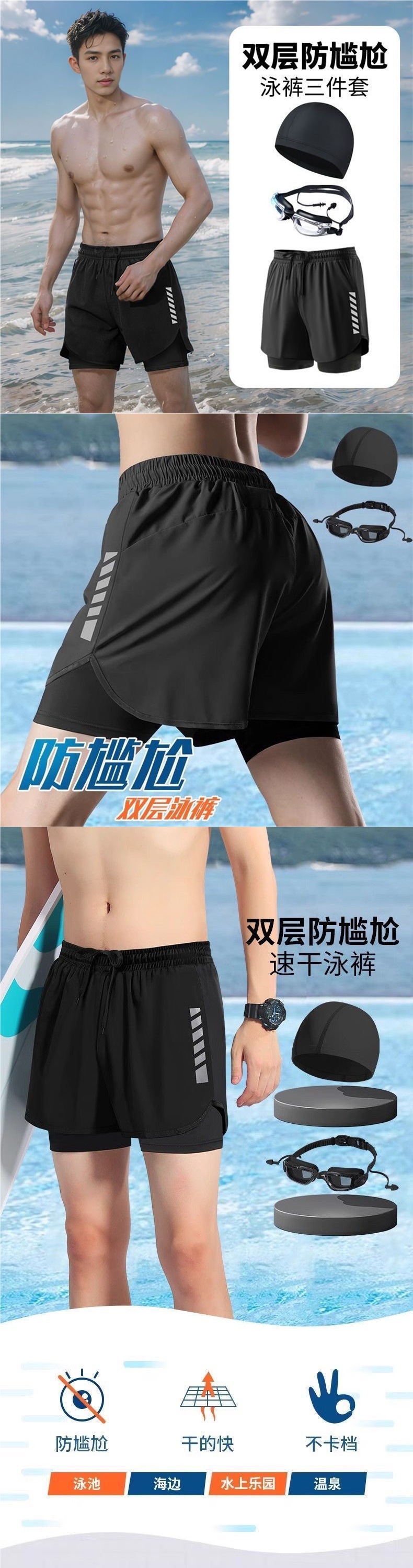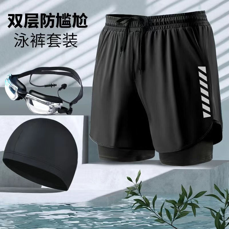 • A10 블랙 더블 레이어 수영 트렁크 [수영모 + 수영 고글 + 귀마개 및 코 클립 포함]