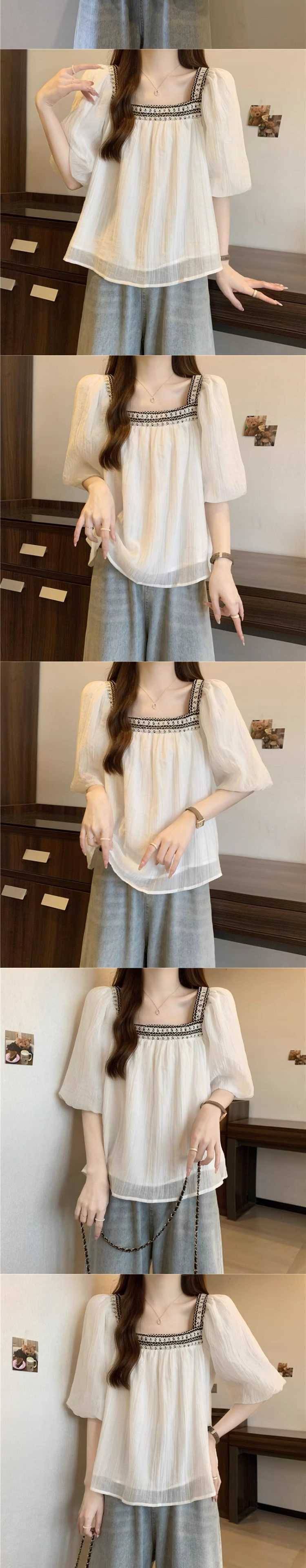 여성을 위한 새로운 중국 스타일의 느슨한 쉬폰 반팔 셔츠, 여름 디자인, 배를 덮고 슬리밍 탑, 인형 셔츠