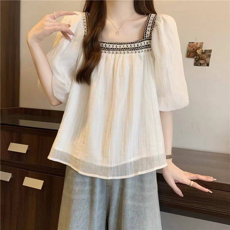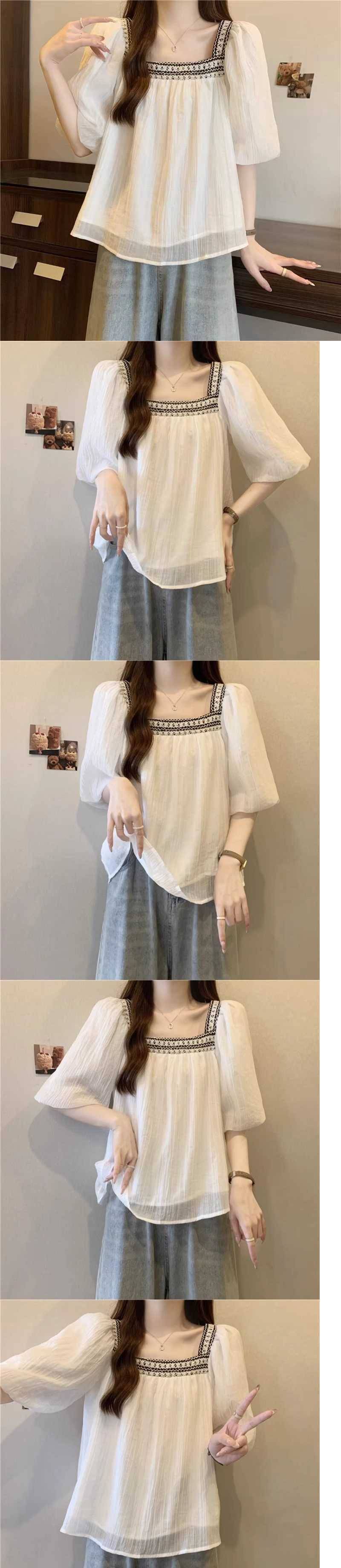 여성을 위한 새로운 중국 스타일의 느슨한 쉬폰 반팔 셔츠, 여름 디자인, 배를 덮고 슬리밍 탑, 인형 셔츠스토어 가기