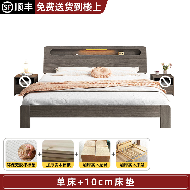• 원목 컬러 싱글 침대 + 10cm 매트리스 + 침대 옆 테이블 * 2 [위층 배송] 두껍고 환경 친화적