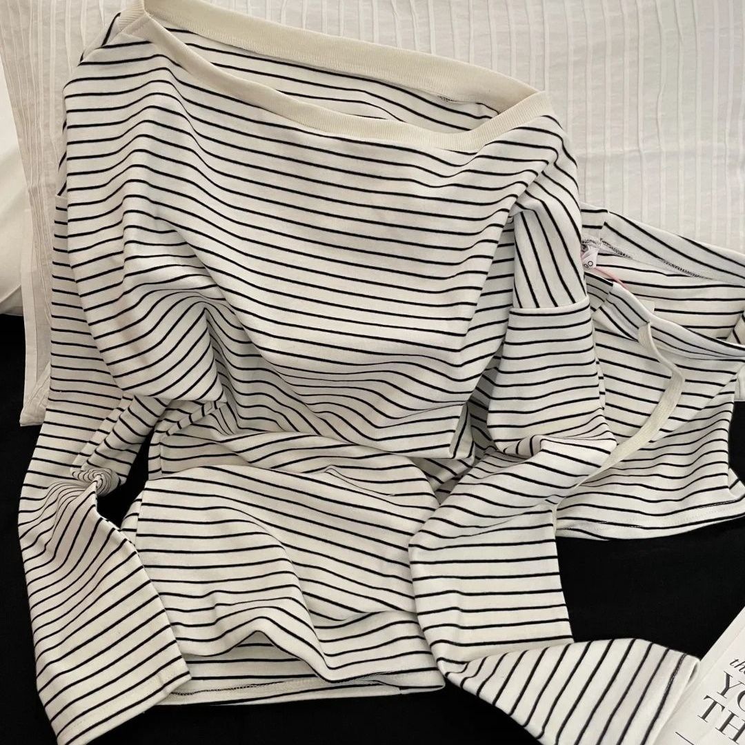 여성을위한 게으른 원 숄더 흑백 줄무늬 잠옷 봄 여름 새로운 긴팔 캐주얼 반팔 홈웨어 세트 외부에서 착용 가능스토어 가기