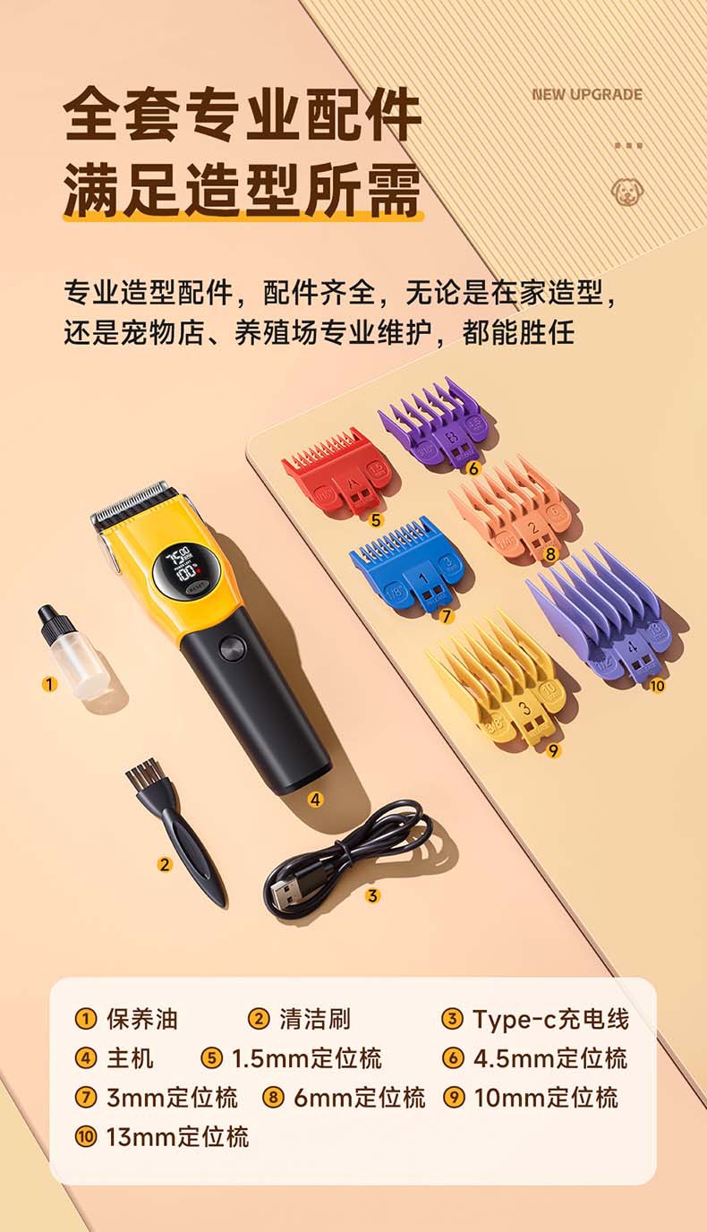 产品配件:包装盒、说明书、6个限位梳、Type-c充电线、1个润滑油、1个清洁刷
