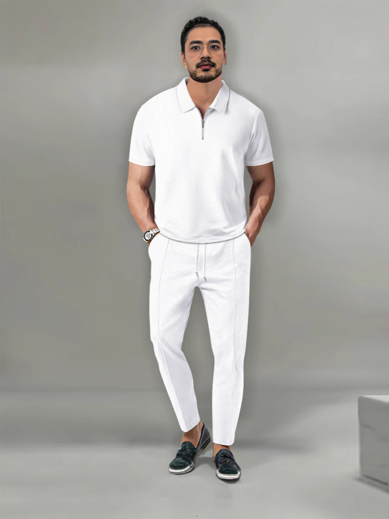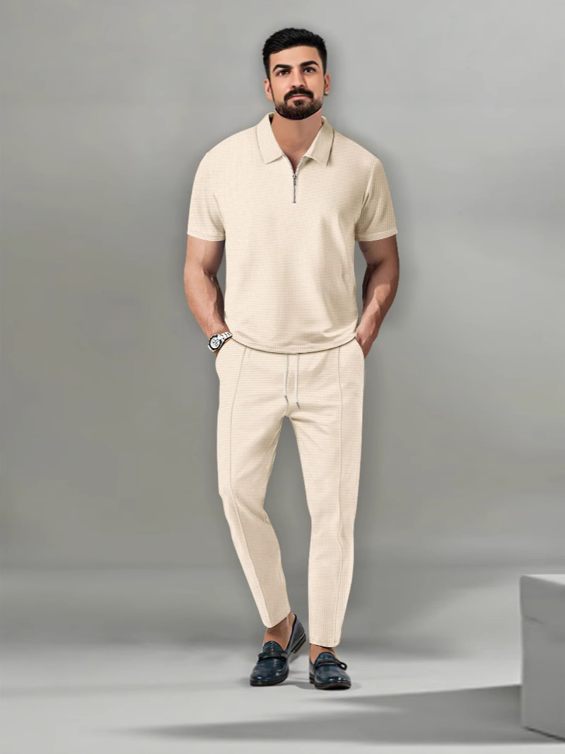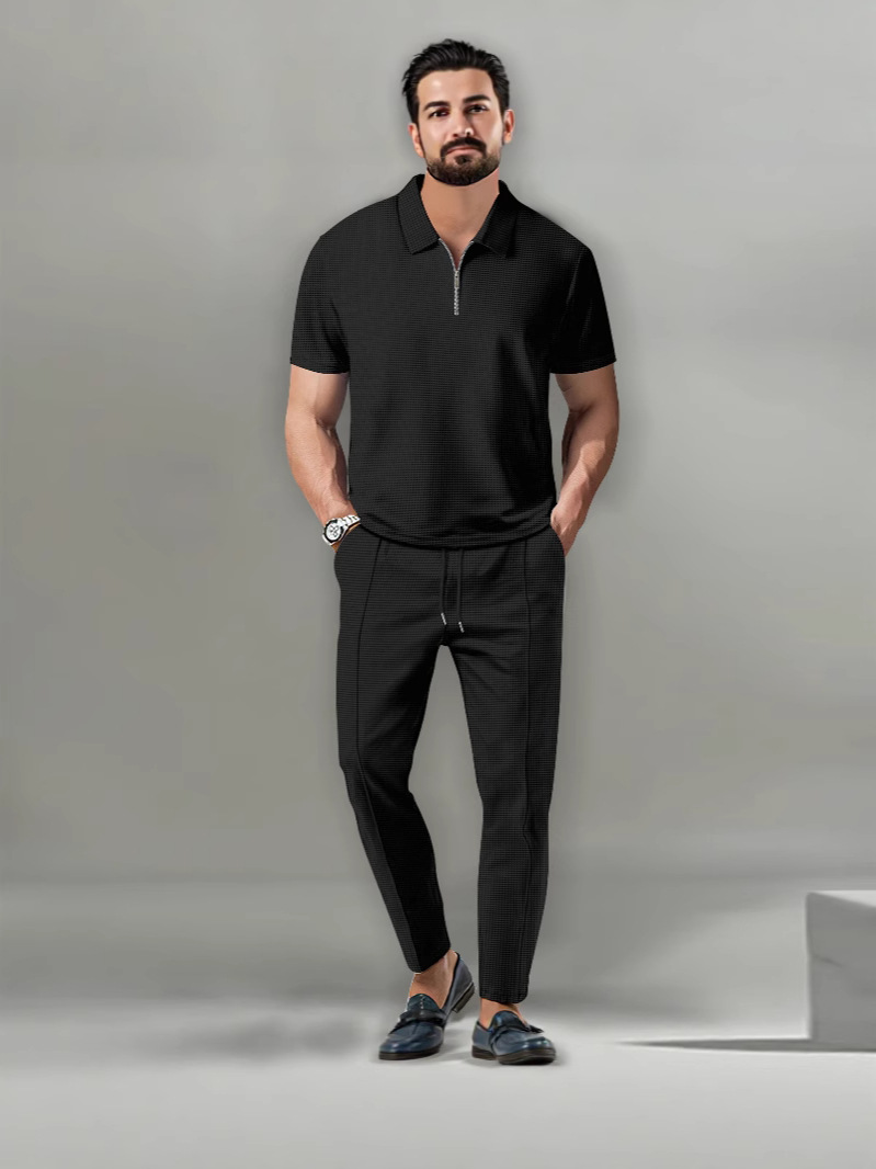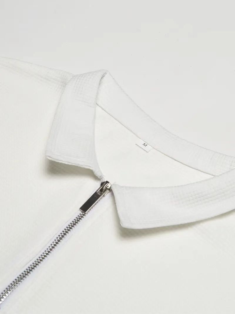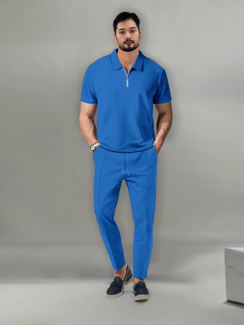 2025 새로운 여름 유럽과 미국의 대외 무역 남성 솔리드 컬러 정장 와플 옷깃 반팔 지퍼 바지 정장