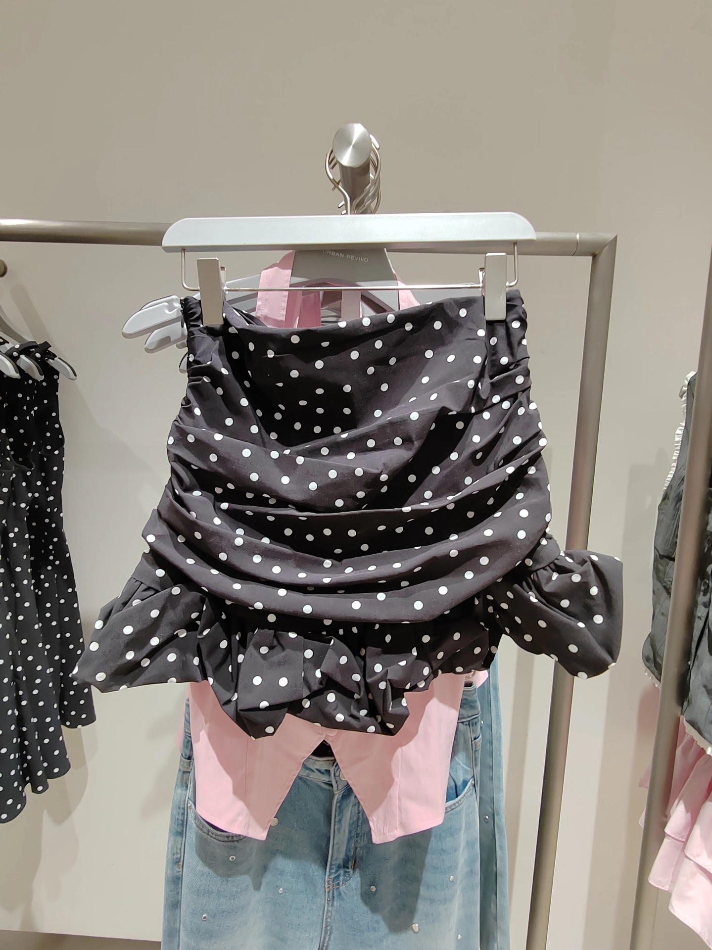 Xia Xin 여성 프렌치 스커트 우아한 블랙 폴카 도트 러플 플리츠 짧은 슬림 스커트스토어 가기