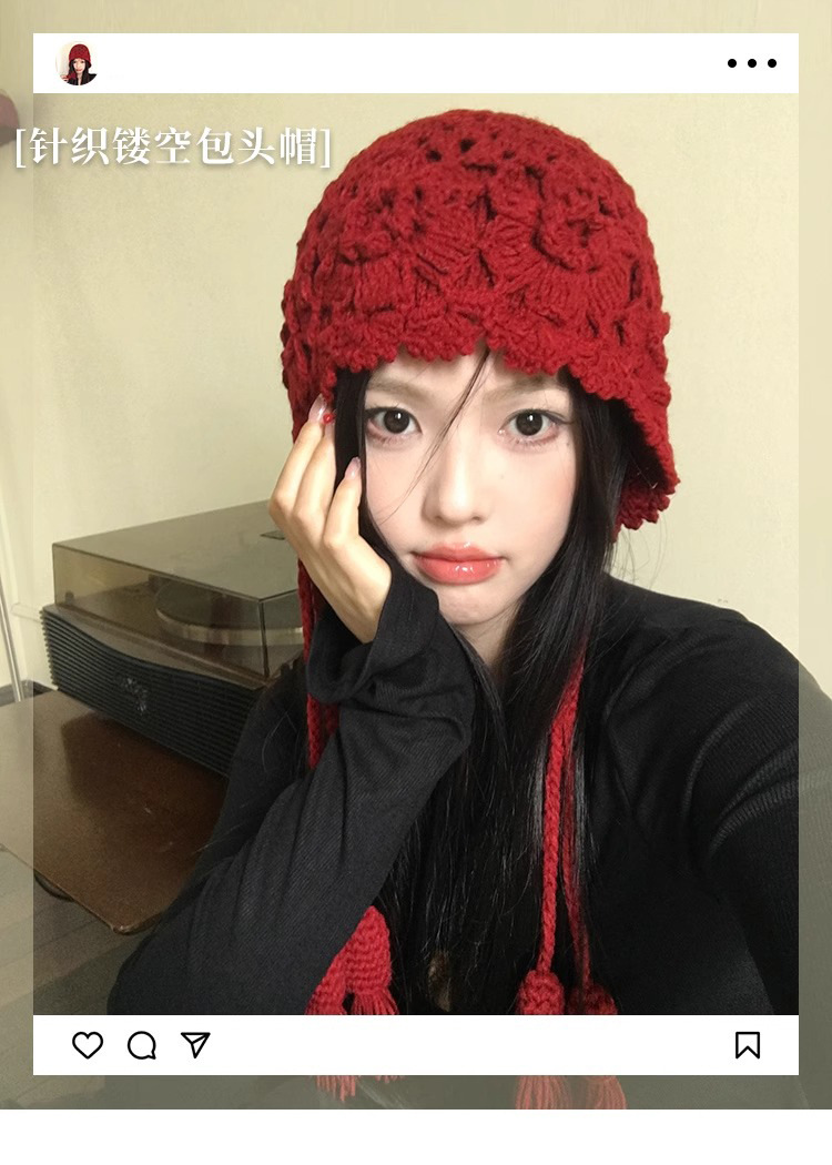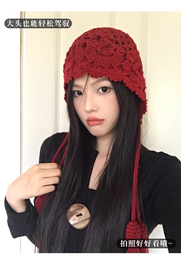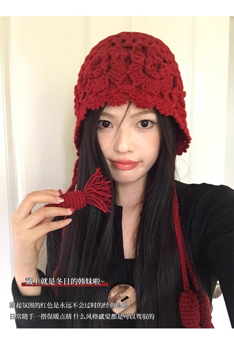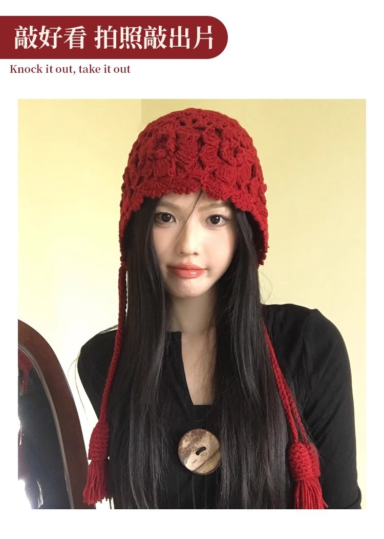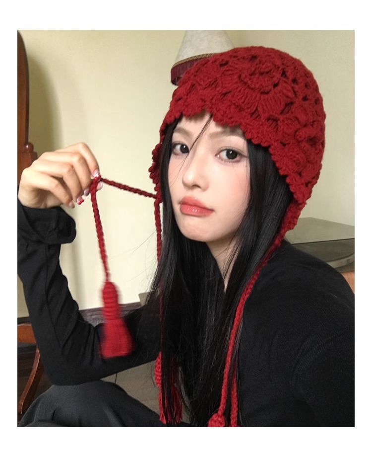 가을과 겨울 여성용 Sichuan West Tourist Flower Tassel Red Wool Hat 니트 Baotou Hat Ear Protection Small Pullover Hat