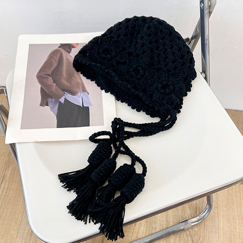 • M433-태슬 브레이드 자카드 니트 모자 블랙