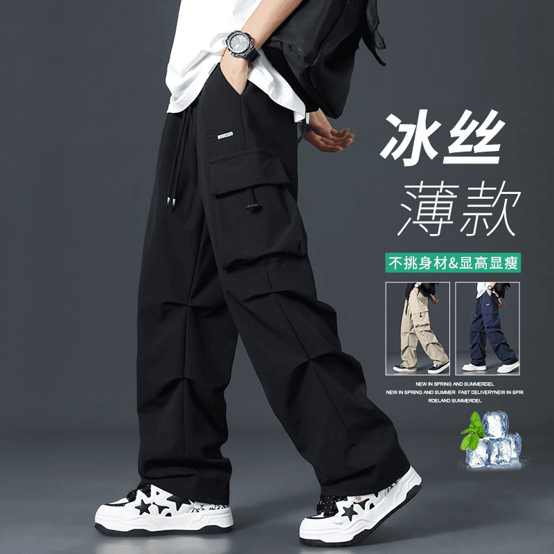 아이스 실크 파라트로퍼 바지 남성 여름 얇은 루즈 스트레이트 남성 바지 대형 캐주얼 긴 바지 남성스토어 가기