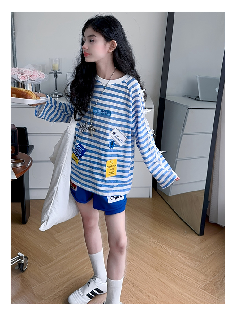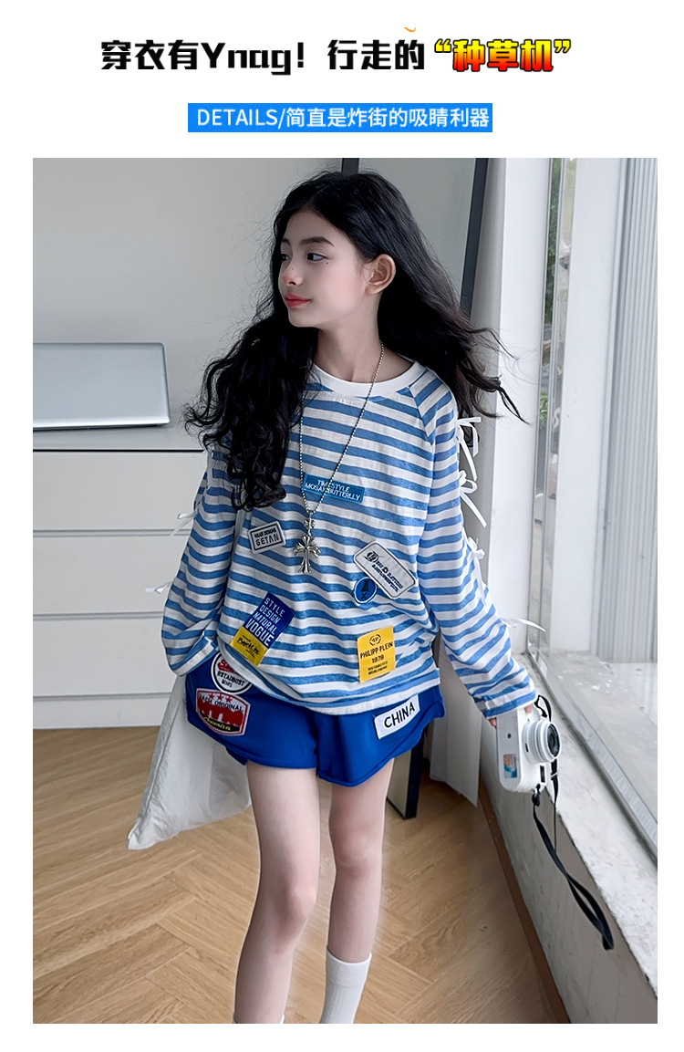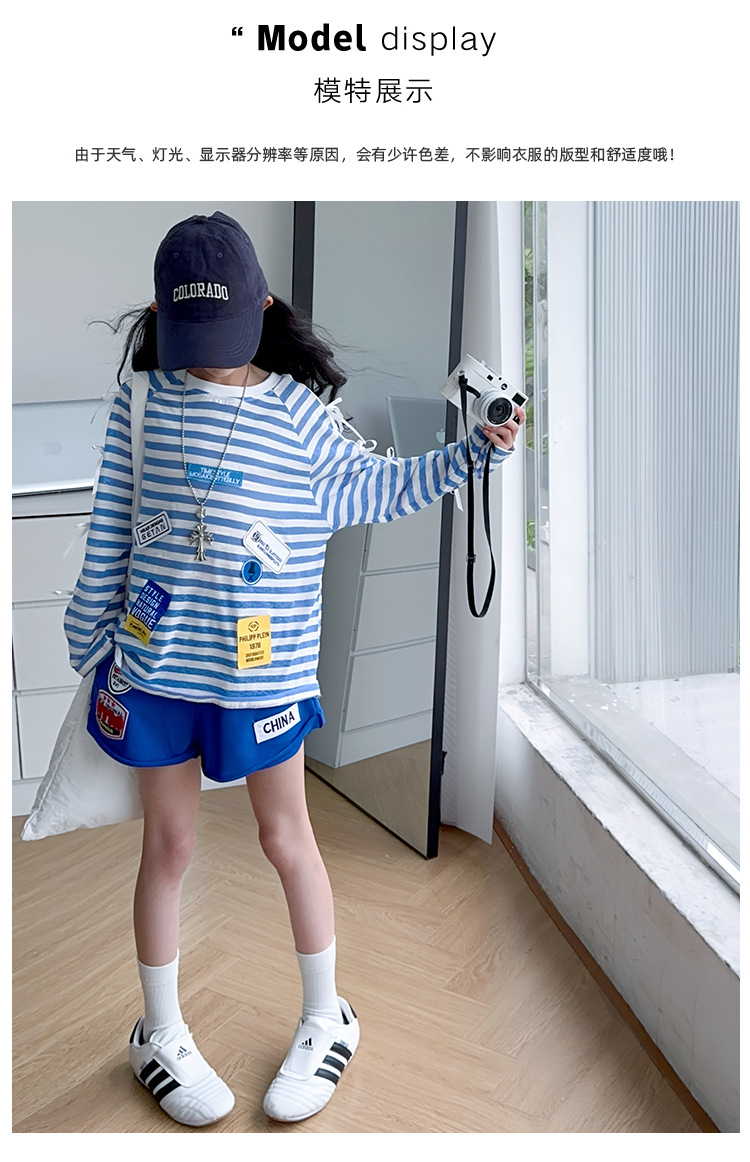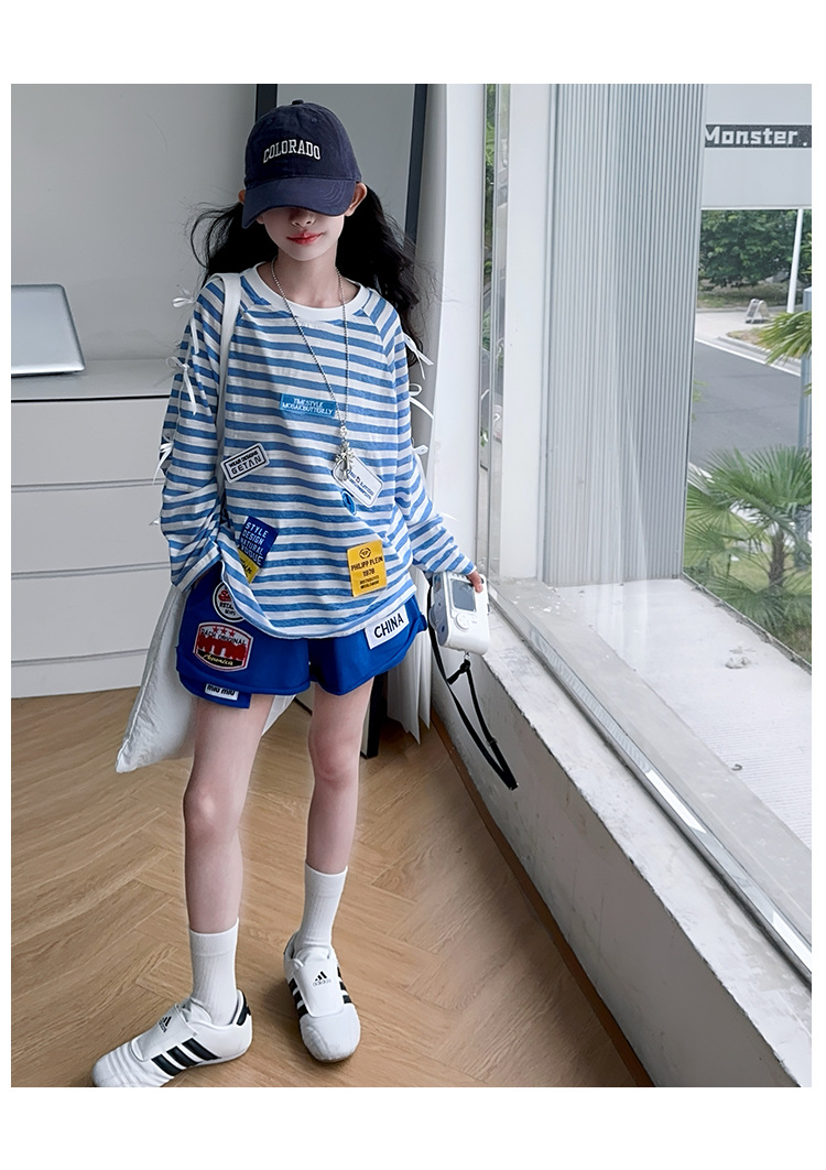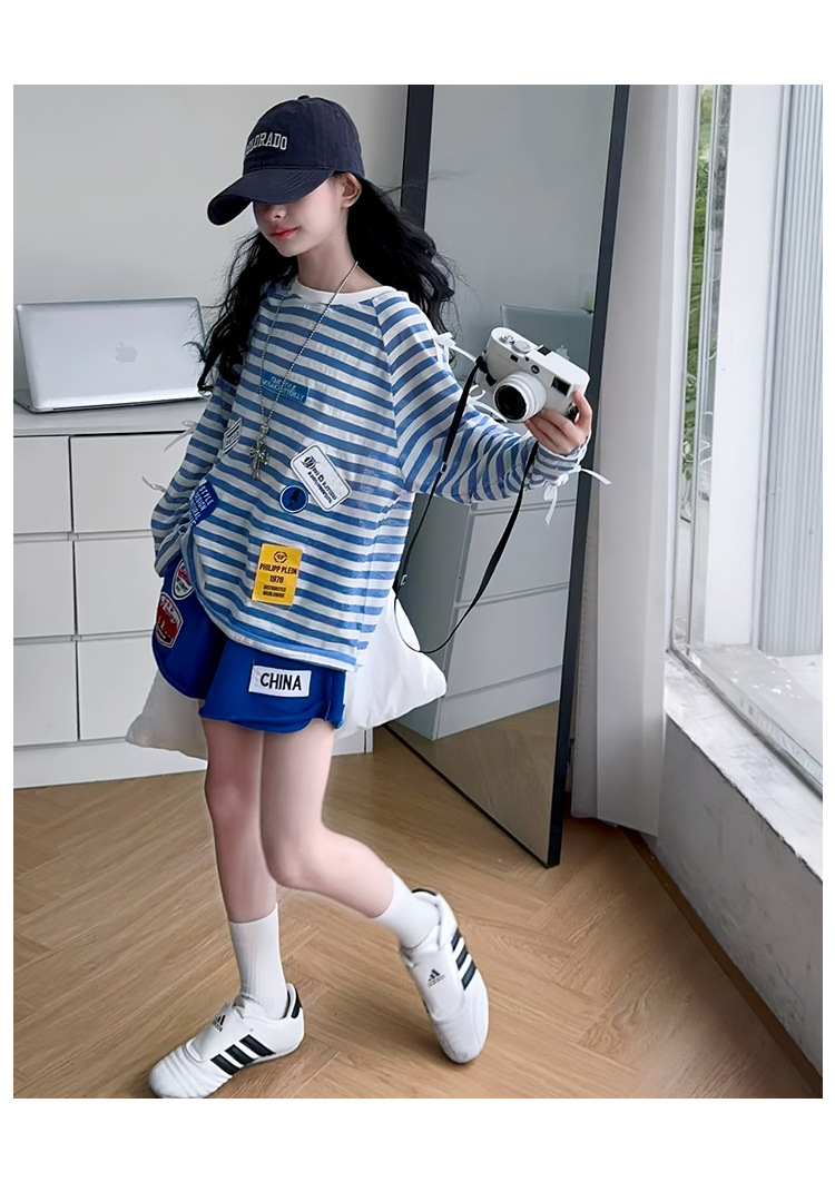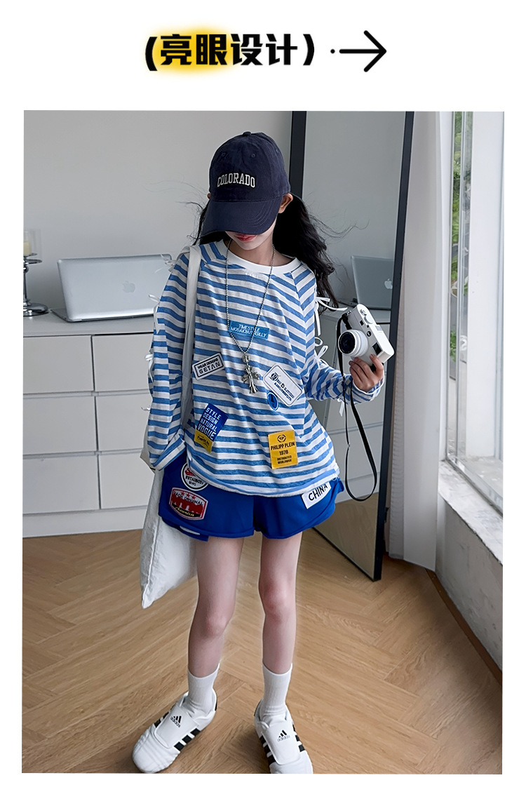 아동복 여아 정장 여름 얇은 2025 새로운 중대형 아동 줄무늬 긴팔 자외선 차단 의류 반바지 투피스 세트스토어 가기