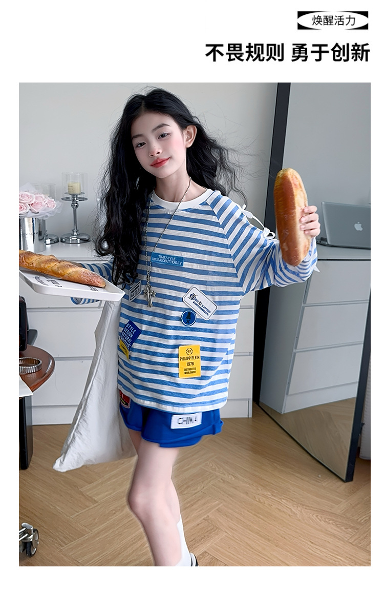 아동복 여아 정장 여름 얇은 2025 새로운 중대형 아동 줄무늬 긴팔 자외선 차단 의류 반바지 투피스 세트