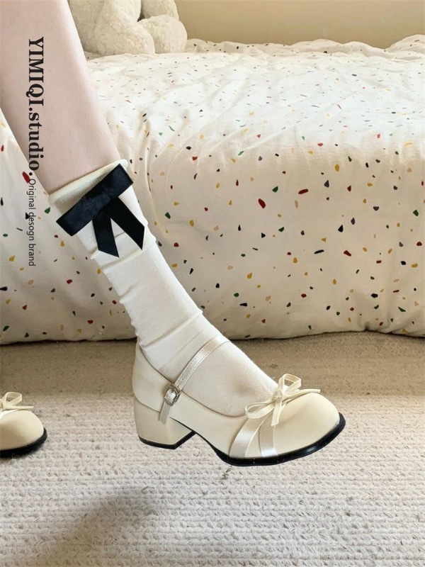 여성을위한 프렌치 두꺼운 굽 메리 제인 신발 2025 새로운 봄, 여름 다목적 보우 펌프 신발 대학 스타일 작은 가죽 신발
