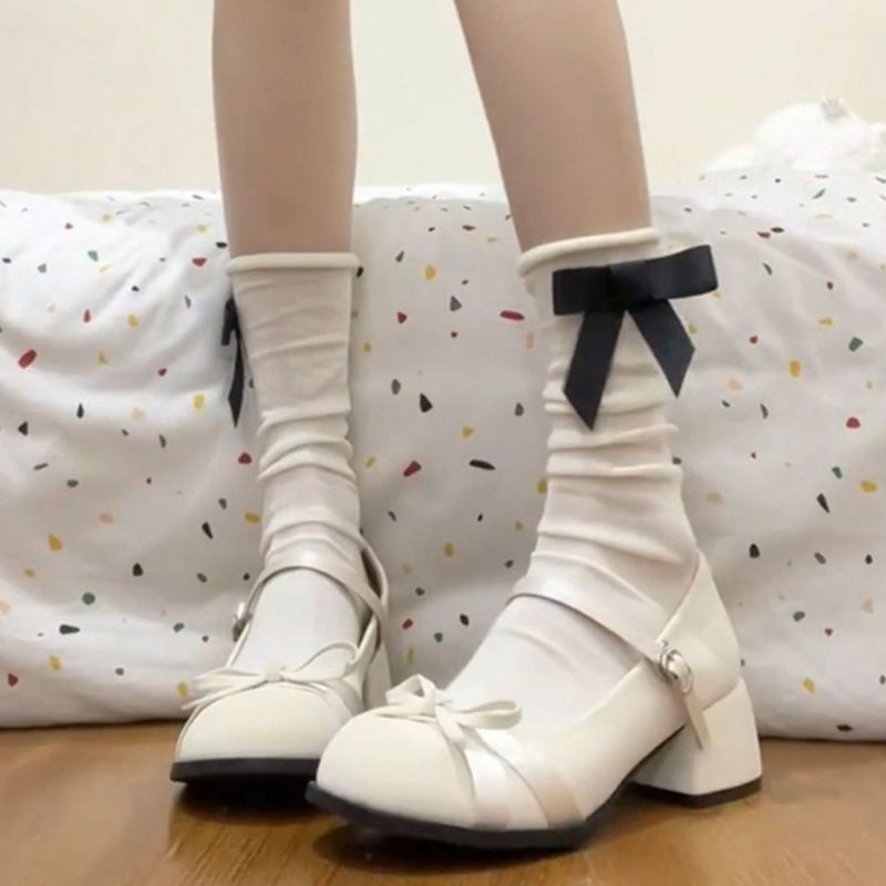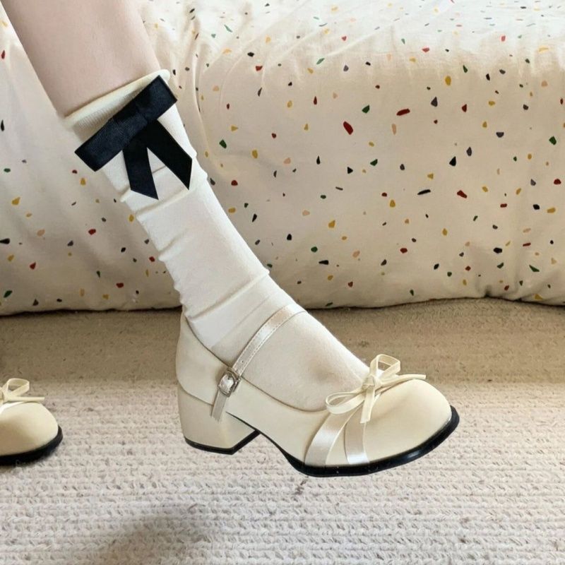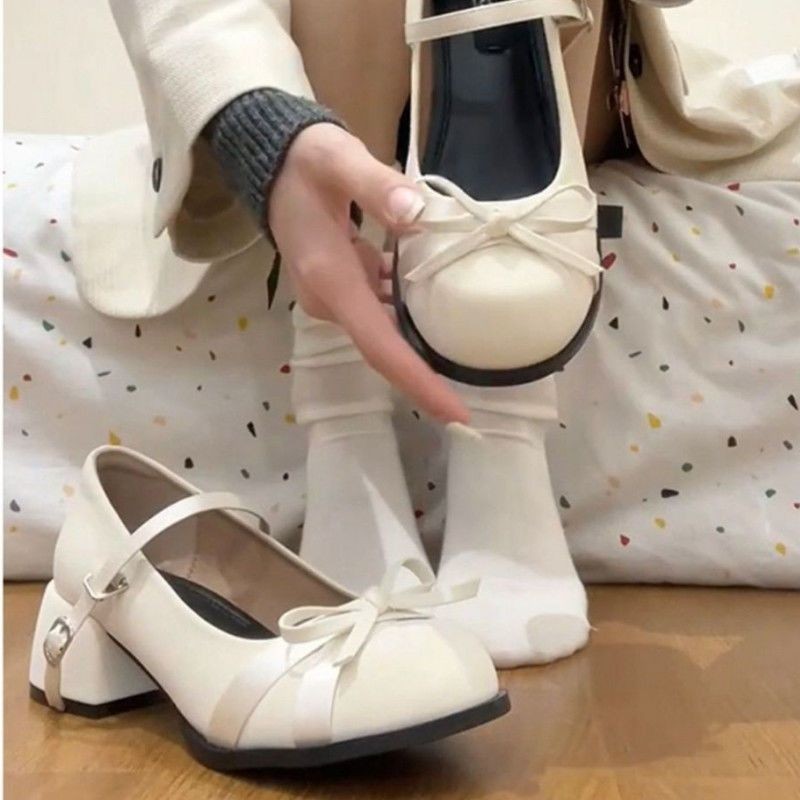 여성을위한 프렌치 두꺼운 굽 메리 제인 신발 2025 새로운 봄, 여름 다목적 보우 펌프 신발 대학 스타일 작은 가죽 신발스토어 가기