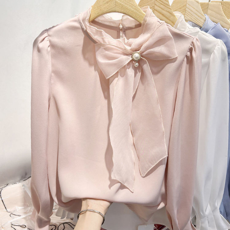 2025 봄 새로운 한국 스타일 솔리드 컬러 스탠드 칼라 레이스 업 구슬 풀오버 여성용 긴팔 쉬폰 셔츠