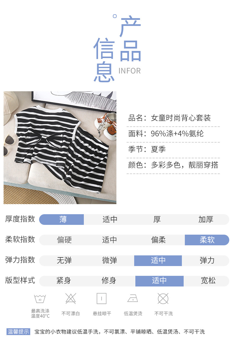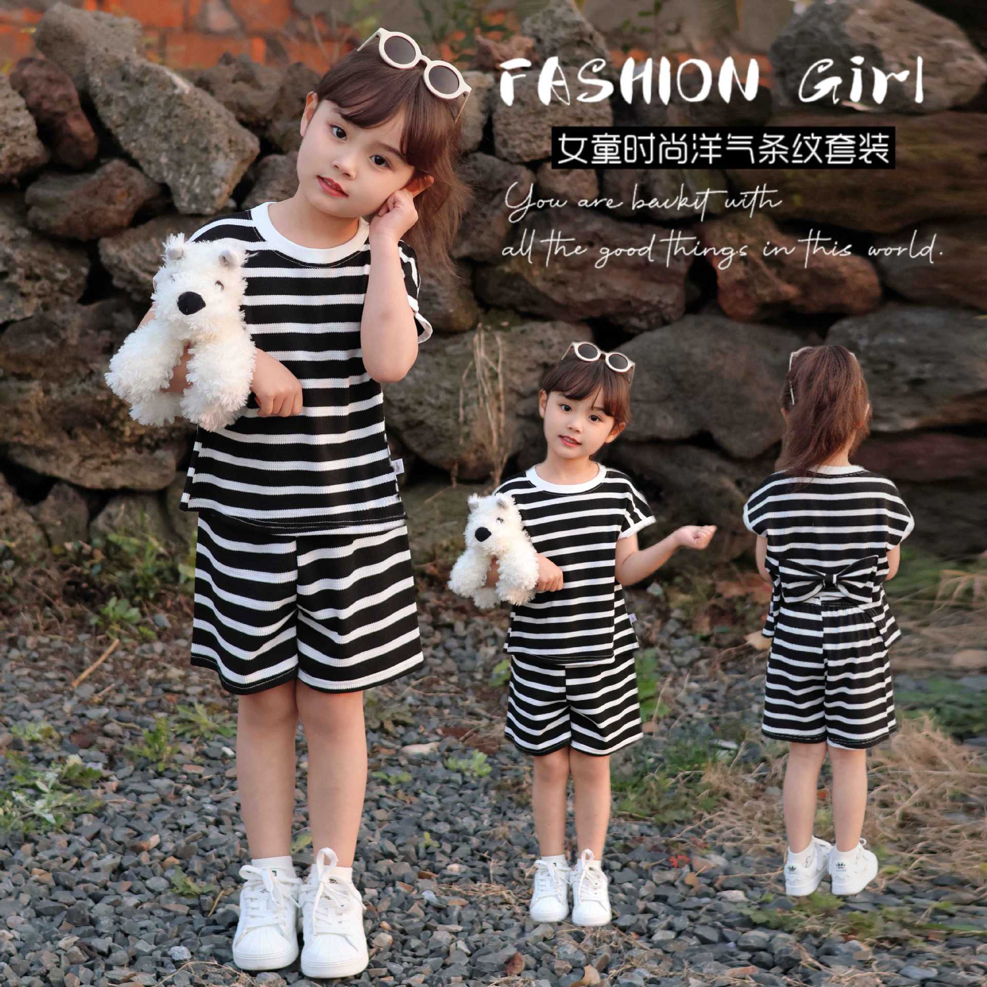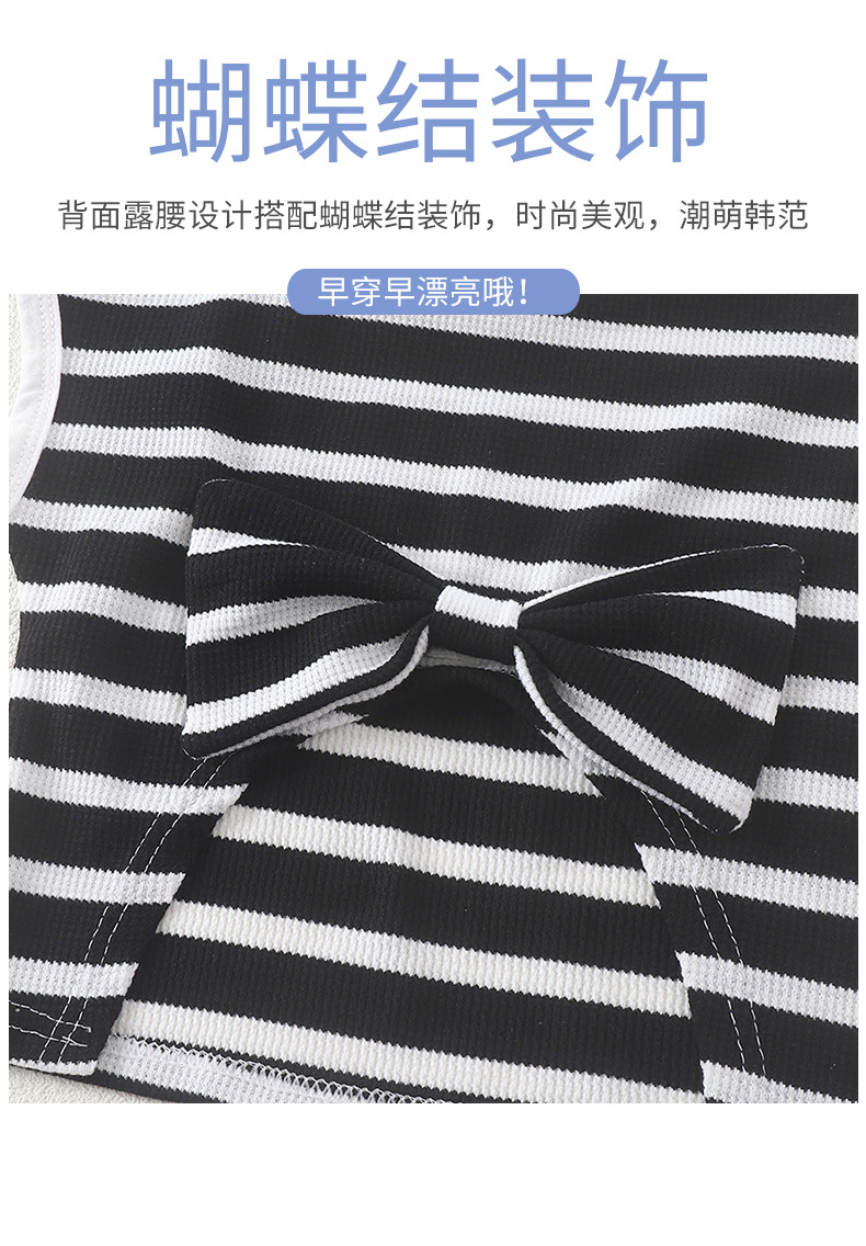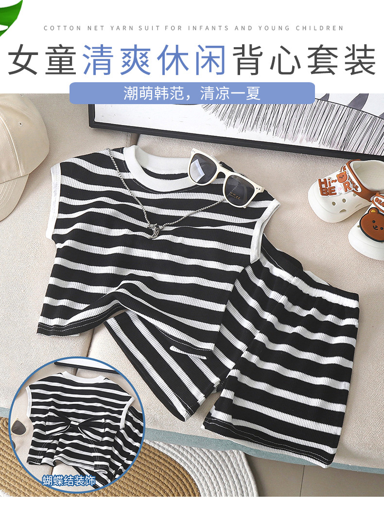 여름 2024 여름 패션을위한 여아용 보우 반팔 양복 새로운 스타일 스트라이프 민소매 조끼 투피스 세트 여름 패션스토어 가기