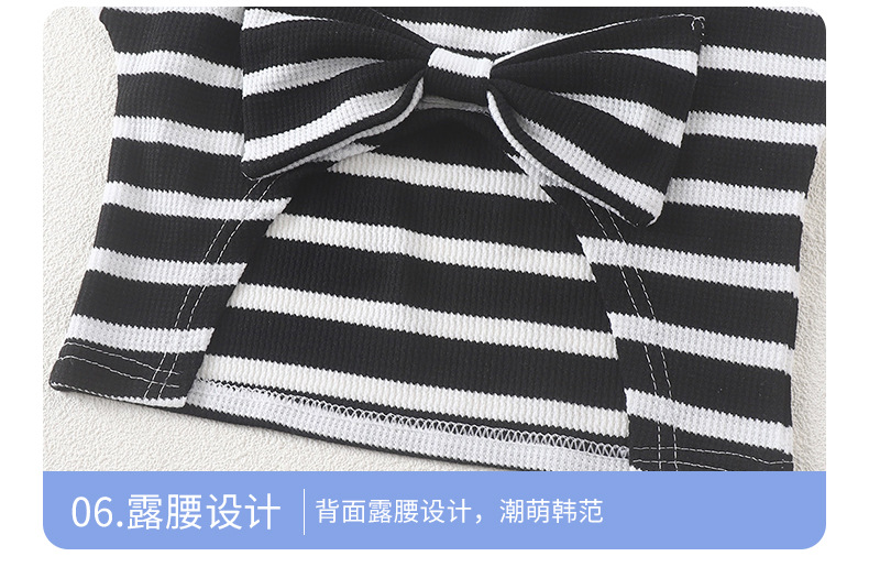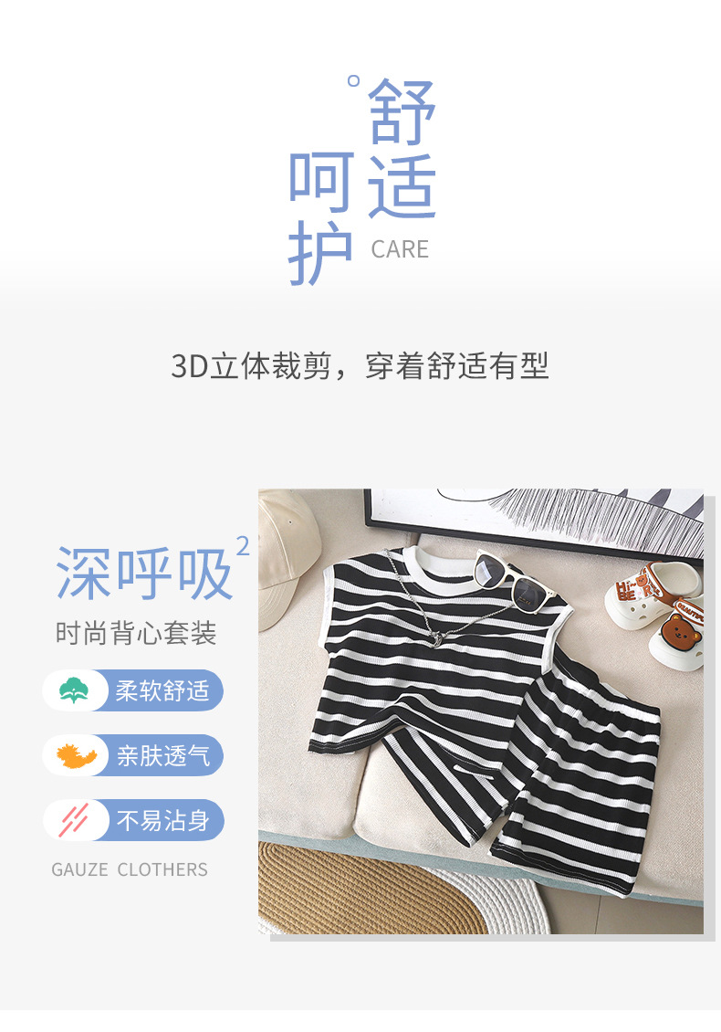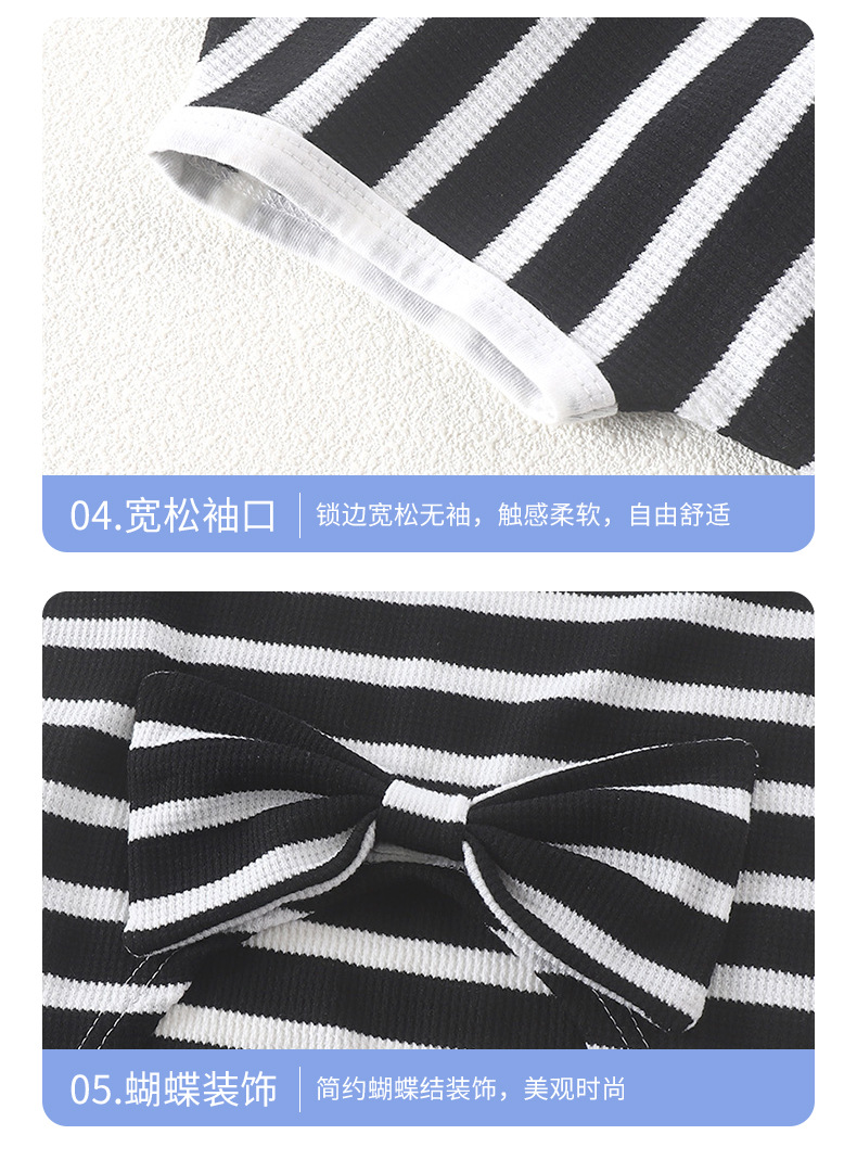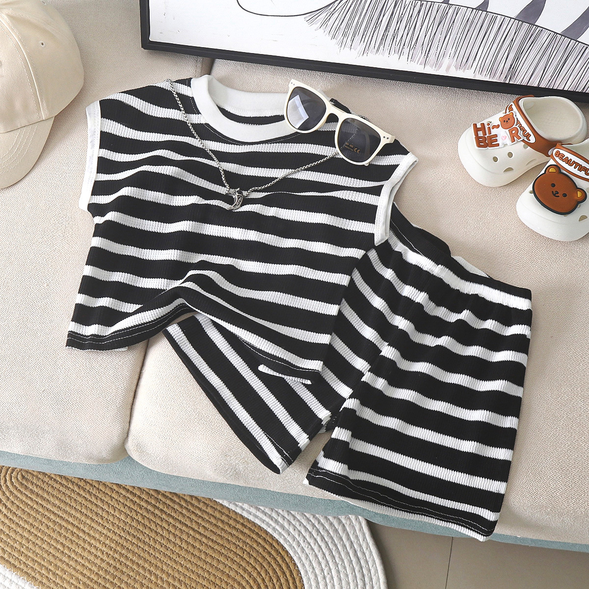 여름 2024 여름 패션을위한 여아용 보우 반팔 양복 새로운 스타일 스트라이프 민소매 조끼 투피스 세트 여름 패션스토어 가기