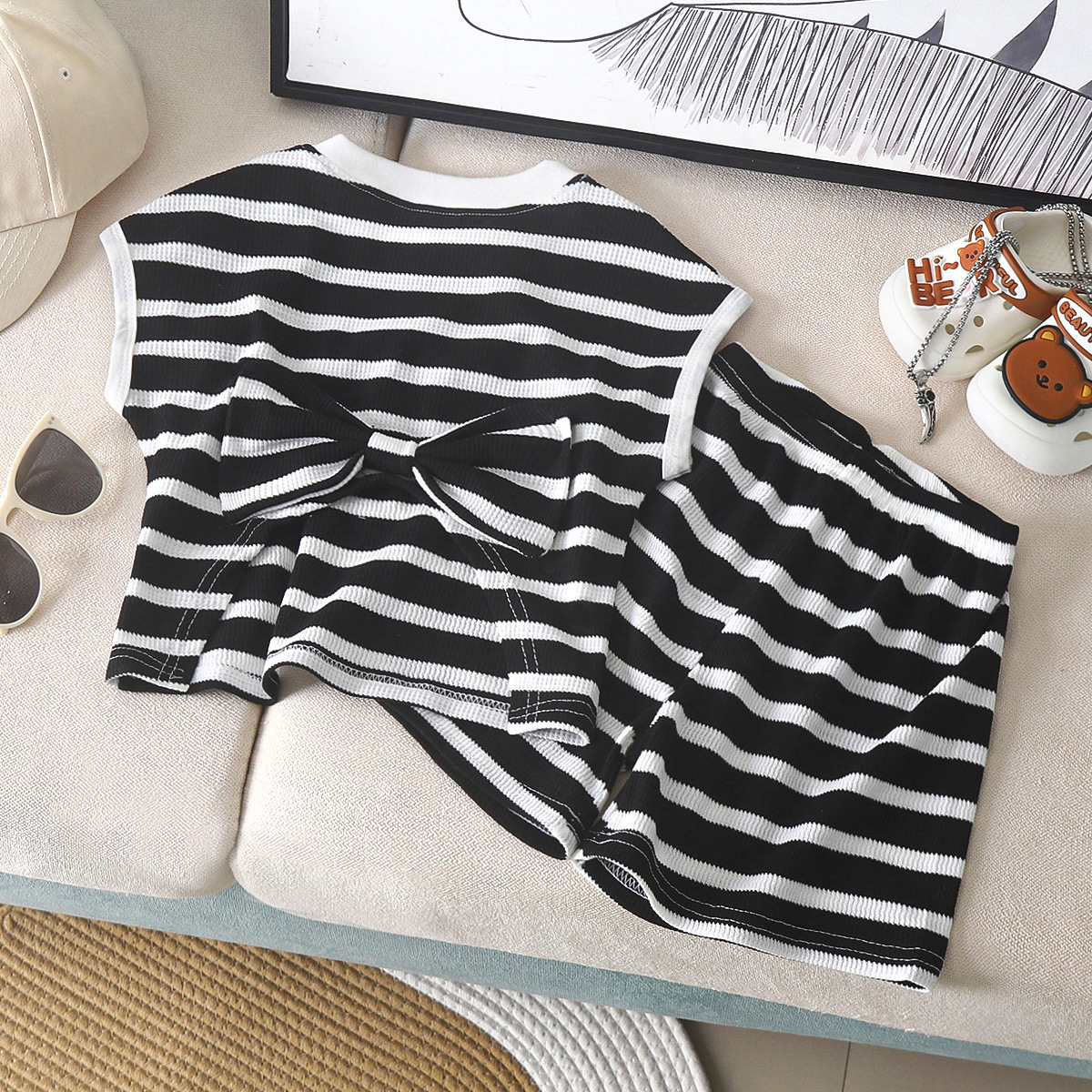 여름 2024 여름 패션을위한 여아용 보우 반팔 양복 새로운 스타일 스트라이프 민소매 조끼 투피스 세트 여름 패션